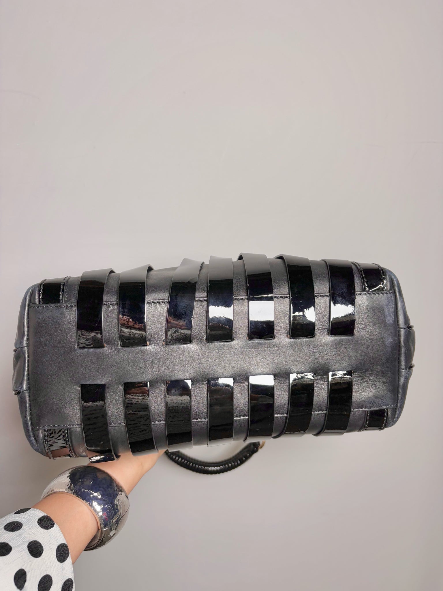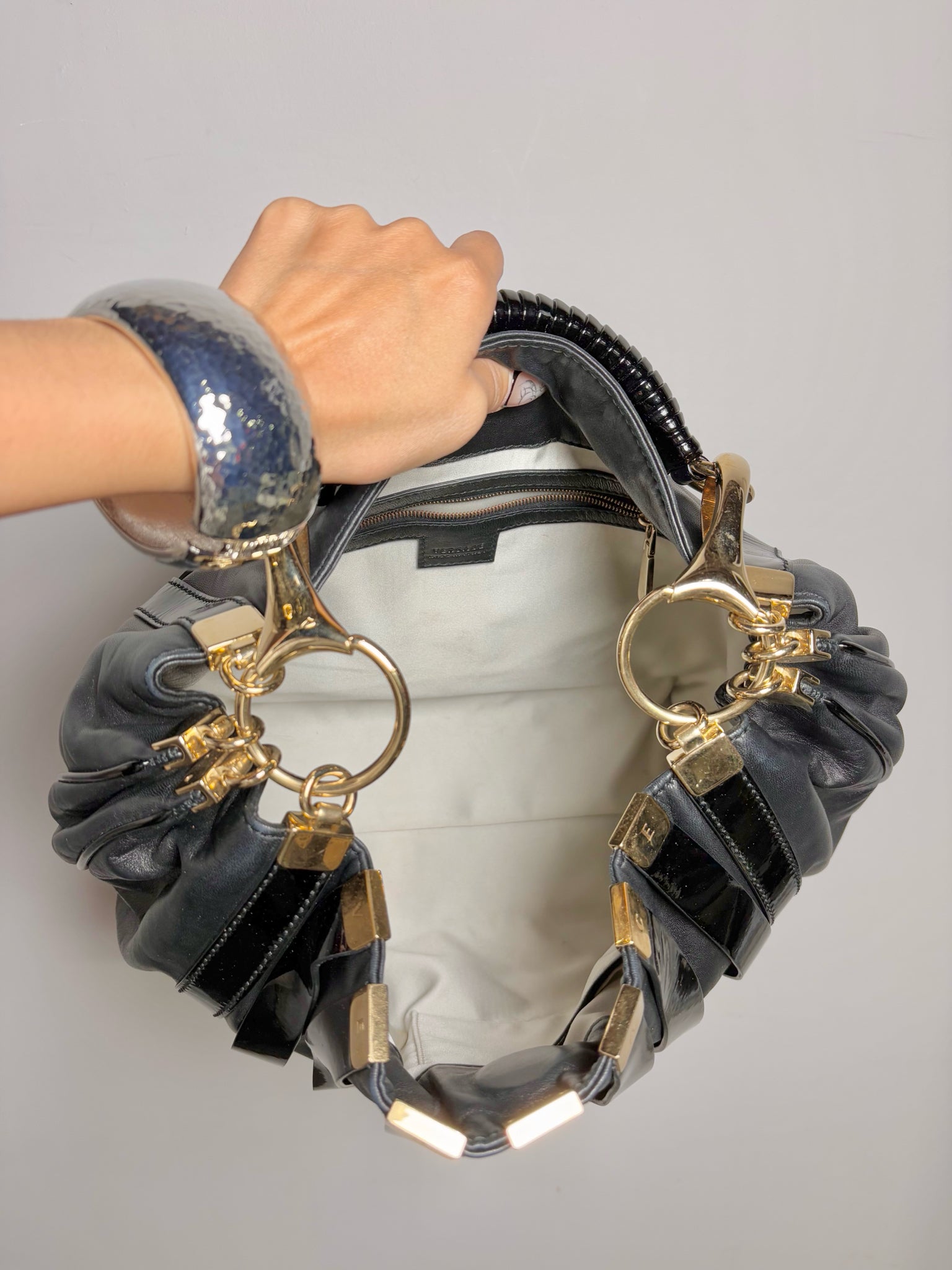 A rare Versace collector’s piece, this large black leather hobo bag commands attention with its dramatic striped design, each panel boldly spelling out VERSACE in gold-tone hardware. The removable patent leather handle adds styling versatility, while a magnetic top closure, back snap pocket, and interior zipper pocket keep your essentials secure. A striking, hard-to-find statement bag for the true Versace devotee.