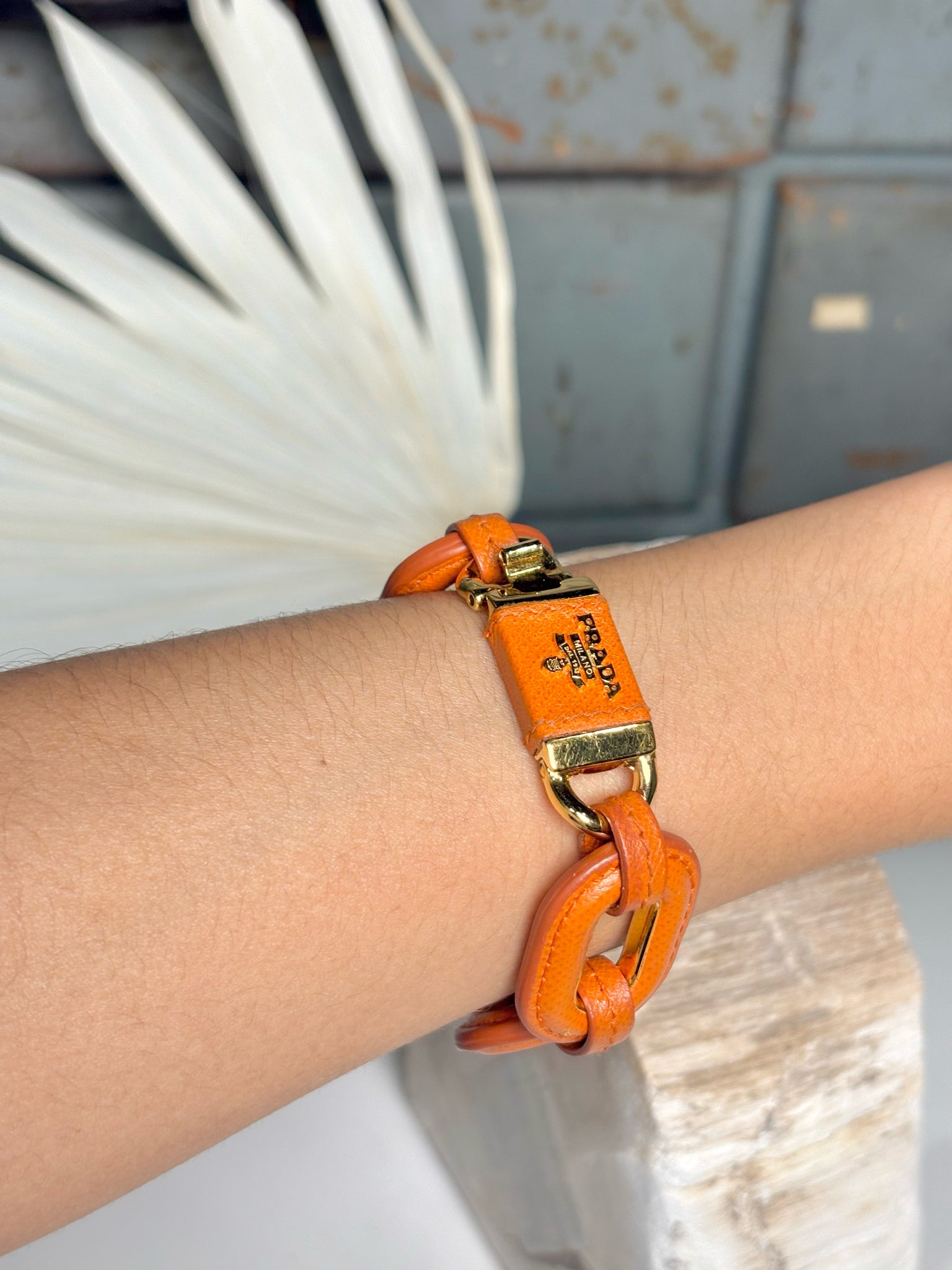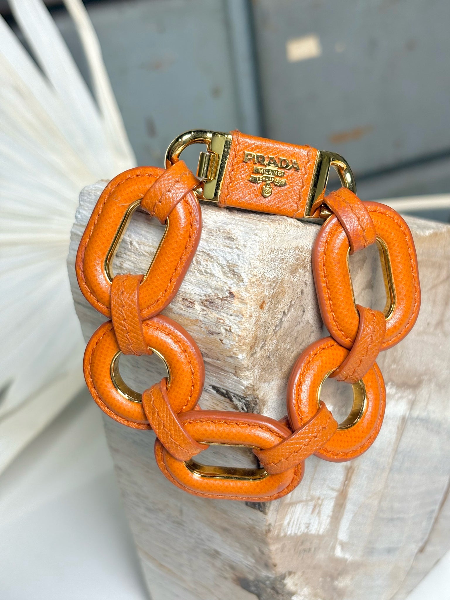 Prada Leather Chain Links Orange Bracelet