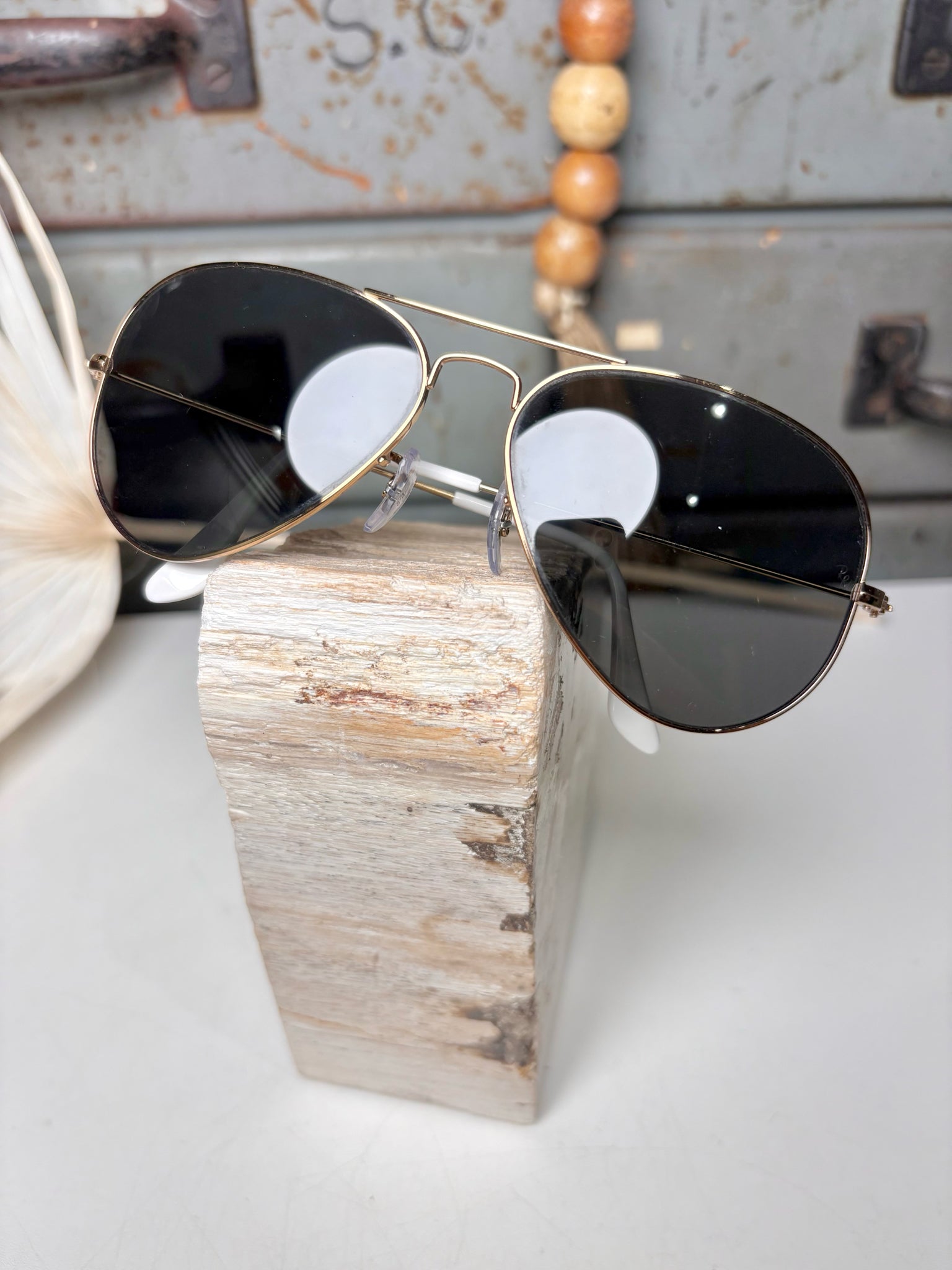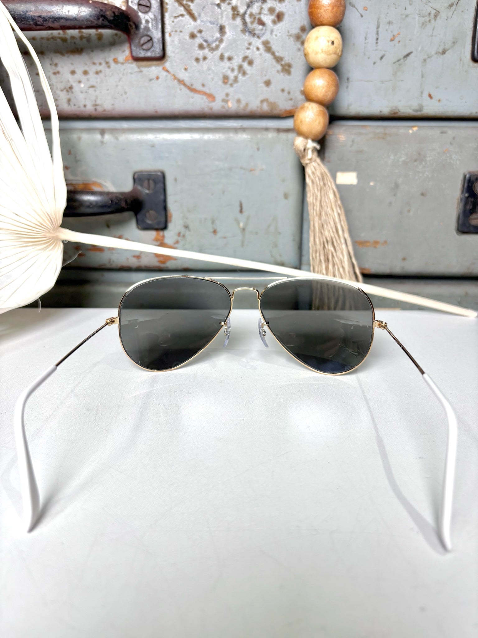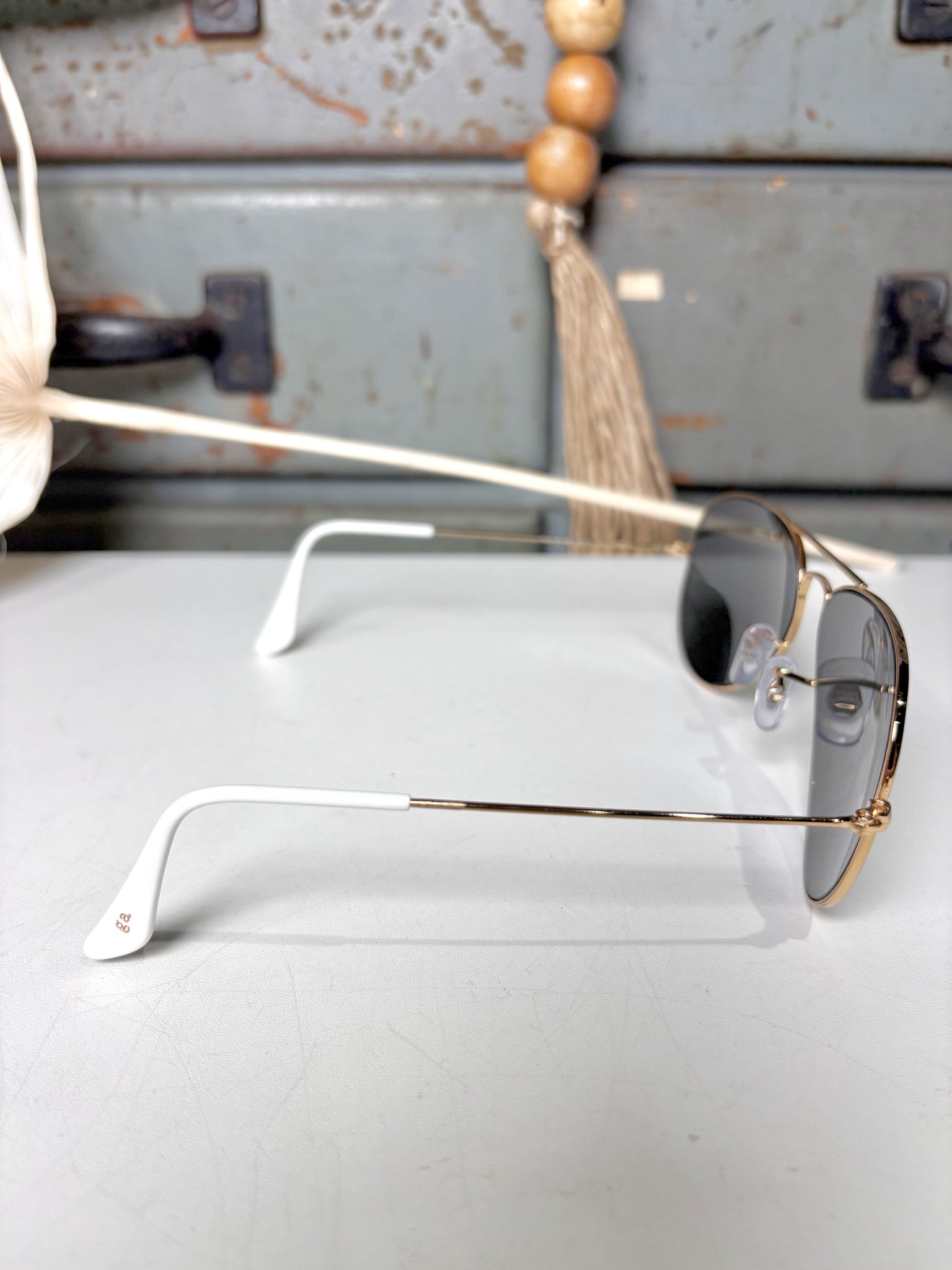 Ray Ban gold frame aviator large metal and dark lense sunglasses with white accents. Model #58014