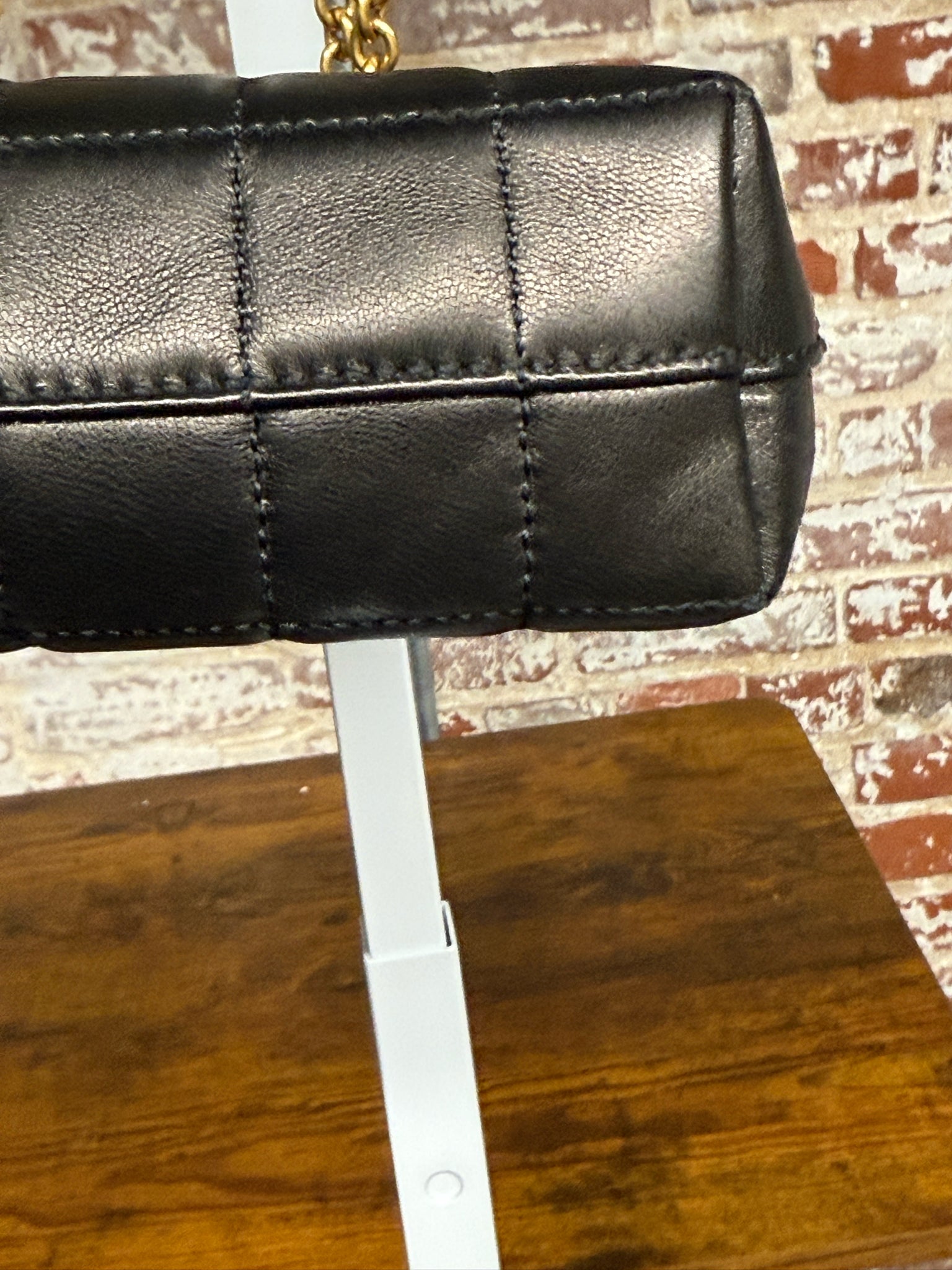 This Saint Laurent mini tote is ideal for shoppers looking for a luxury black designer handbag, a current-season YSL mini tote, or a New With Tags Saint Laurent piece at a strong resale value. Its chic size, box-quilted design, and gold chain straps make it a timeless classic.