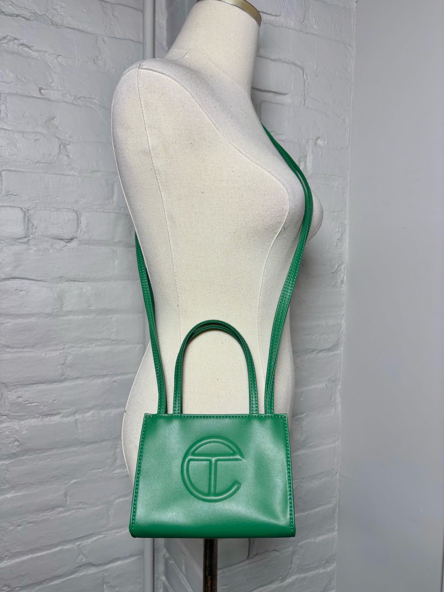 Telfar faux leather embossed logo "Small Shopping Bag" in the color Sage. It has a double strap, handle and a magnetic closure. Comes with the original dust bag.