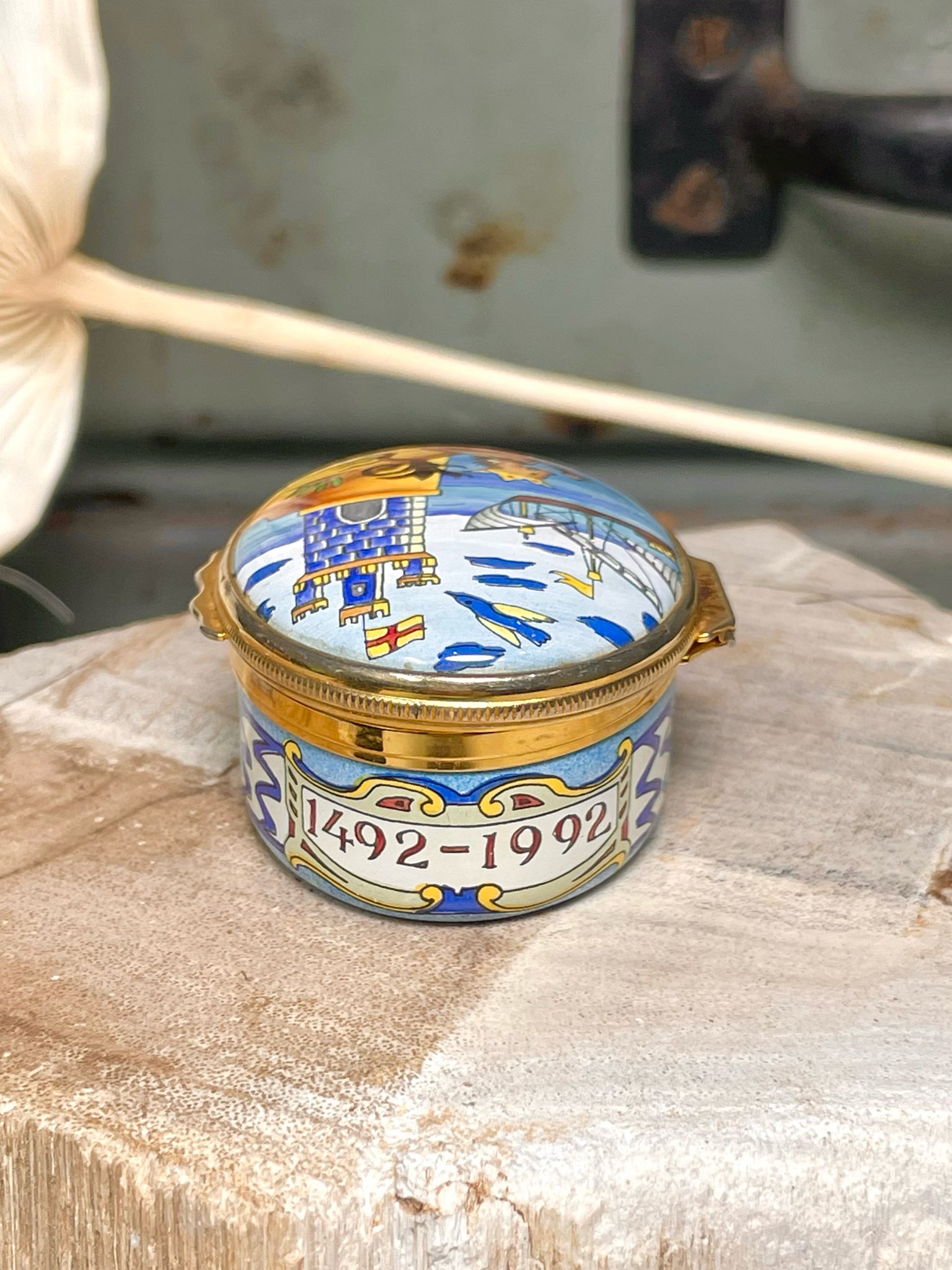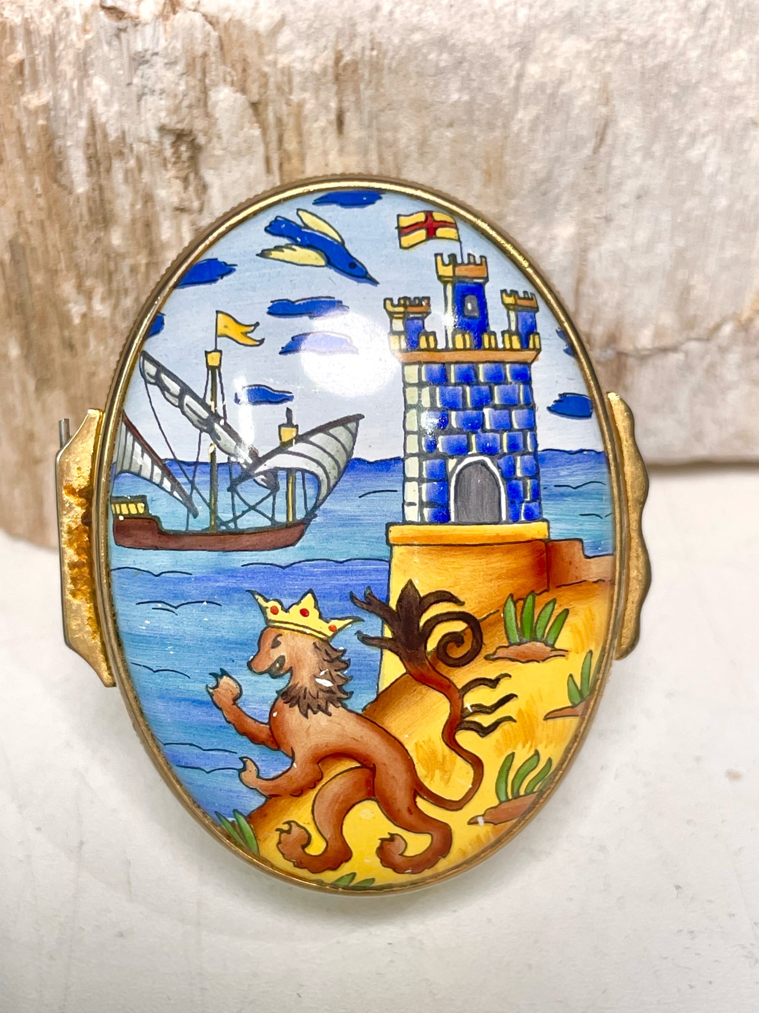 Tiffany & Co. gold and blue small pillbox featuring intricate ocean waves and ship motifs. A timeless collectible showcasing the brand’s signature craftsmanship and nautical elegance, perfect for display or as a refined keepsake.