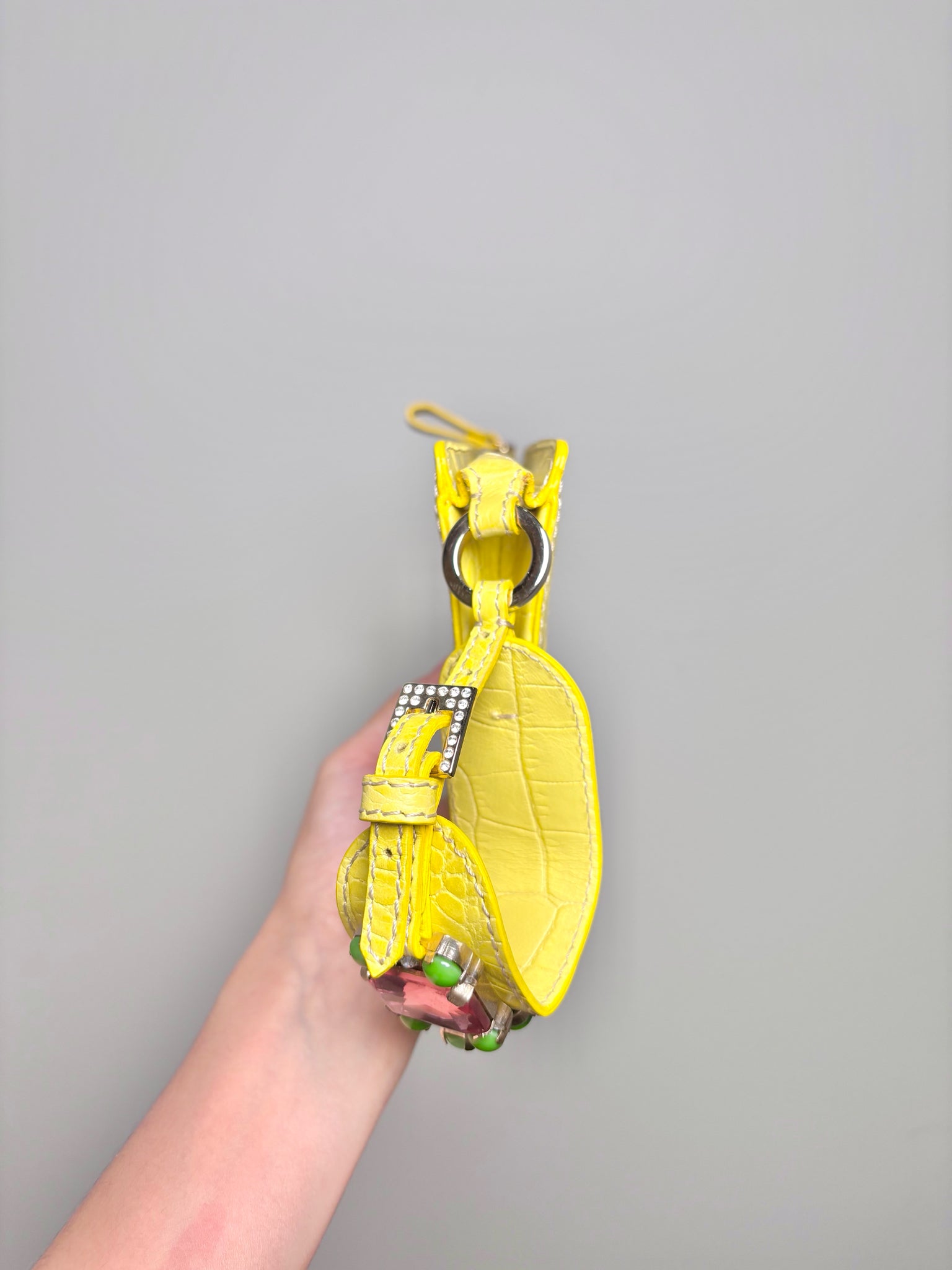 Add a pop of vintage Valentino to your collection with this striking yellow embossed leather convertible clutch from the early 2000s. Crafted by Valentino Garavani, this bold yet elegant piece features intricate faux gemstone embellishments, lending a touch of opulence to its structured silhouette.