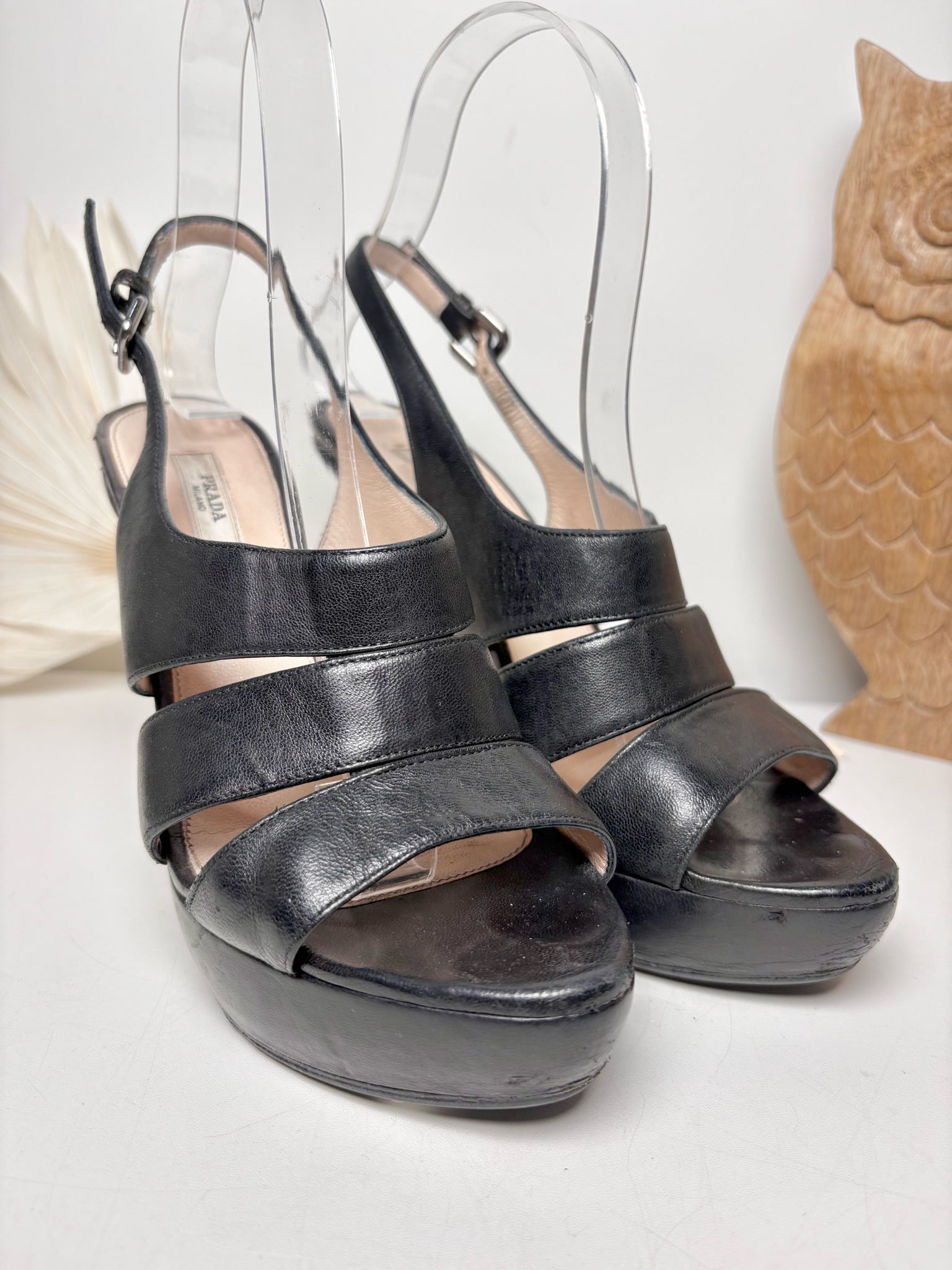 Prada black leather platform almond open toe cage heels in a size 6.5.