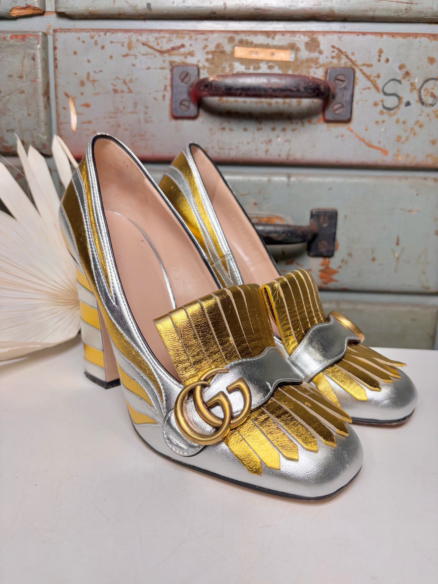 Gucci metallic gold and silver leather-wrapped Marmont loafers bring a striking, sculptural edge to any look. Designed with signature striped detailing and a bold 3.5" block heel, these statement shoes blend iconic house style with modern glamour. Size 6.5.