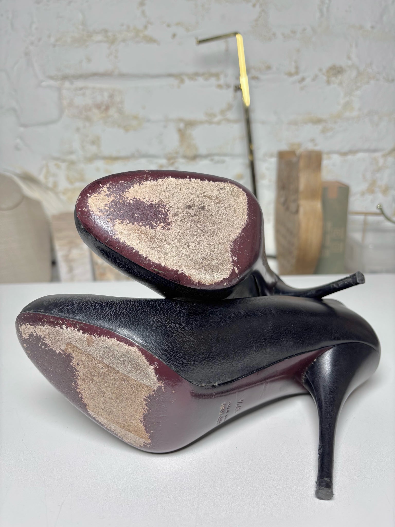These black leather pumps from Miu Miu feature a classic round-toe silhouette set on a refined heel, offering timeless sophistication with a subtle edge. Designed in a size 7.5, they are perfect for both work and evening wear. There is some scuffing at the heels, reflected in the pricing, making them an excellent opportunity to own a versatile Miu Miu staple at a great value.