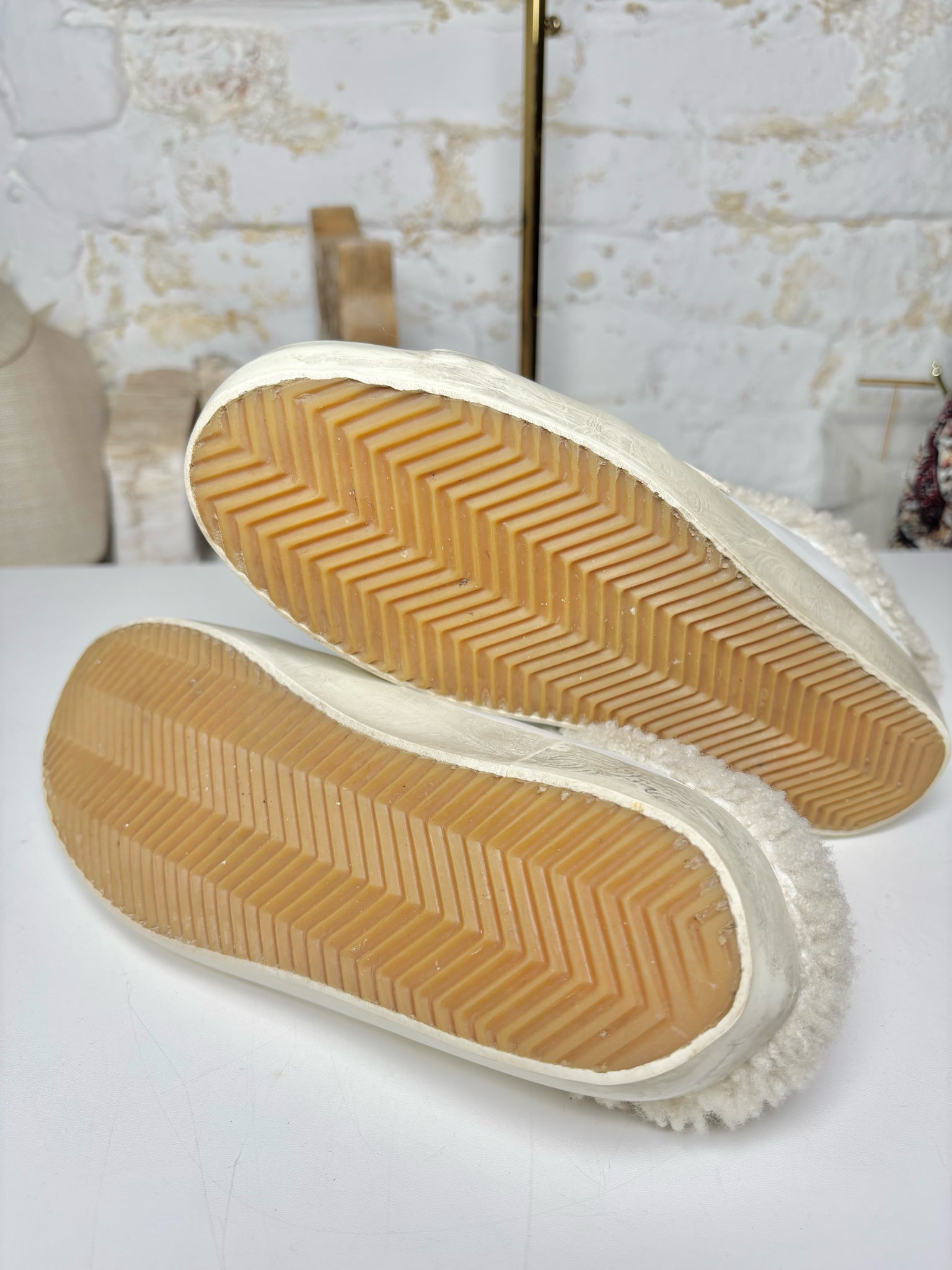 Elevate off-duty style with these Golden Goose Sabots, crafted in supple white leather and accented with the brand’s signature star in a metallic rose gold finish. Designed as a slip-on lace-up hybrid, this pair offers the perfect balance of comfort and edge. The removable sherpa lining ensures versatile wear—adding warmth in cooler months or effortless lightness when removed. Finished with the label’s artisanal distressing for that coveted lived-in look, these sneakers embody the brand’s iconic blend of casual luxury and Italian craftsmanship.