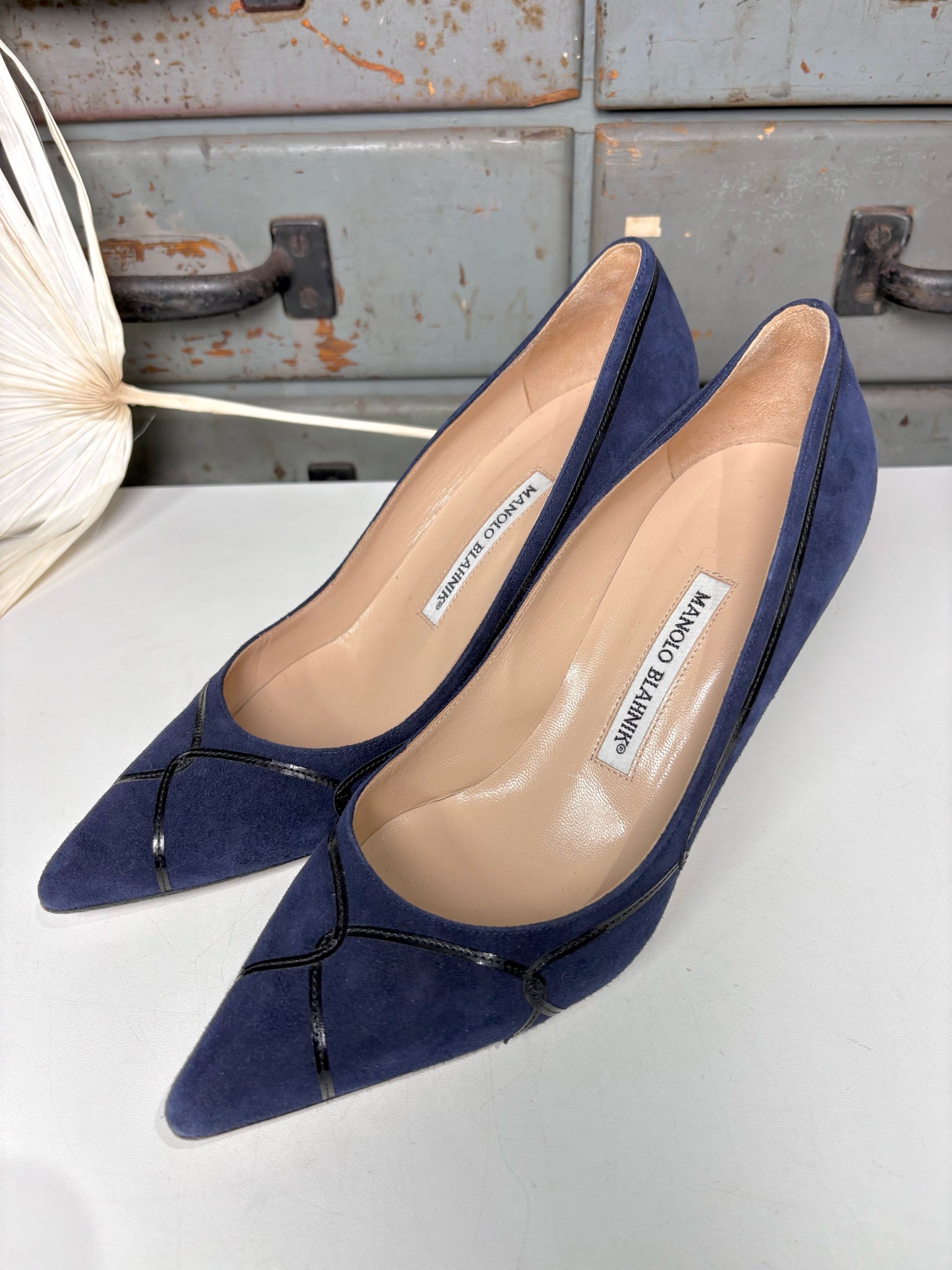 Manolo Blahnik navy blue suede pointed toe 3" heels with with patent leather embellishment in a size 7.5