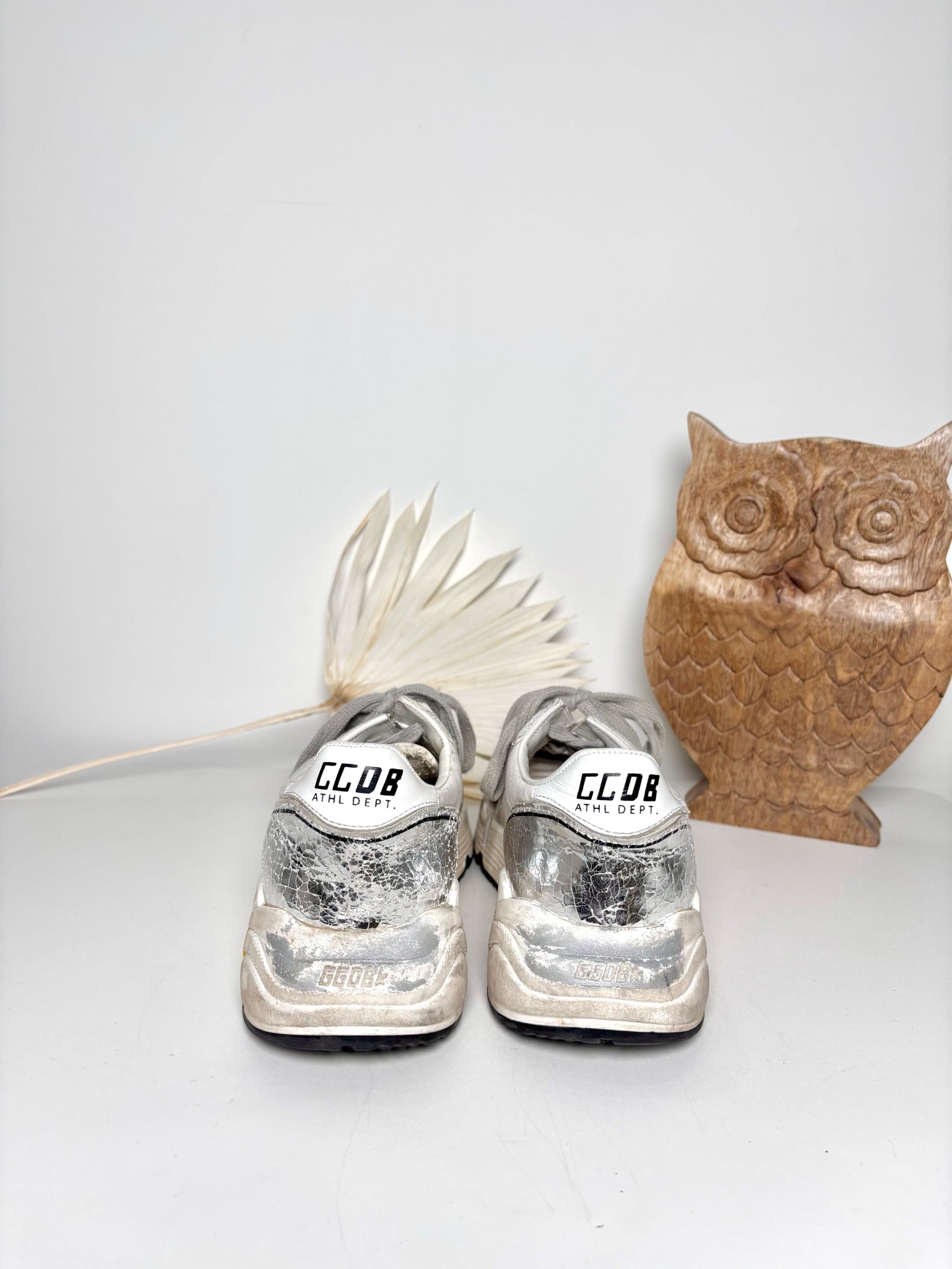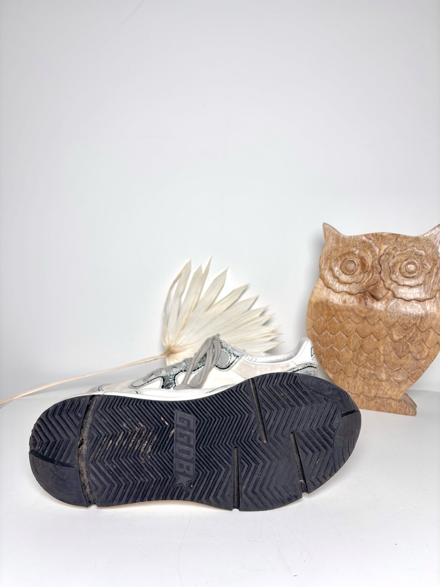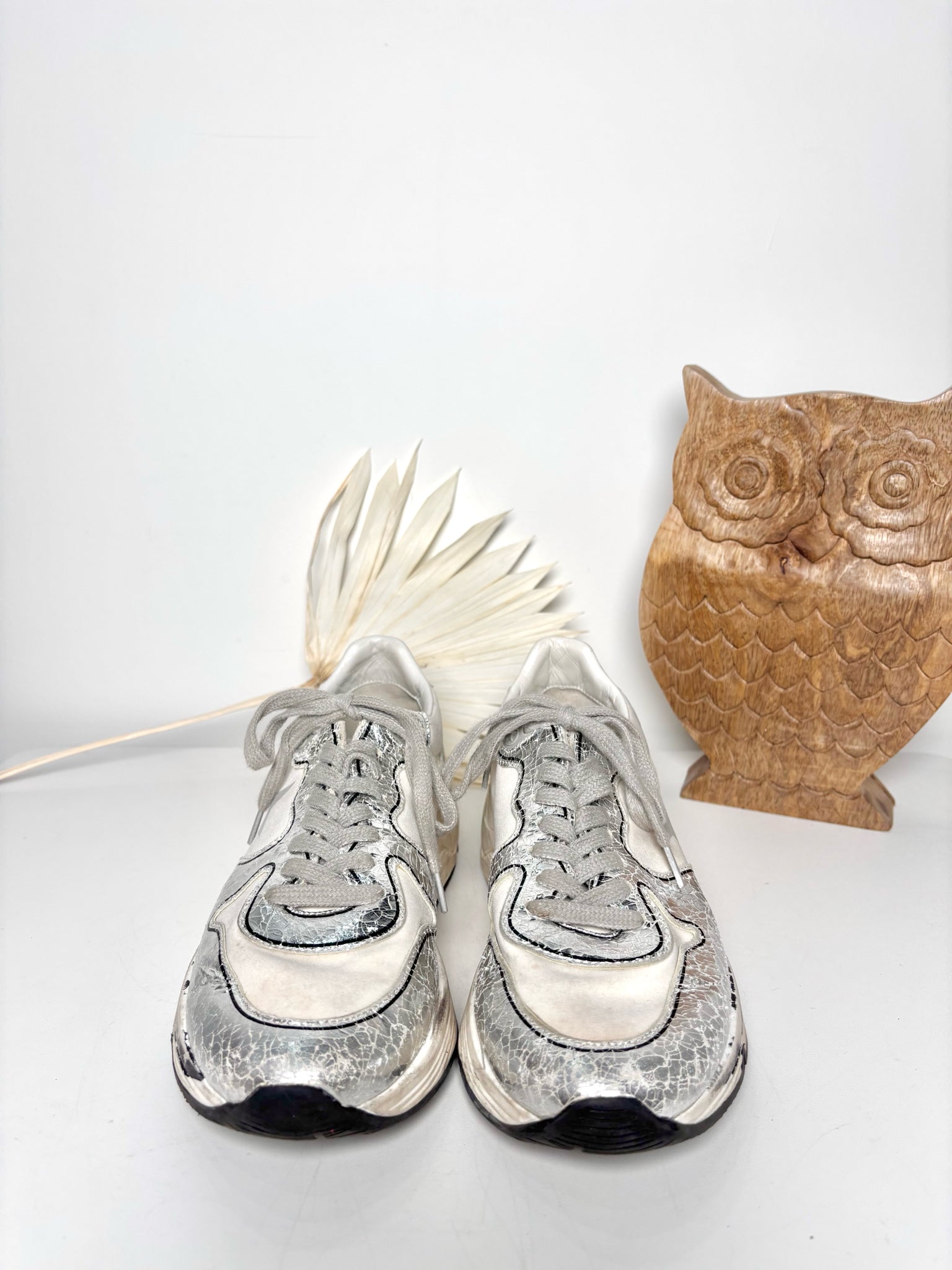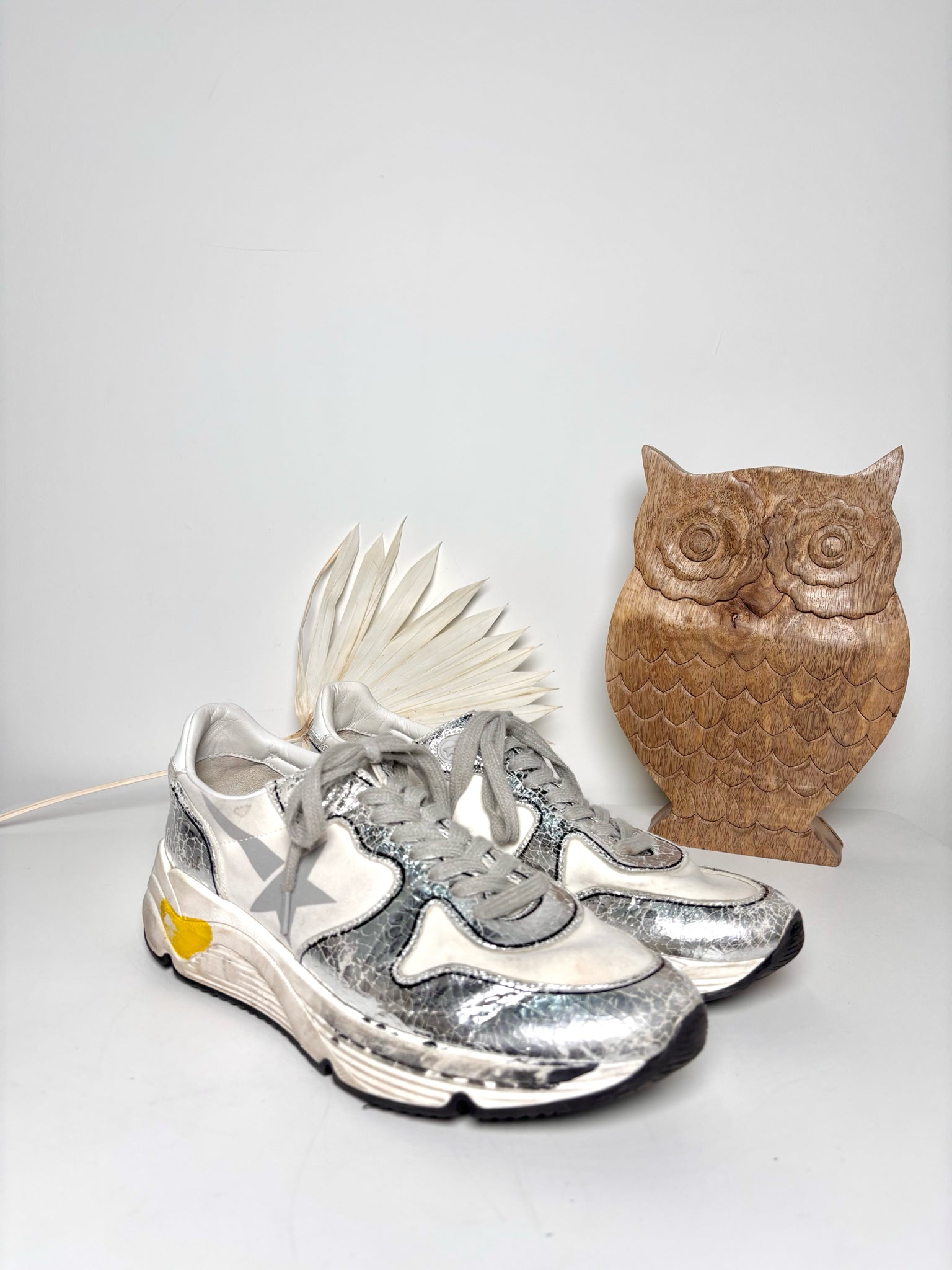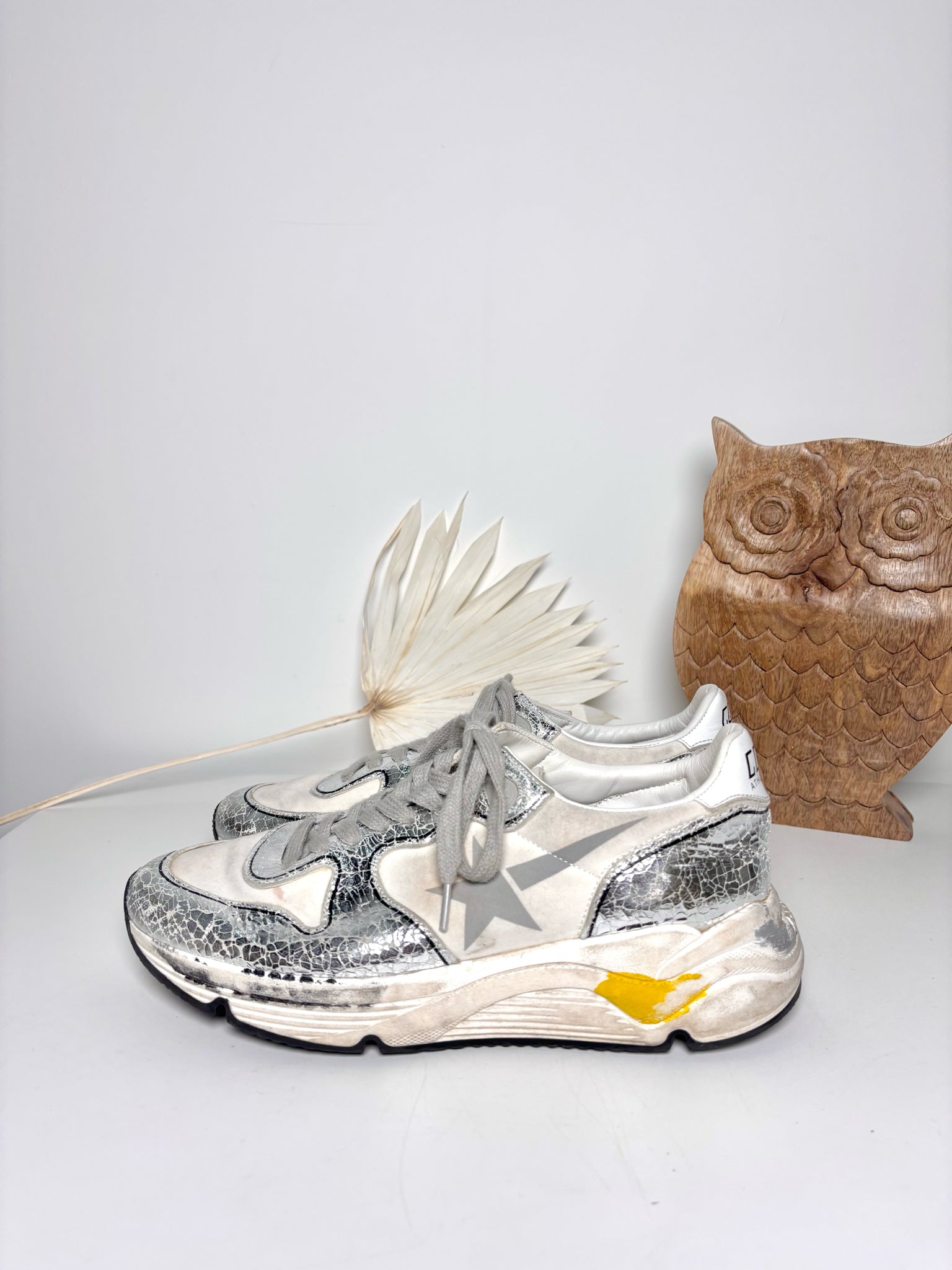 Golden Goose white, metallic Silver Star running shoes with light gray star detail. Intentionally Distressed. Pre-Owned.