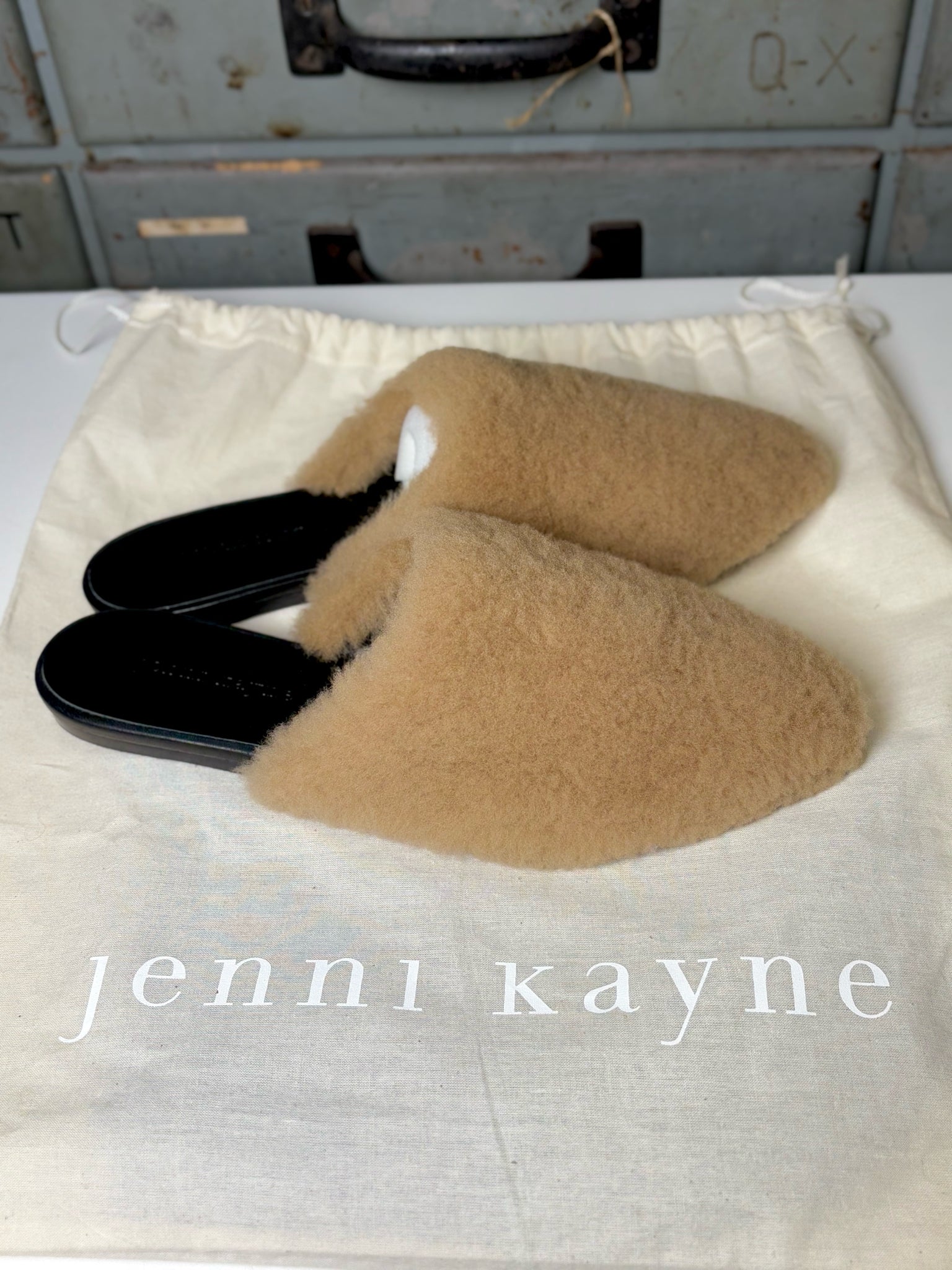 Cozy and effortlessly chic, these Jenni Kayne shearling slip-ons in camel offer plush comfort with a sleek silhouette. Comes with dust bags and crafted in women’s size 39 (US 8.5) for a luxe, casual statement.