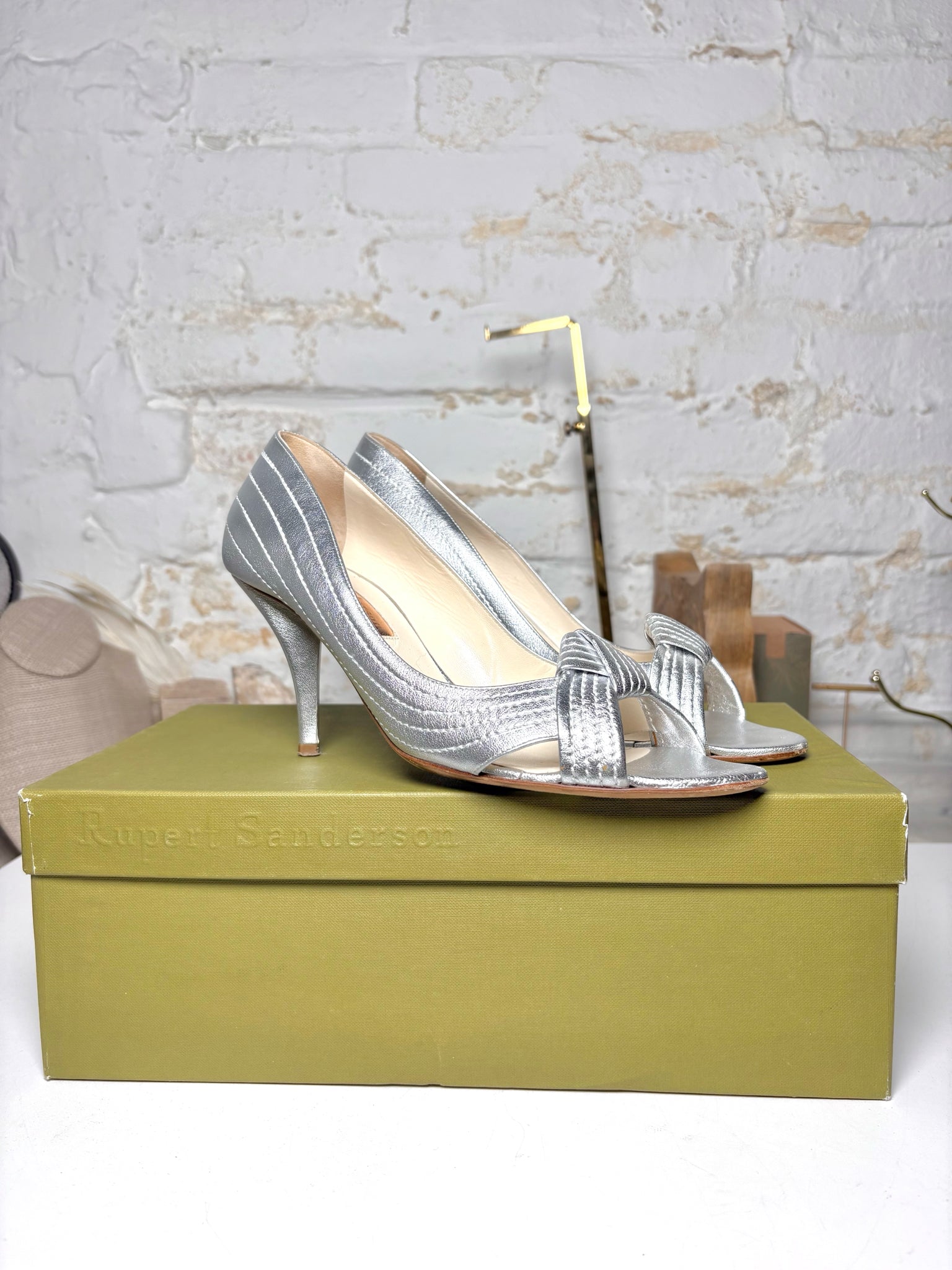 Rupert Sanderson silver metallic peep toe 3.5" kitten heels with twist knot detail at the top in a size 8.5. Comes with the original green box and dust cloth.