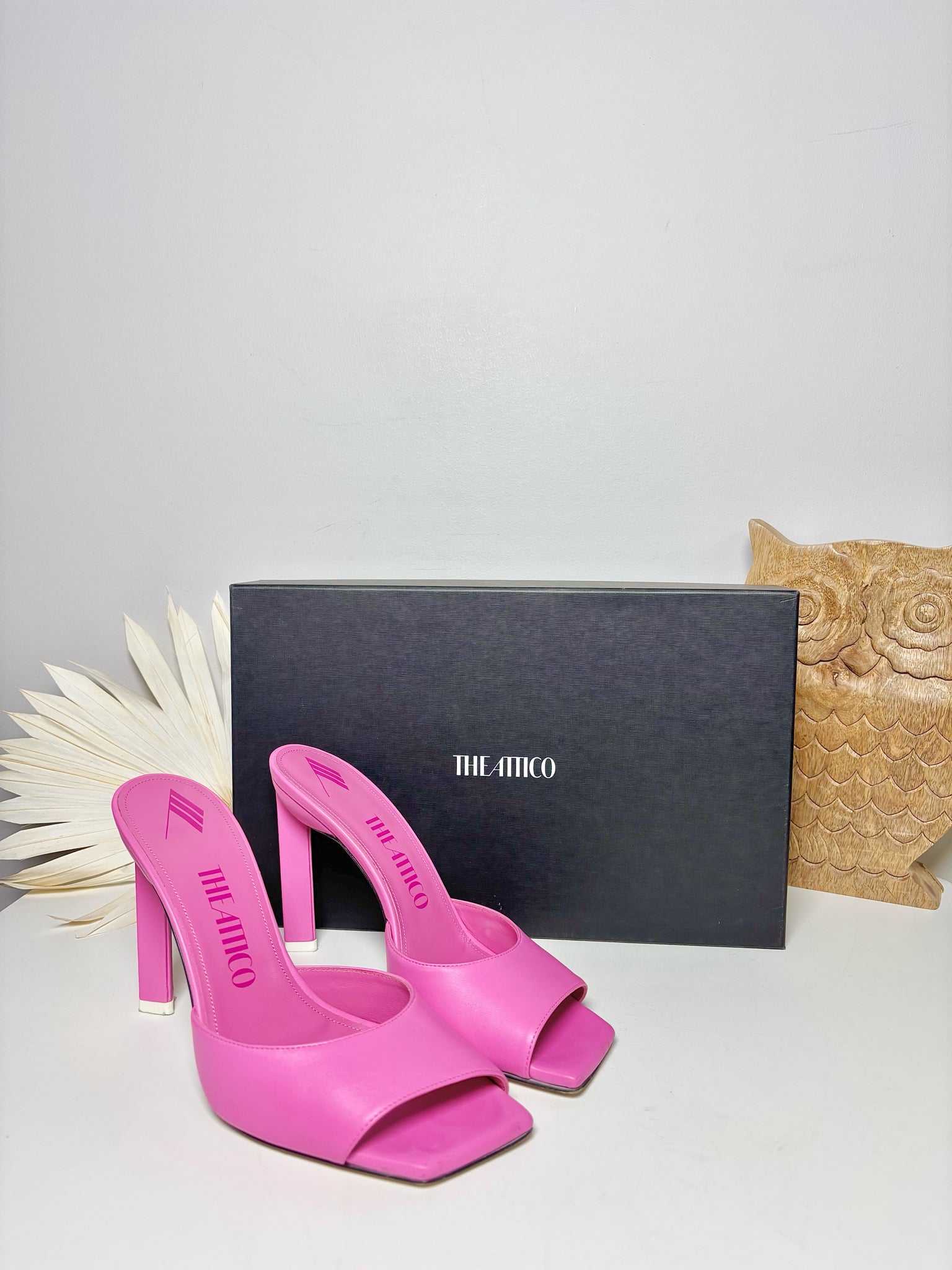 The Attico pink leather open toe square 4" heels. Comes with original black box. Priced as-is (see pictures for more details).