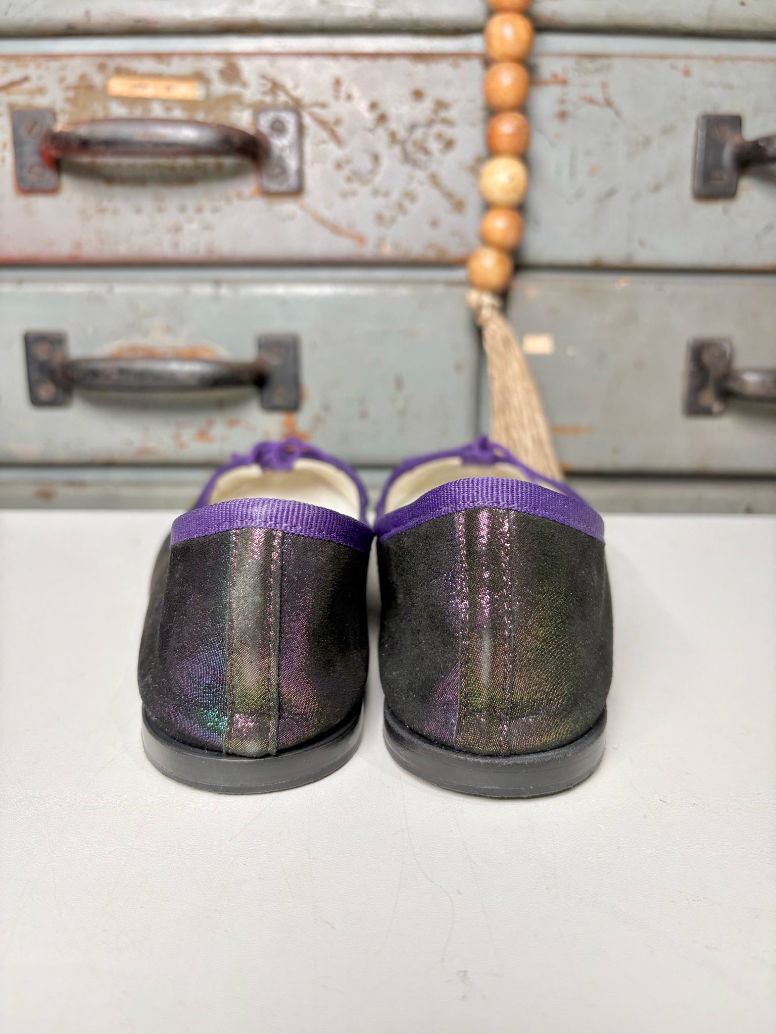 Repetto purple, blue, and yellow iridescent goatskin leather flats with a bow at the toe in a size 10-10.5. Comes with the original black box and shoe products.
