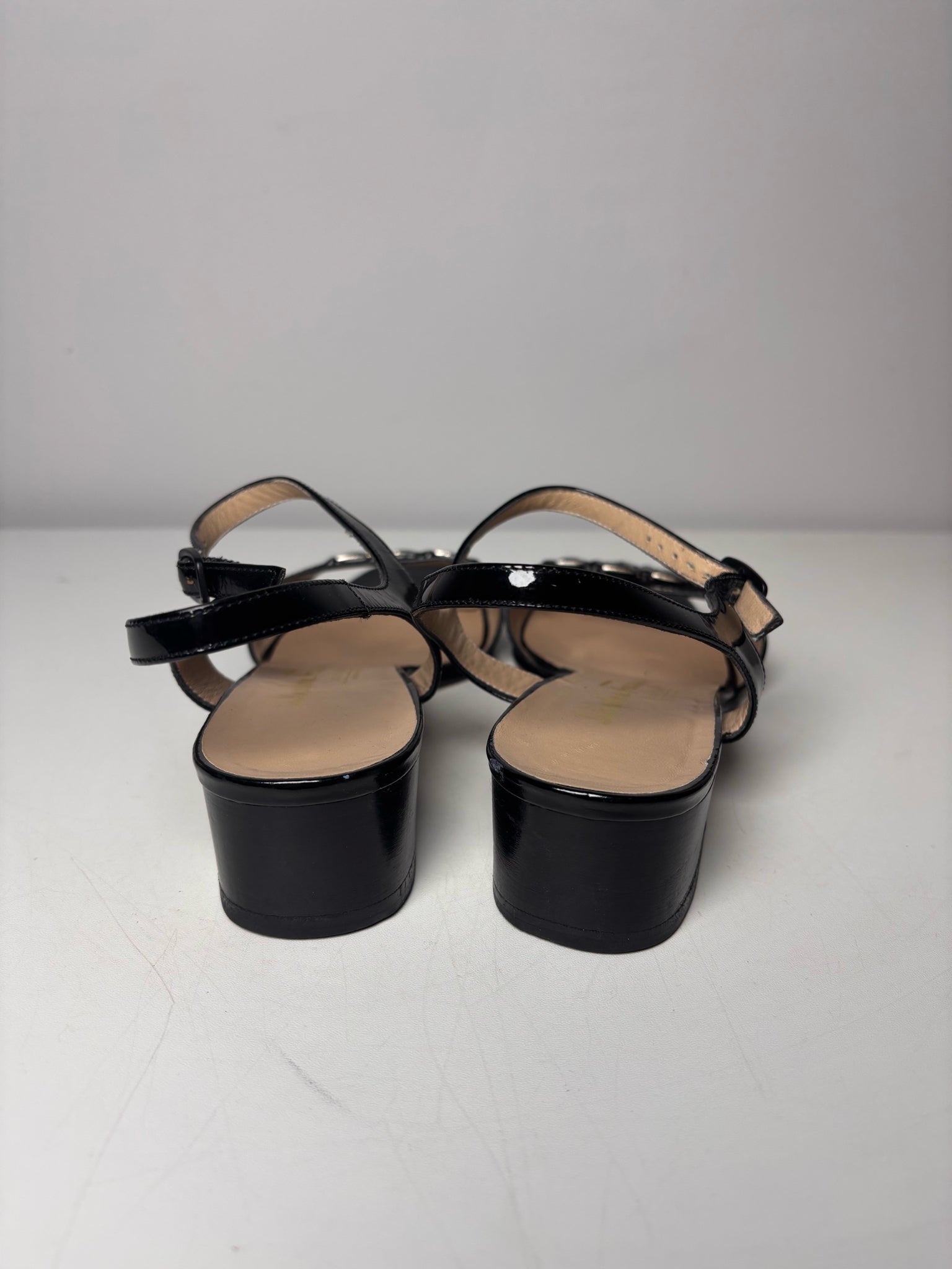 Elegant with a modern edge, these Salvatore Ferragamo heels are crafted in glossy black patent leather for a sleek, polished look. The open-toe design is complemented by a strap with buckle closure for a secure, feminine fit, while the metallic gray triple chain-link detail at the front adds a distinctive, contemporary accent. In women’s size 6.5, this refined pair seamlessly transitions from day to evening with timeless sophistication.