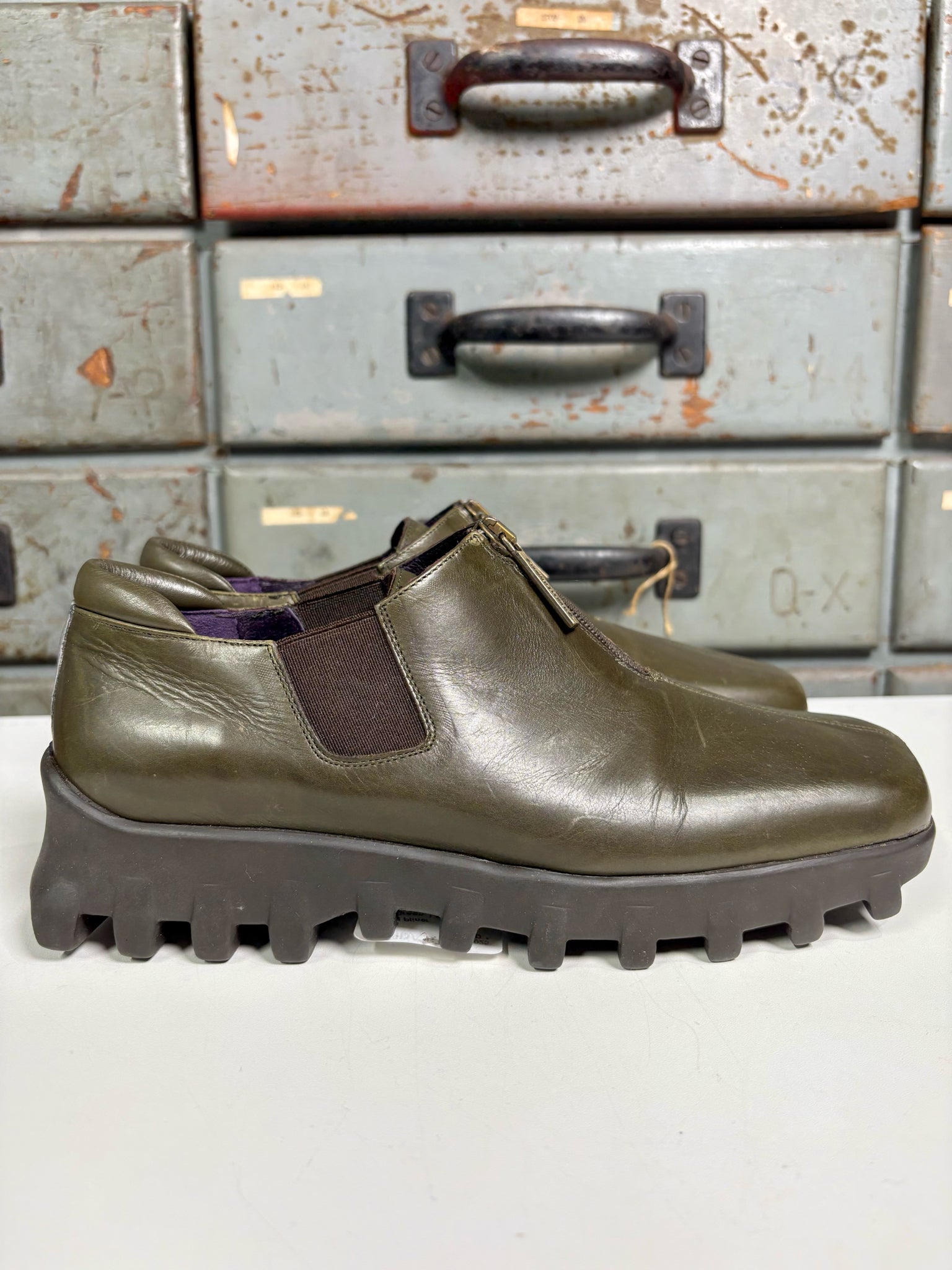 Donald J Pliner olive green leather slip-ons featuring a modern square toe, front zip detail, and chunky grip sole for a refined yet contemporary edge. Expertly crafted for comfort and style. Size 7.5.