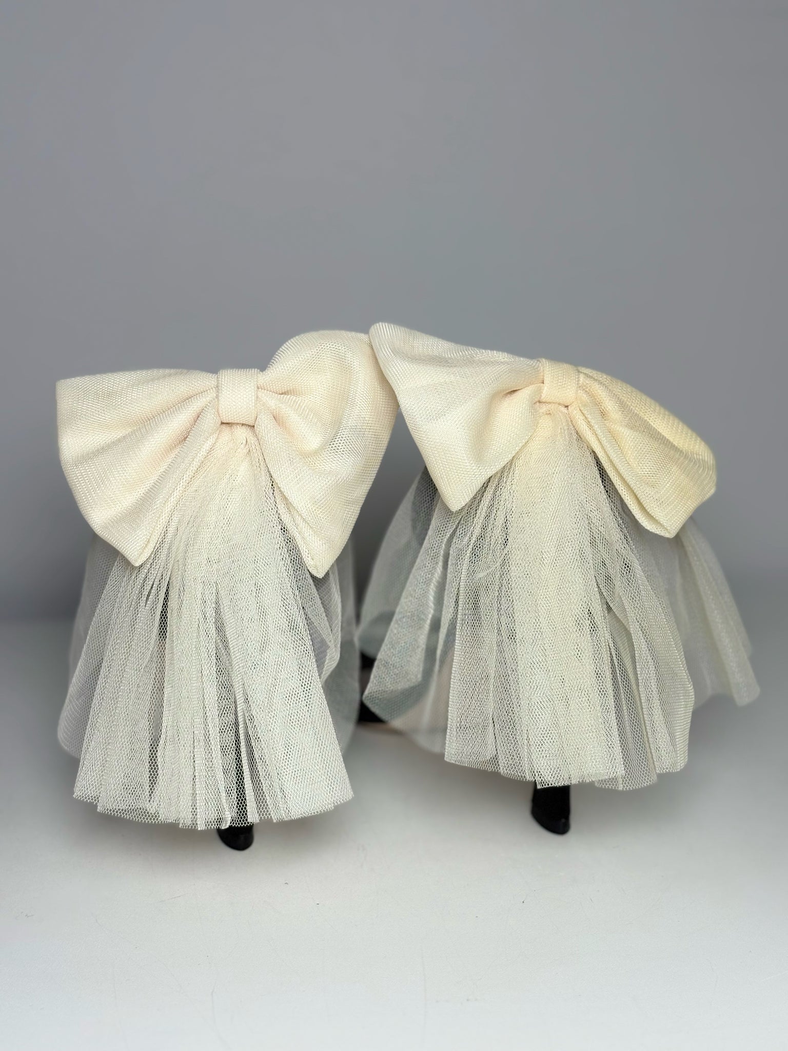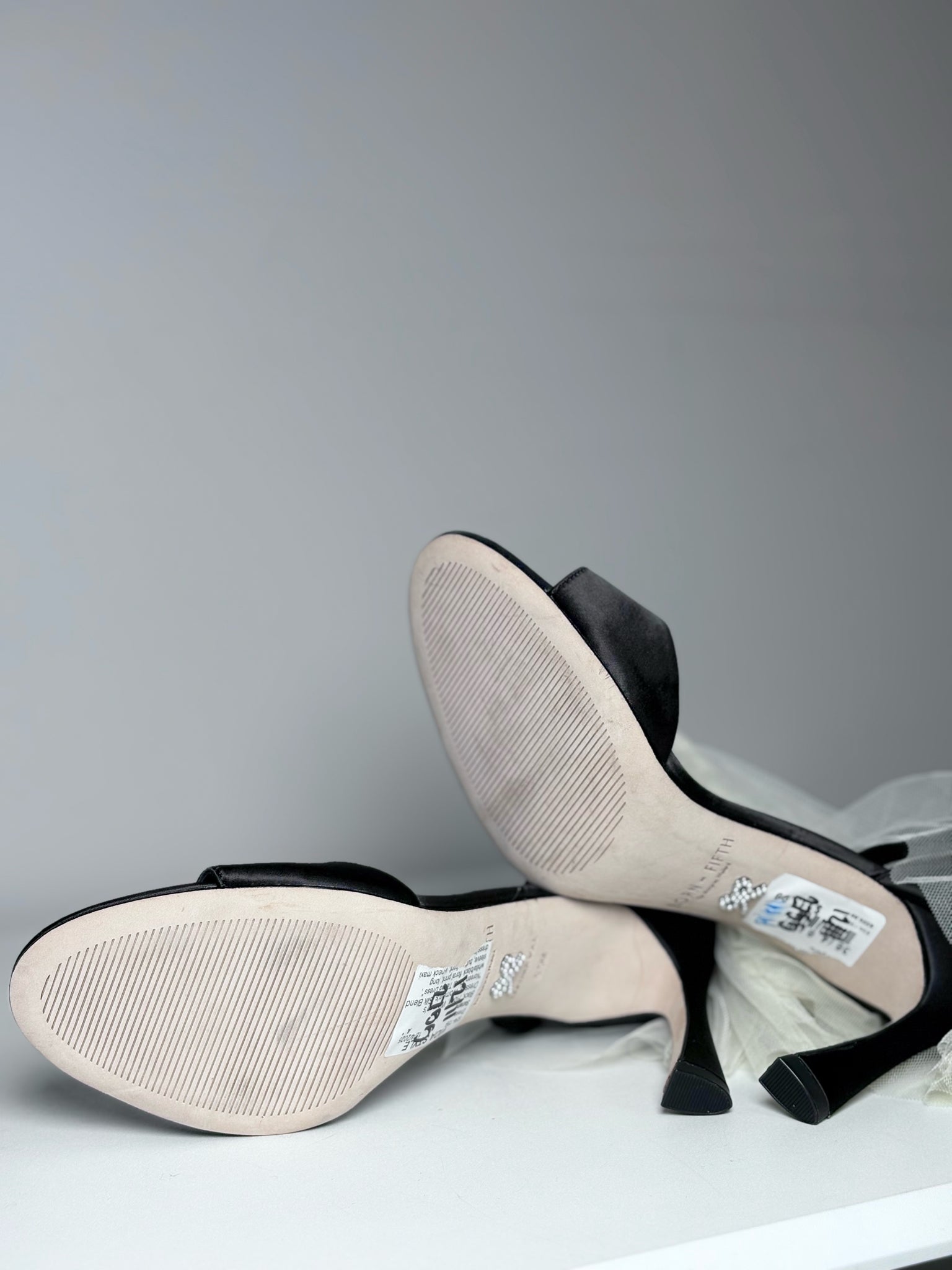 Feminine and elegant, these Antonio Melani x Born-Fifth strappy sandals feature a tulle bow at the back, black leather and suede construction, and a 3.5" heel. New without tags, they offer graceful ankle straps and polished sophistication in women’s size 8.5.