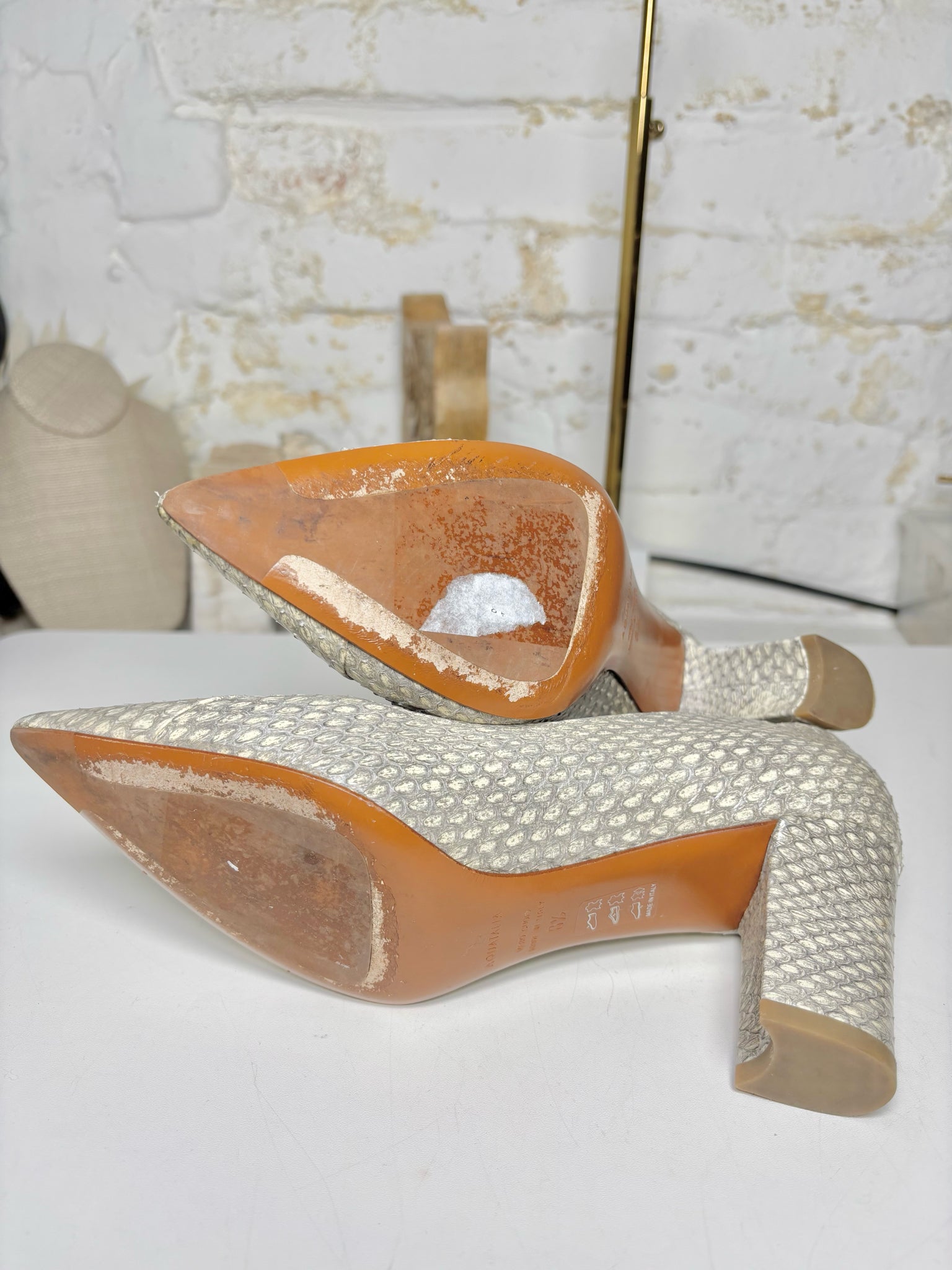 Aquaitalia silver leather with a snakeskin feel pointed toe 3" heels in a size 8.5.