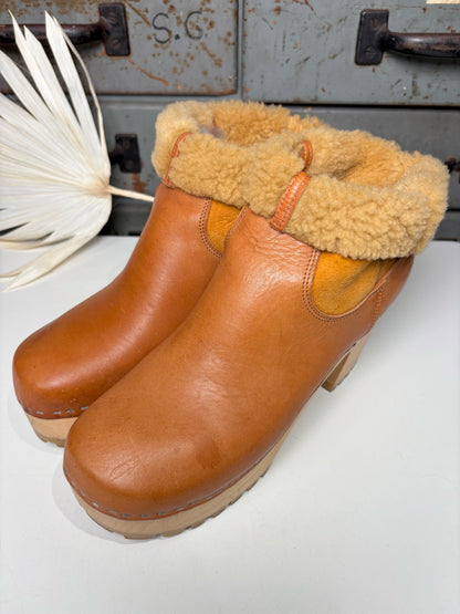 Hasbeens caramel color leather ankle clog boots with sheerling lining (original Swedish) in a size 8.5.