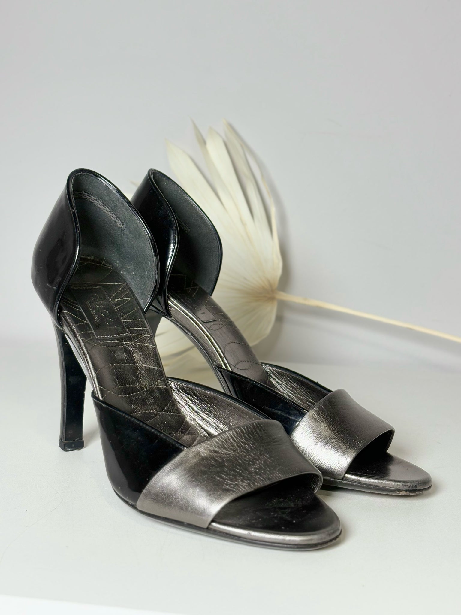 Bold and contemporary, these Gucci heels feature an open-toe design with striking black and pewter patent leather color-blocking for a modern, fashion-forward statement. Designed with a sleek silhouette, they embody the brand’s signature luxury aesthetic. In a Women’s Shoe Size 8, this pair is sold as-is, offering a distinctive and stylish addition to a curated wardrobe.