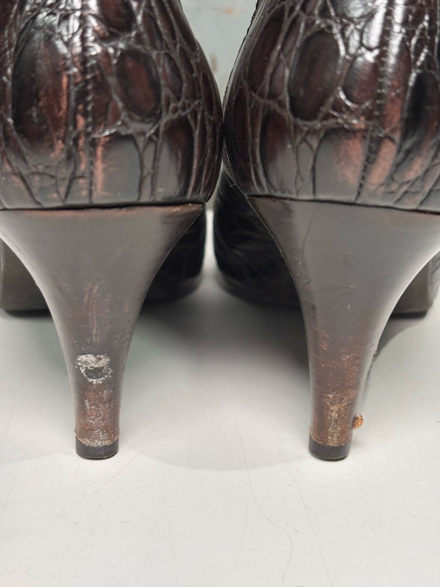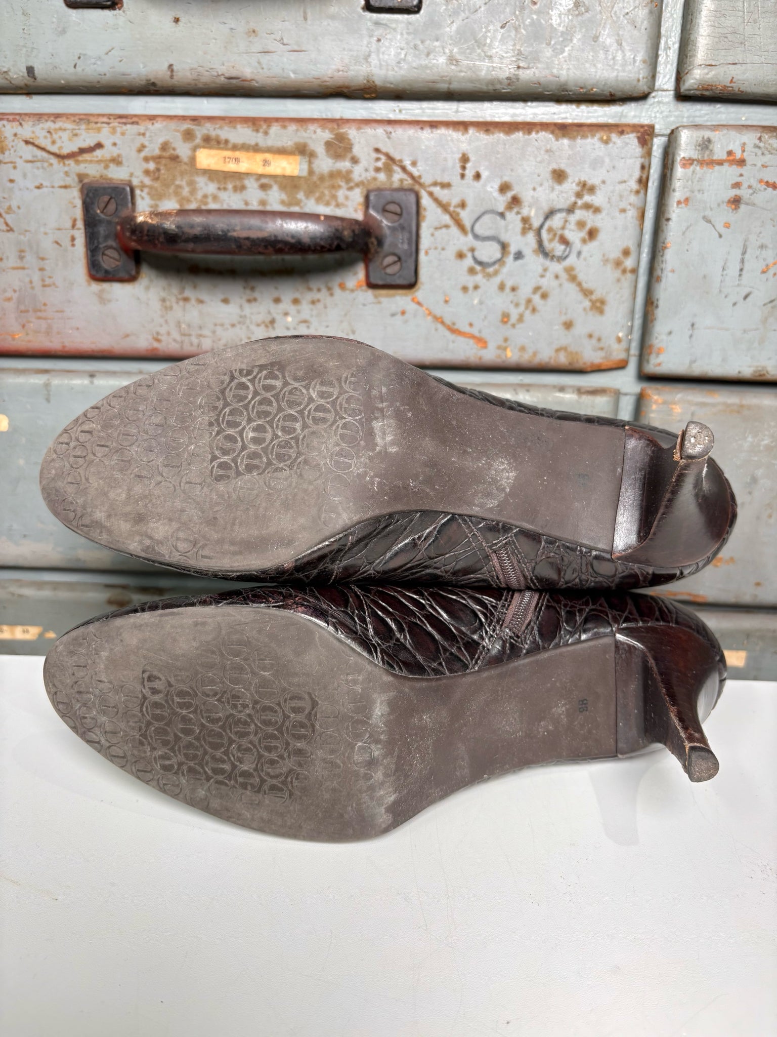 Talbots chocolate brown leather croc embossed booties with gold buckle in a size 9.