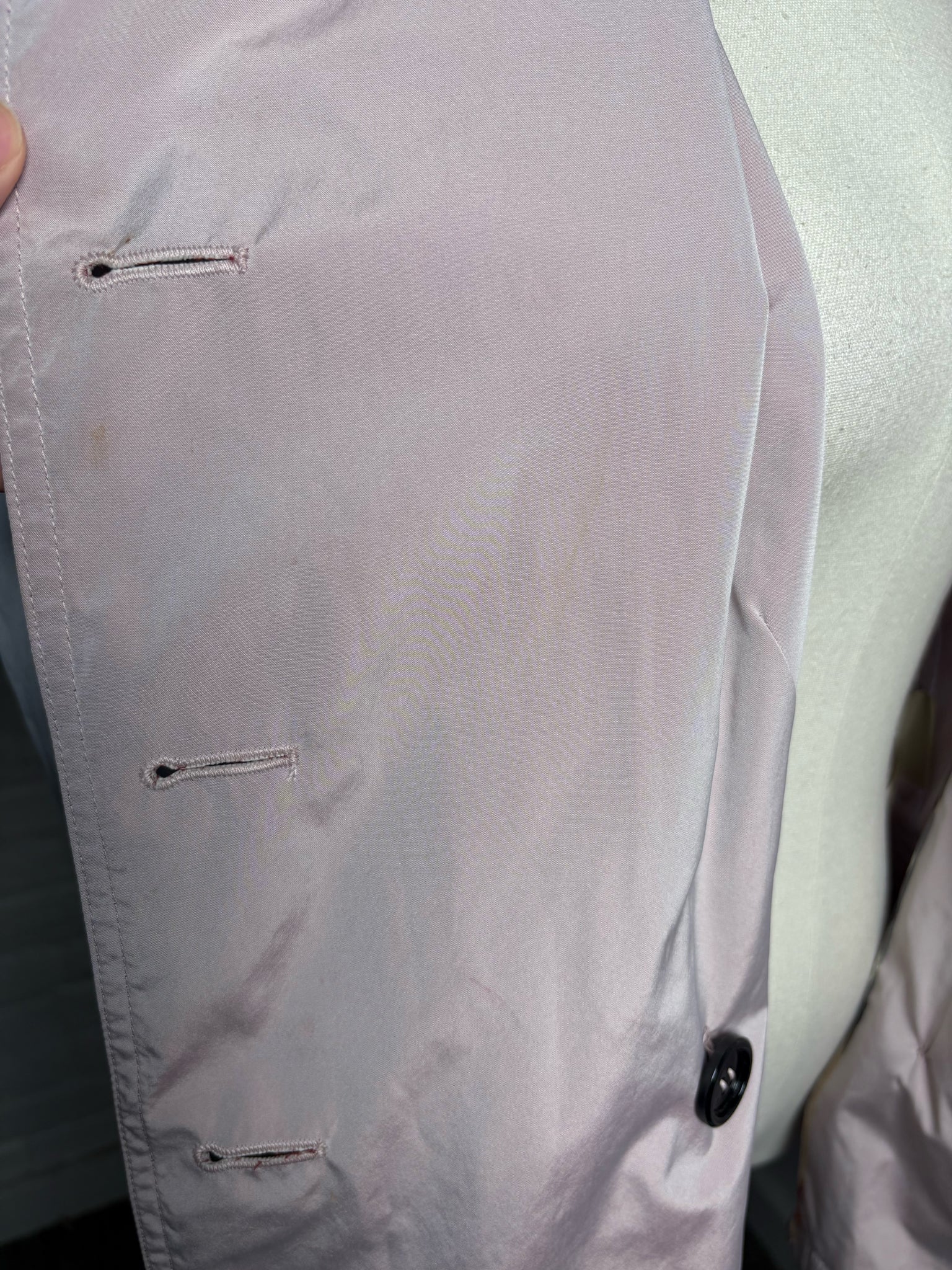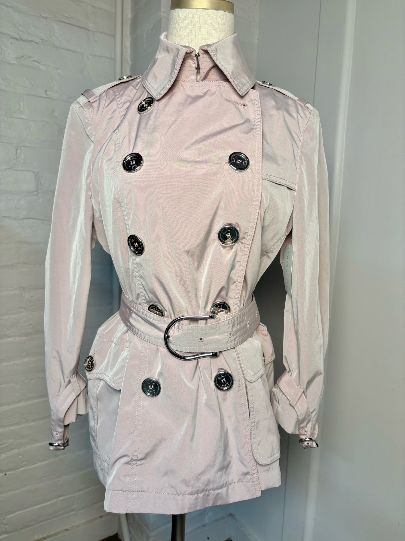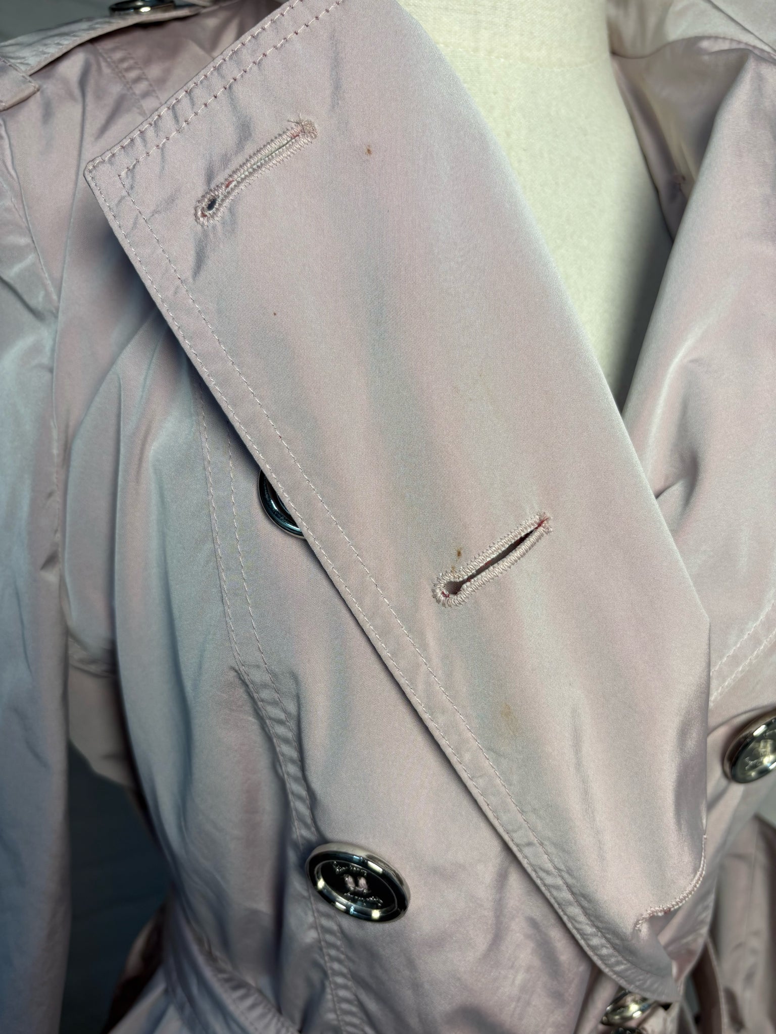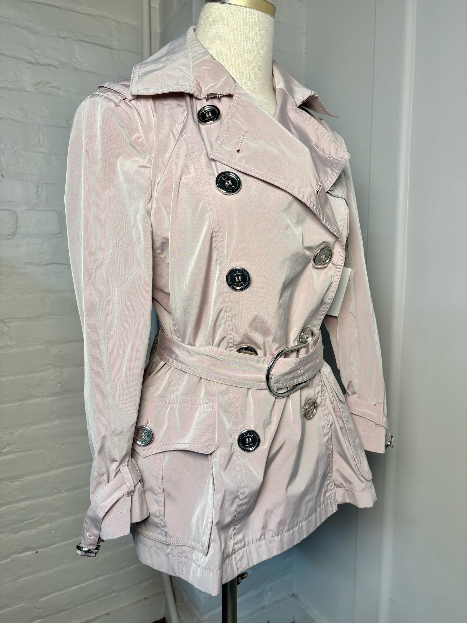Burberry Dusty Light Pink Short Trench Coat, Size 10 — A modern take on a classic, this trench features silver-tone buttons and a matching belt for a polished silhouette. Shows slight stains; priced as is.