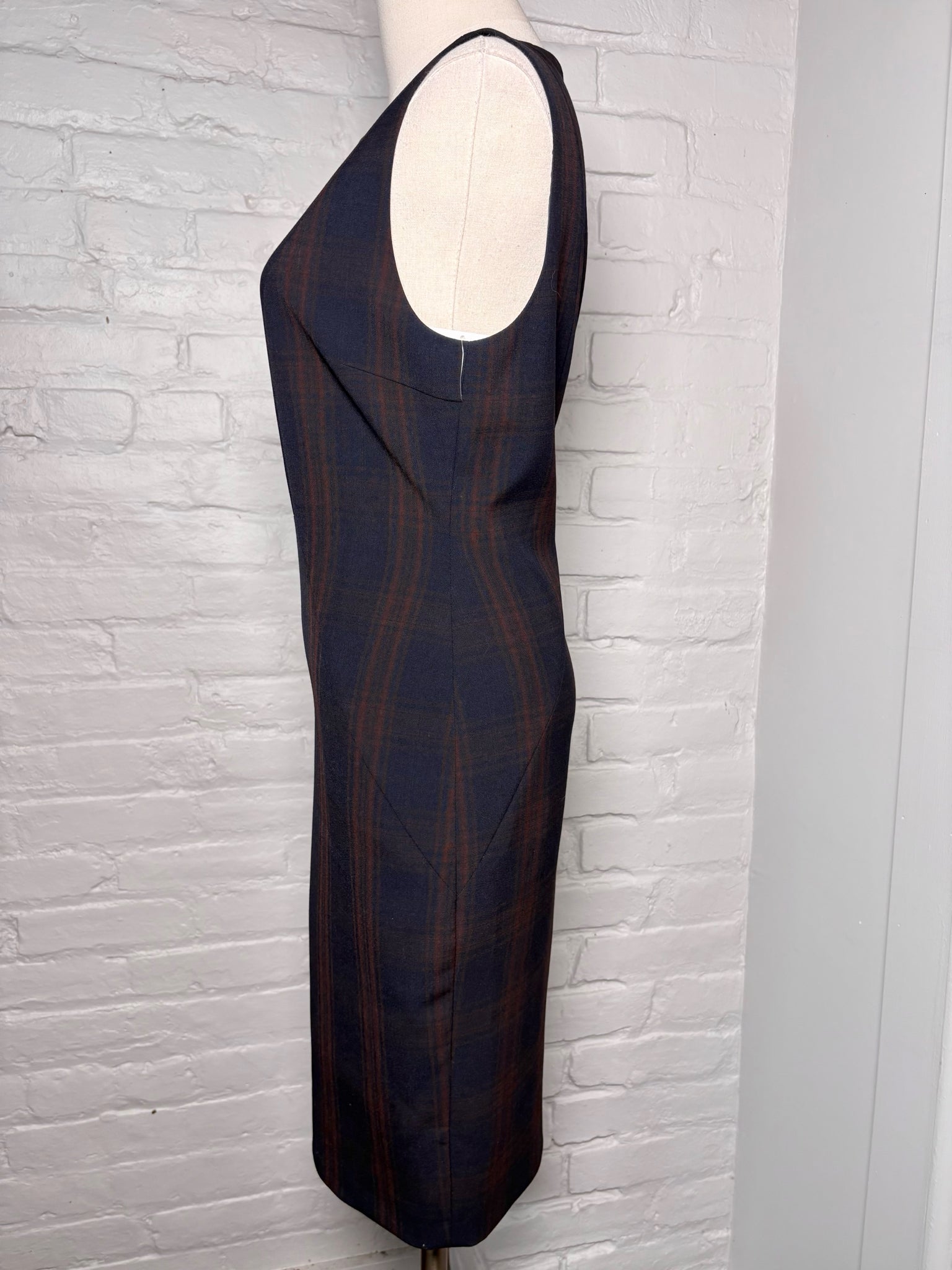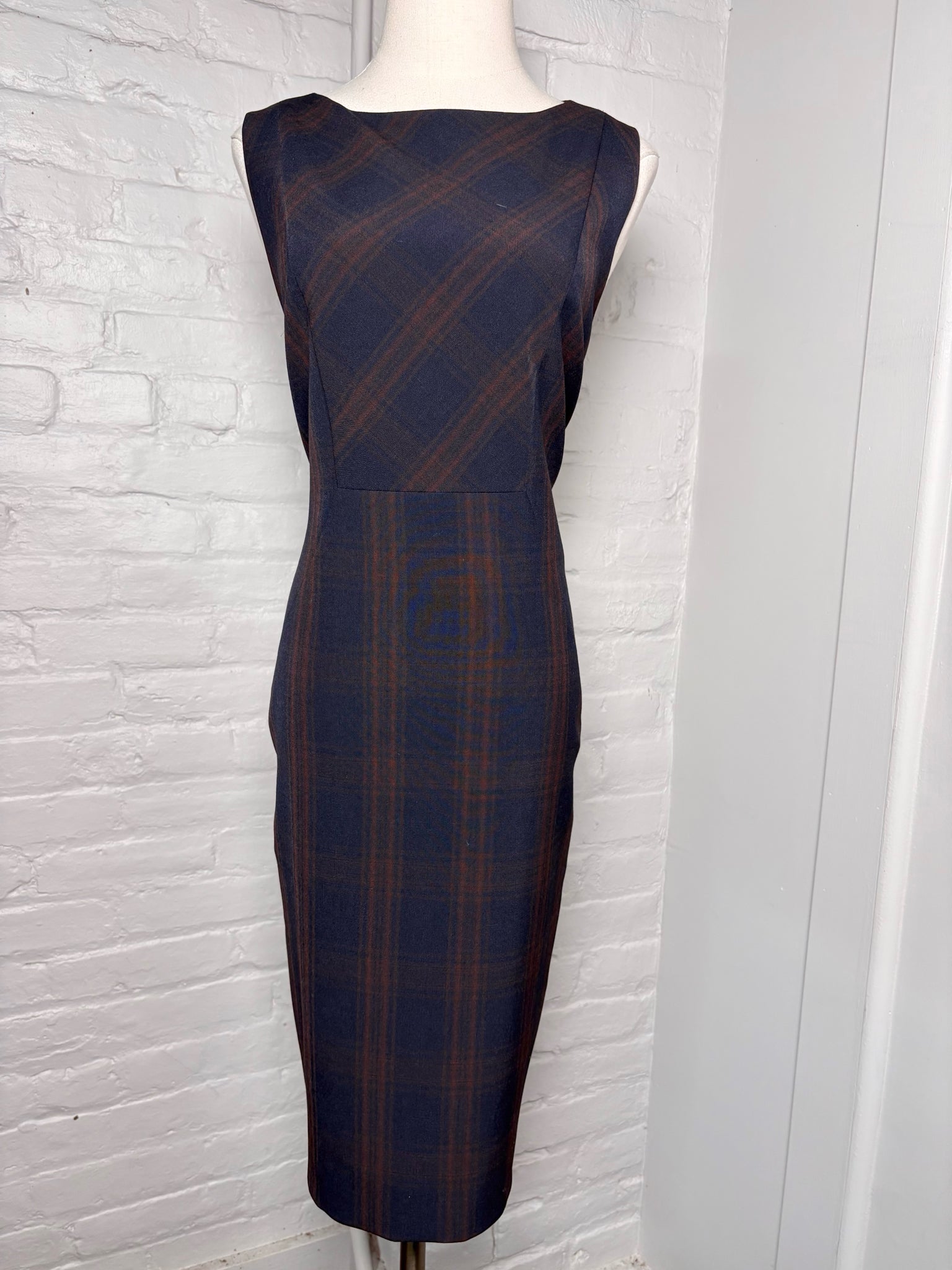 Ellie Tahari navy and brown plaid sleeveless shift dress in a size 10.