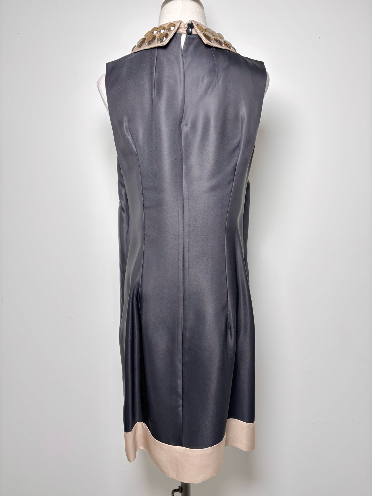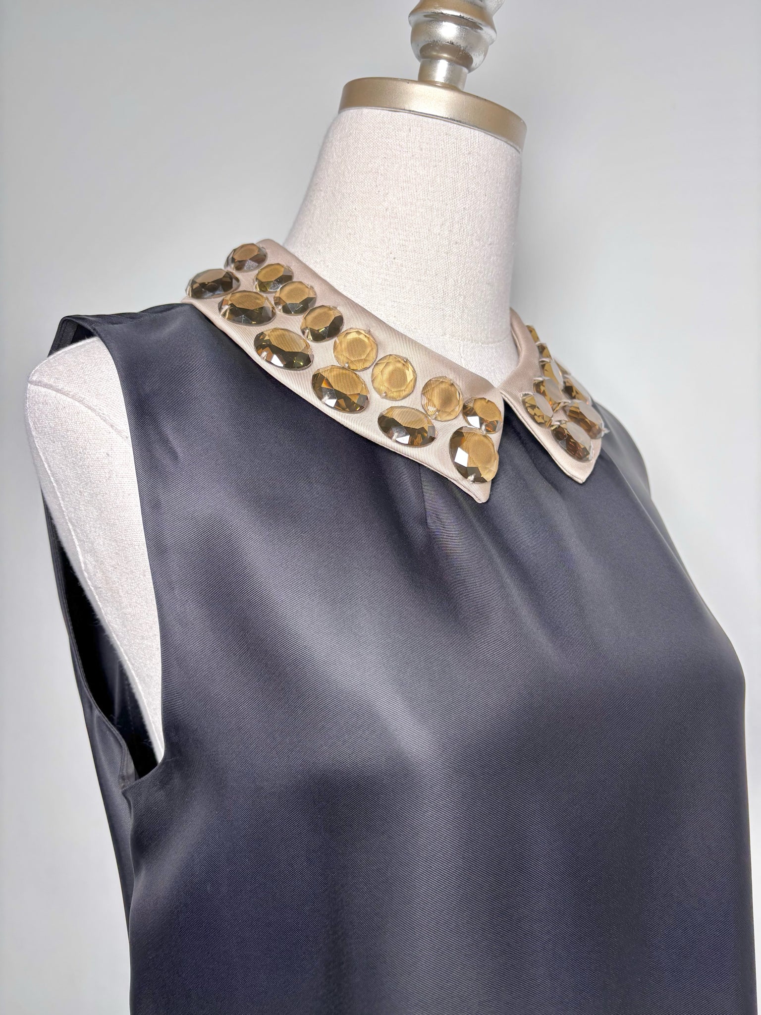 This Kate Spade New York shift dress features a sleek black silhouette accented with khaki Peter Pan–style glass acrylic beads for a playful yet polished look. Designed with a concealed side zipper and an unlined finish, it offers an effortlessly chic style ideal for day-to-night wear.