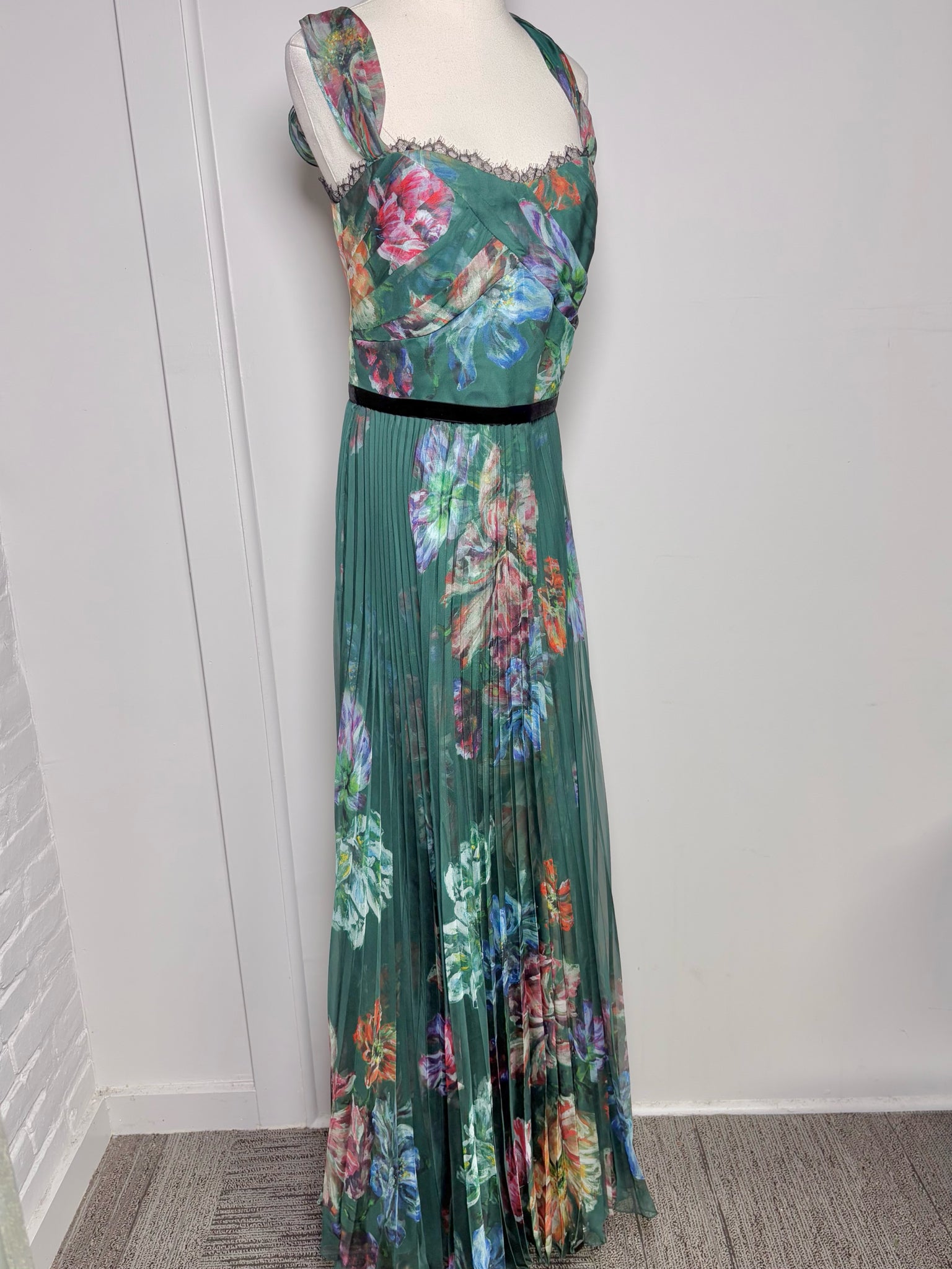 Romantic and refined, this Marchesa Notte hunter green gown features a sweeping floral design with lace trim and delicate mini pleats throughout. A stunning special-occasion ball gown that delivers effortless elegance in size 10.