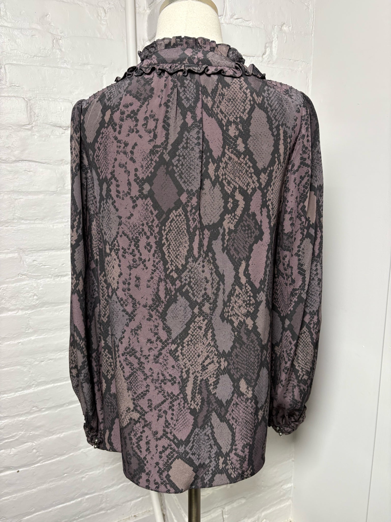 Rebecca Taylor gray and black snakeskin print long sleeve blouse with ruffle neckline detail in a size 10.