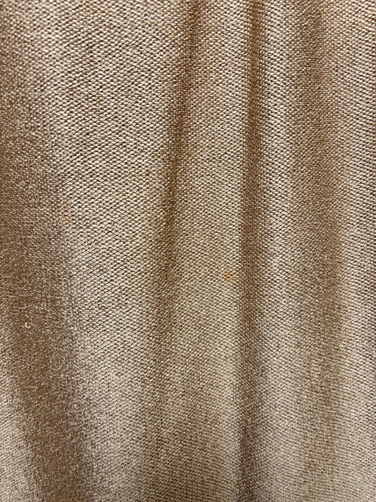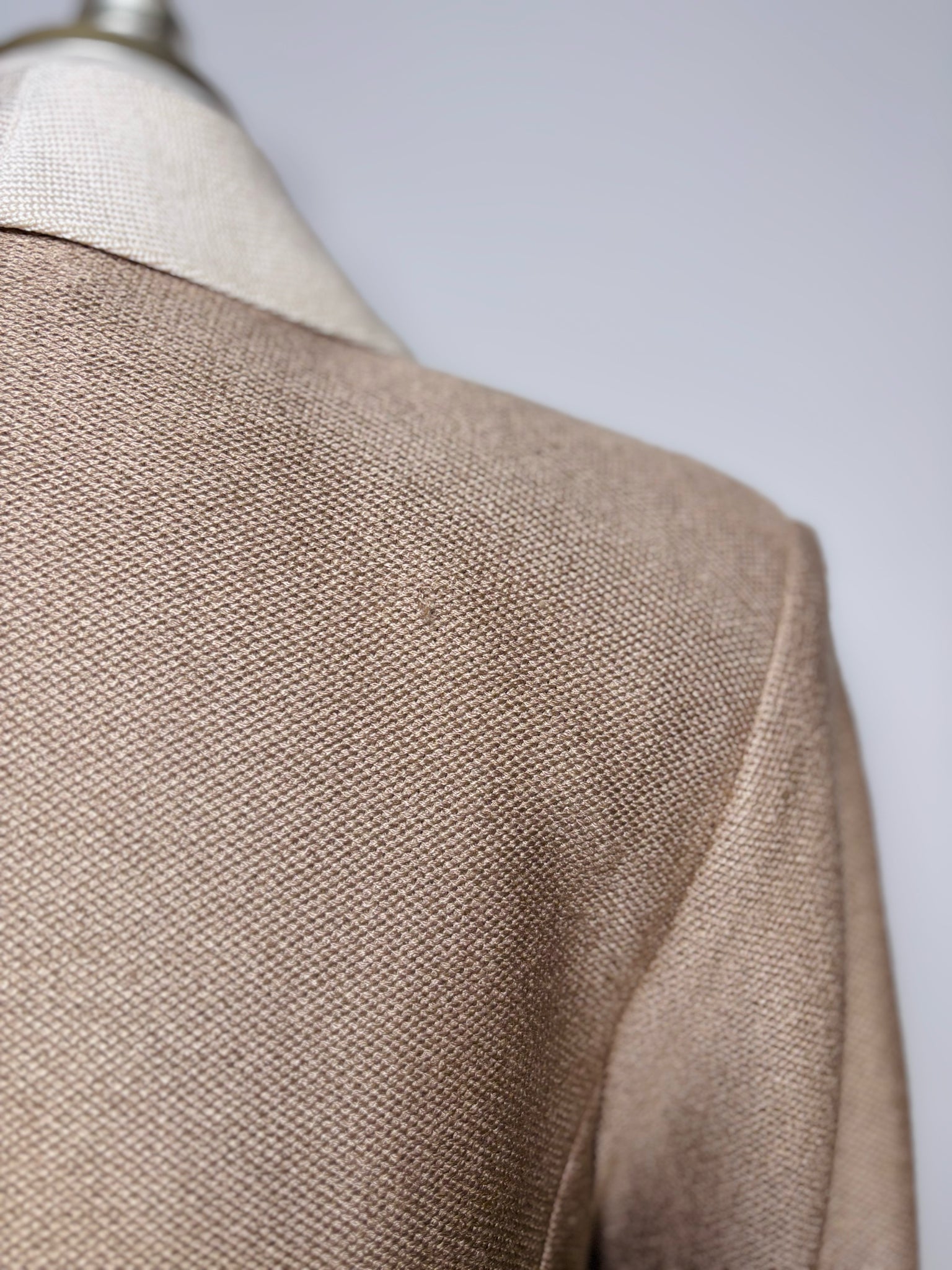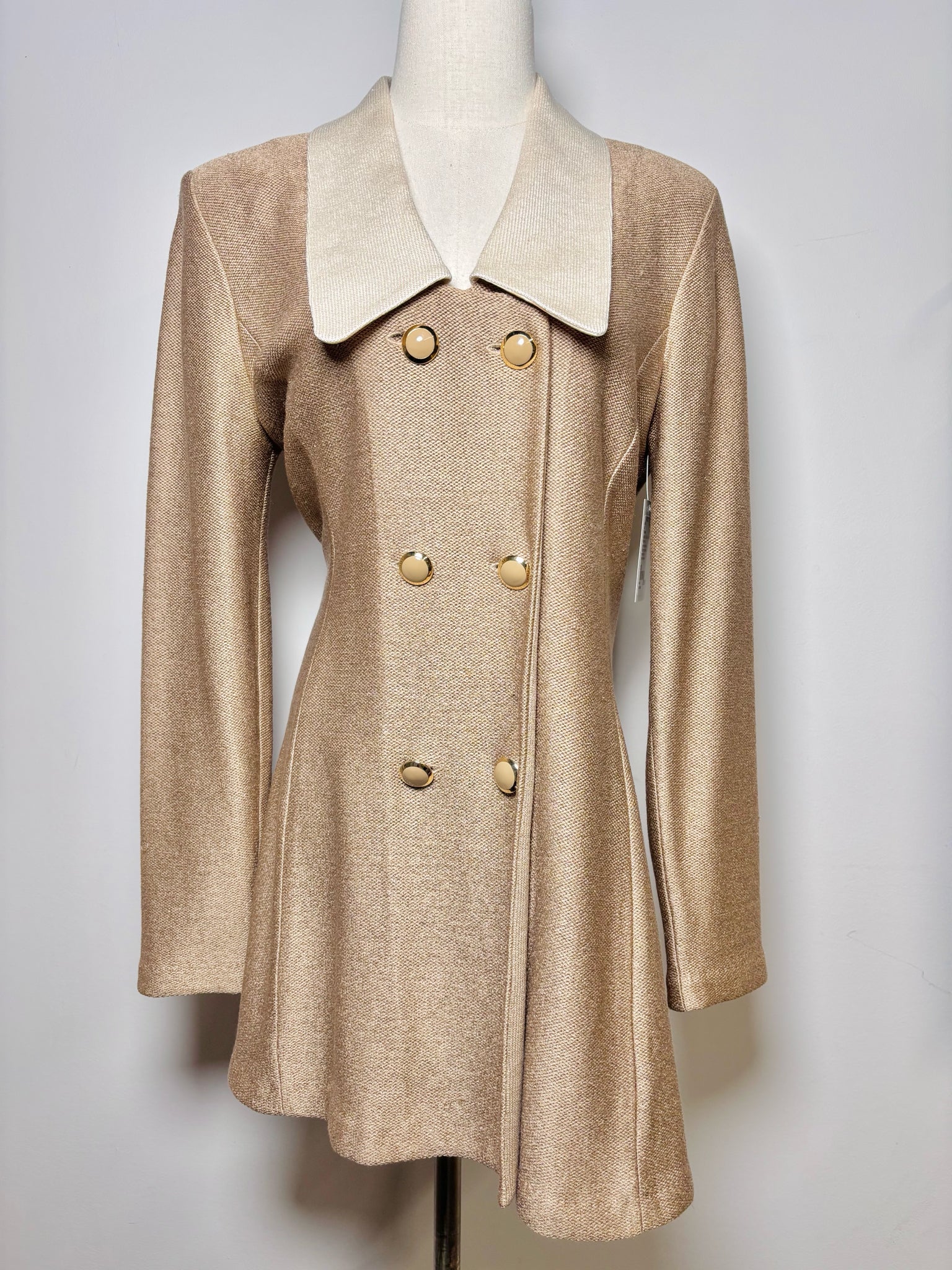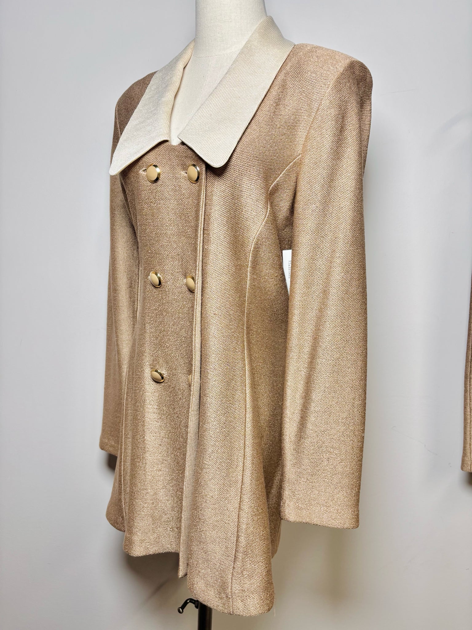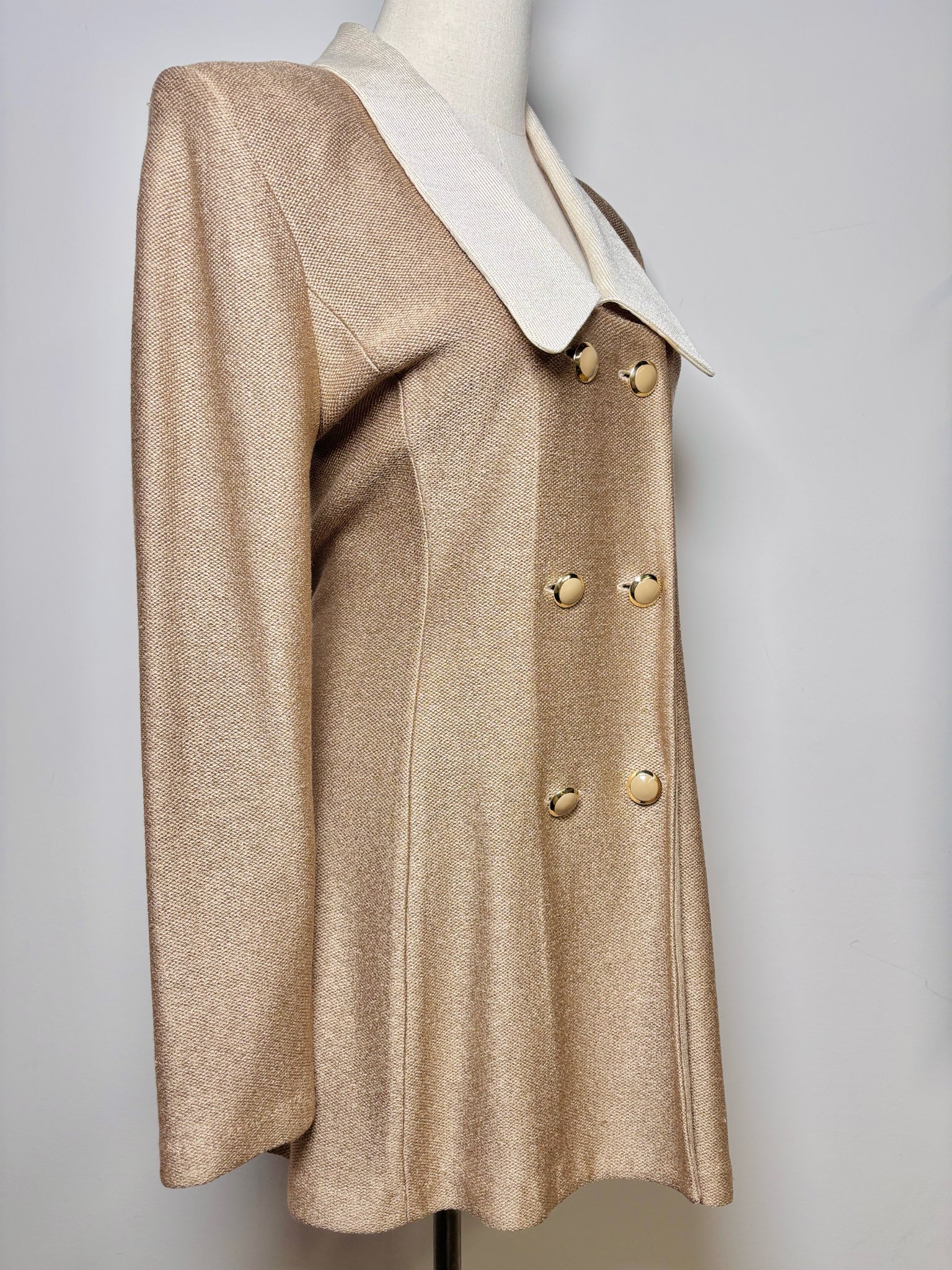 St. John beige wool knit pencil skirt double breasted long jacket with white lapels and gold buttons. Small snag and orange mark blemish. Pre-owned.