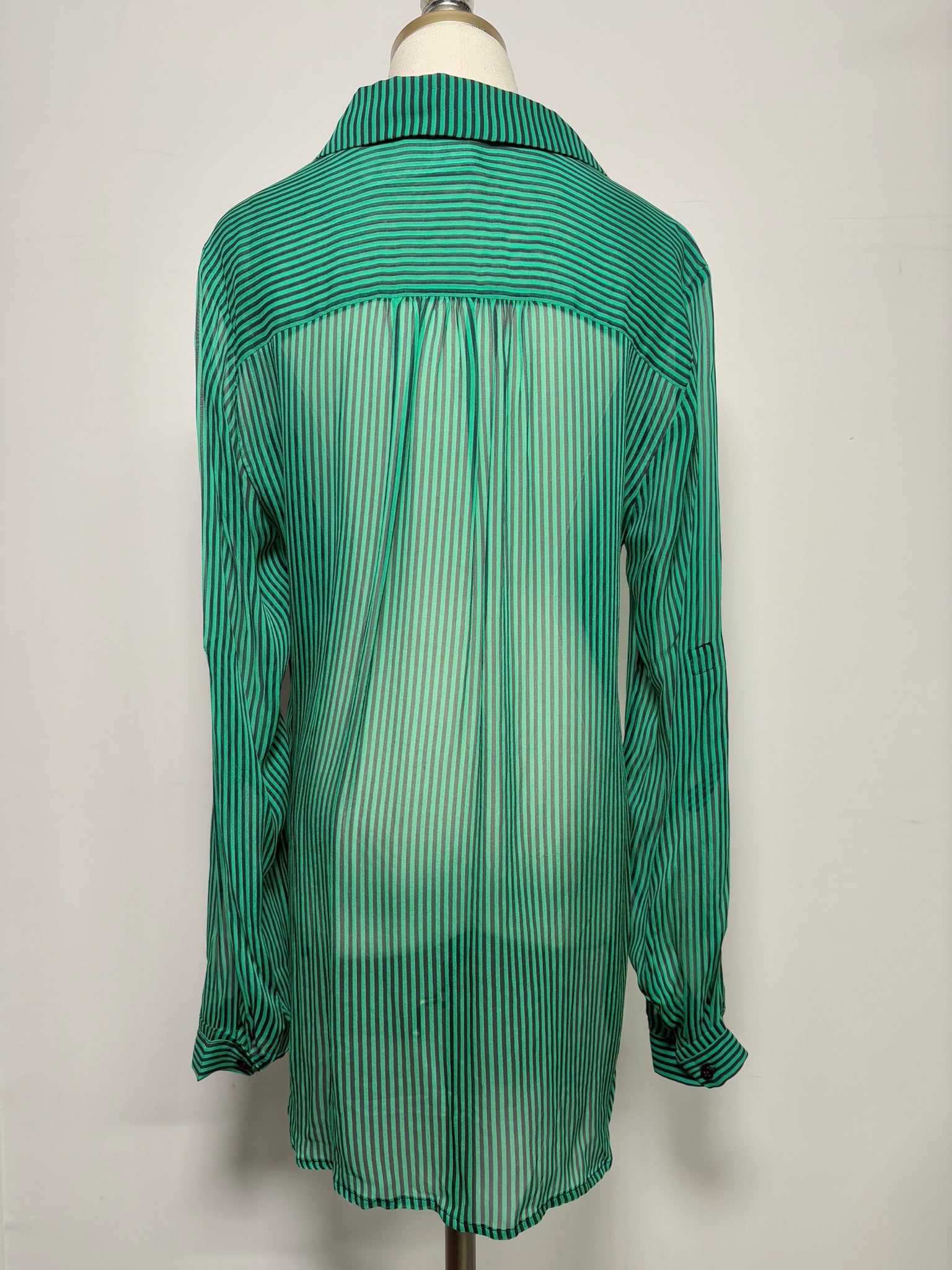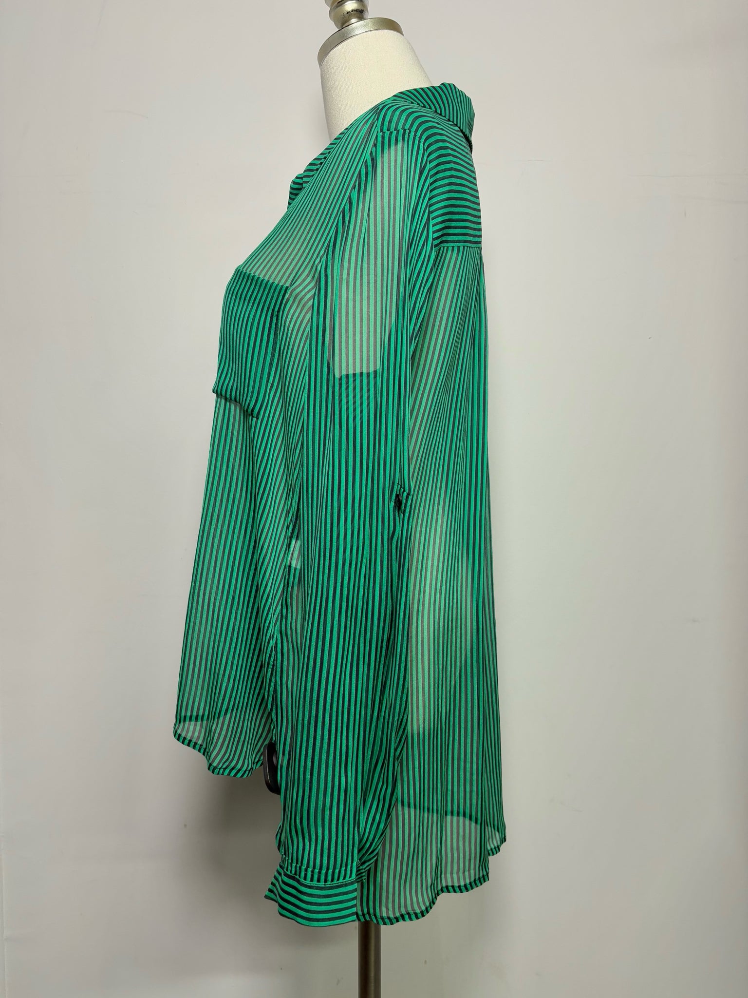 Elegant and airy, this Diane von Furstenberg blouse features a sheer silk construction with bold green and black stripes. Finished with a classic button-down front, it’s a sophisticated statement piece in size 14.