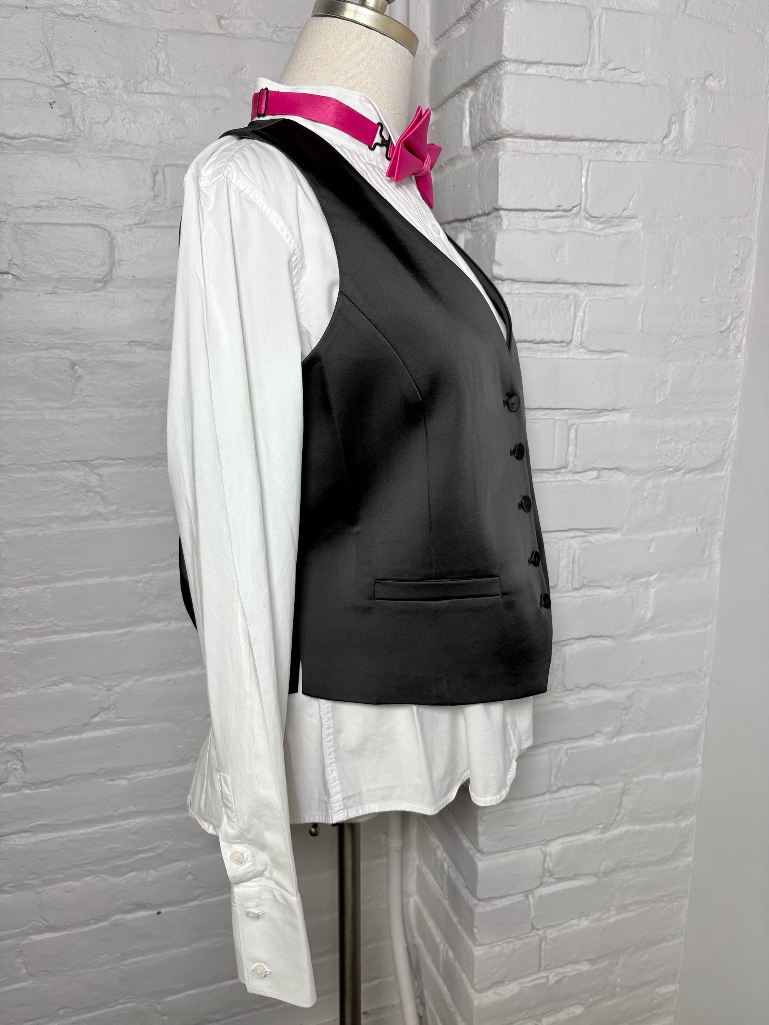 A modern interpretation of classic formalwear, this LBT Little Black Tuxedo seven-piece set in a size 14 exudes refined sophistication. The set includes a tailored blazer, coordinating vest, pintucked white shirt, two pocket squares in pink and salmon, and two complementary bowties—offering versatile styling for any formal occasion. Expert craftsmanship and attention to detail make this an effortlessly elegant ensemble. Can also be paired with the pants for a full set that is sold separately.