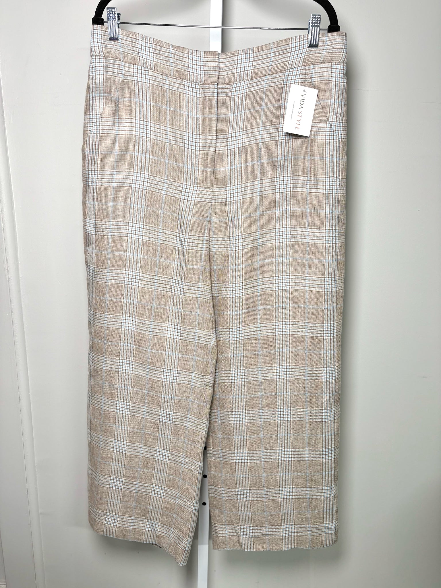 Veronica Beard khaki, sky blue, and cream plaid linen pants in a size 14. Comes new with tags.