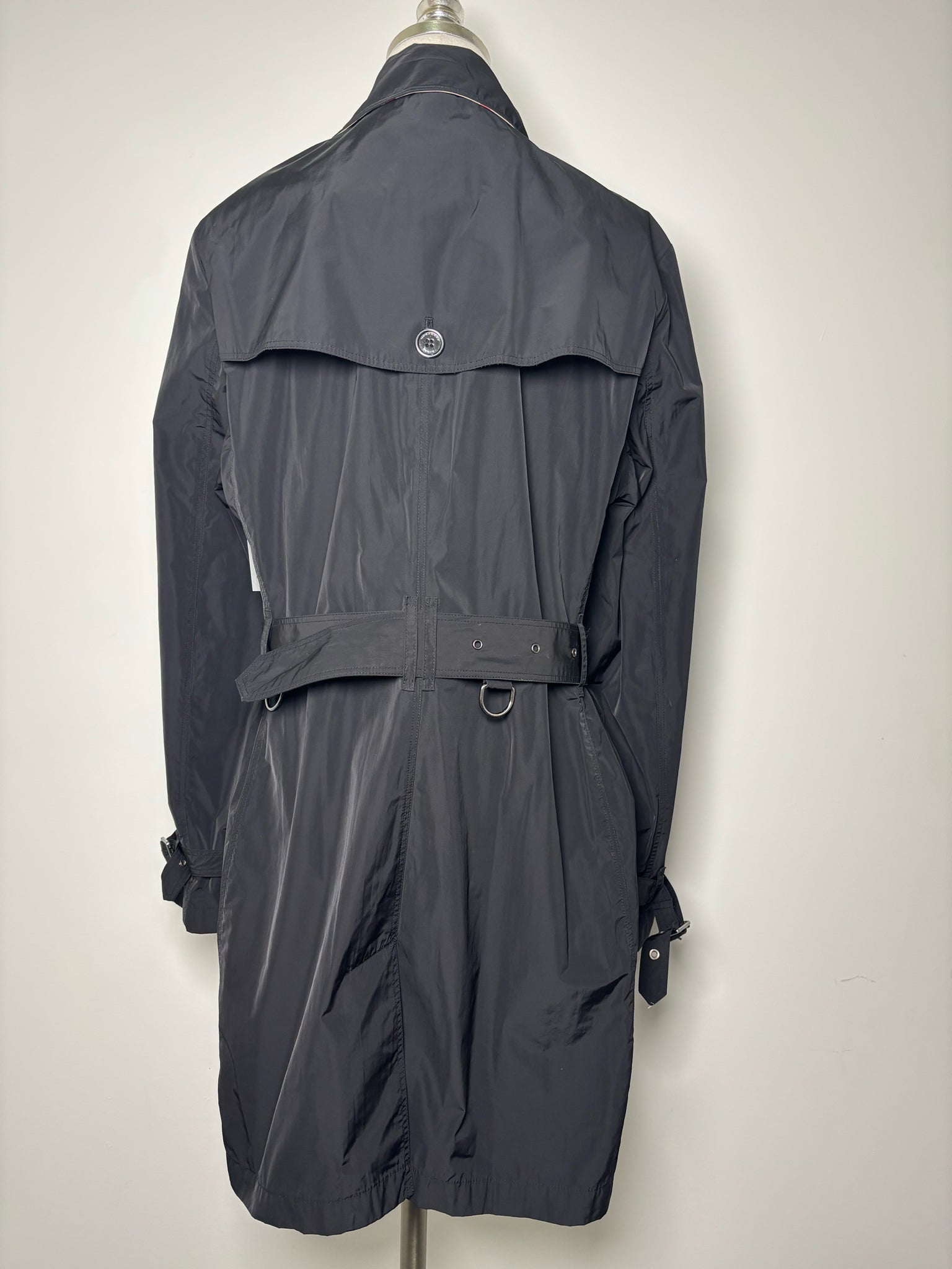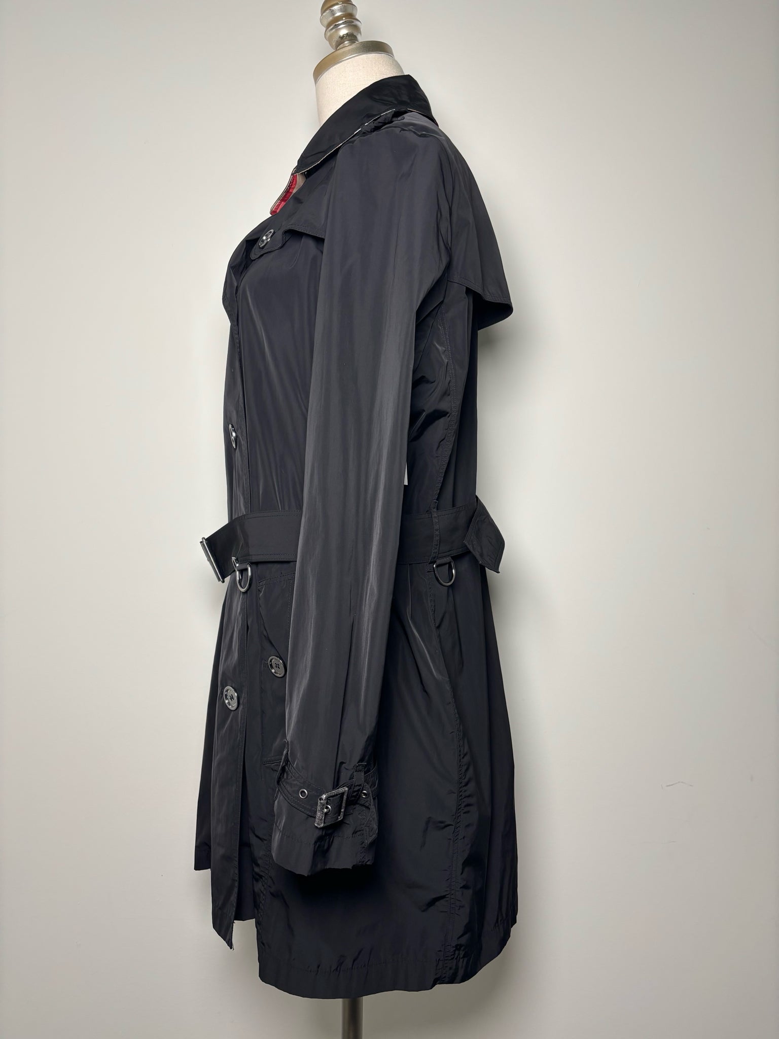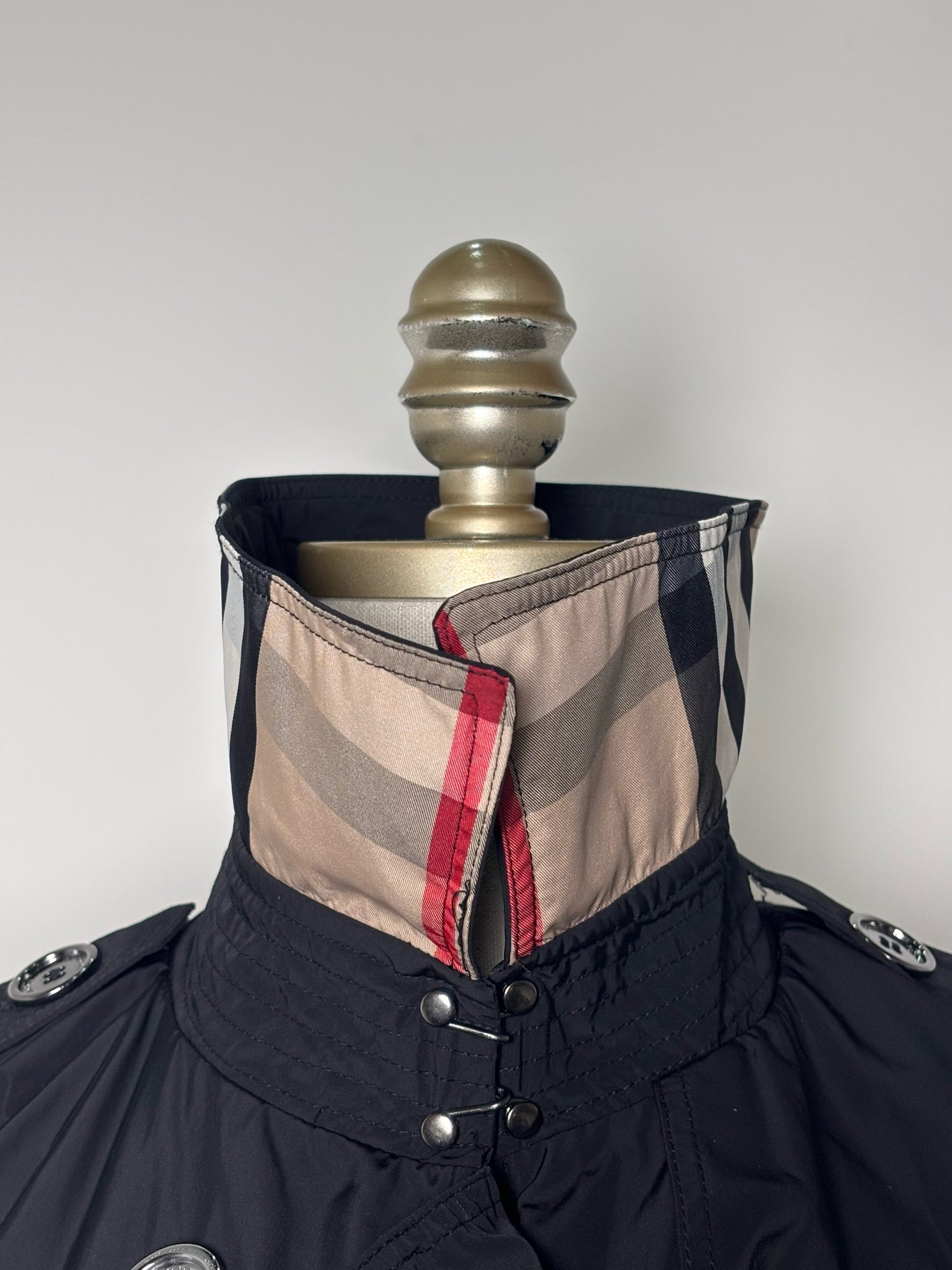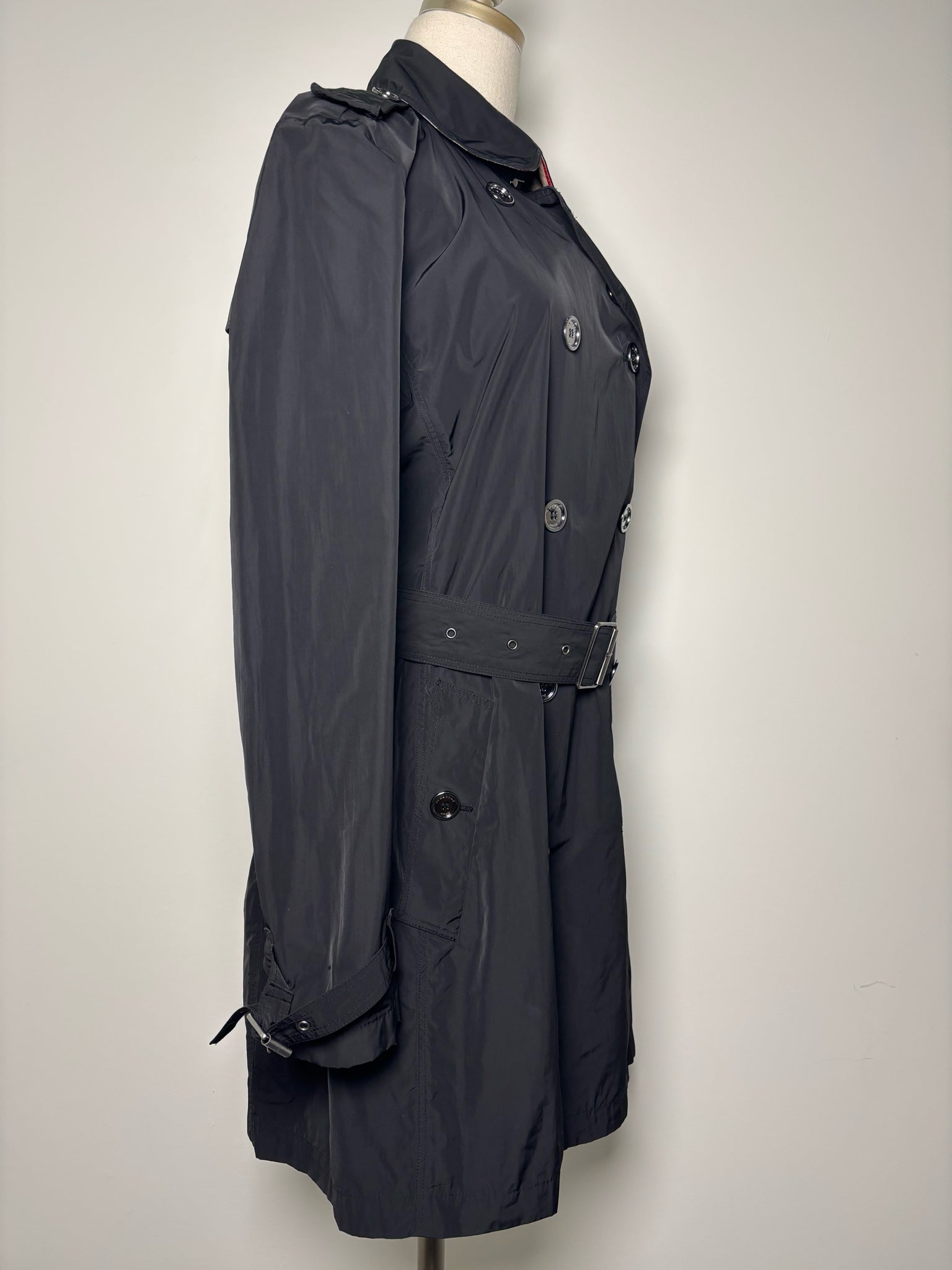 Burberry black double-breasted epaulettes trench coat with a matching belt and partial check lining in a size 16.