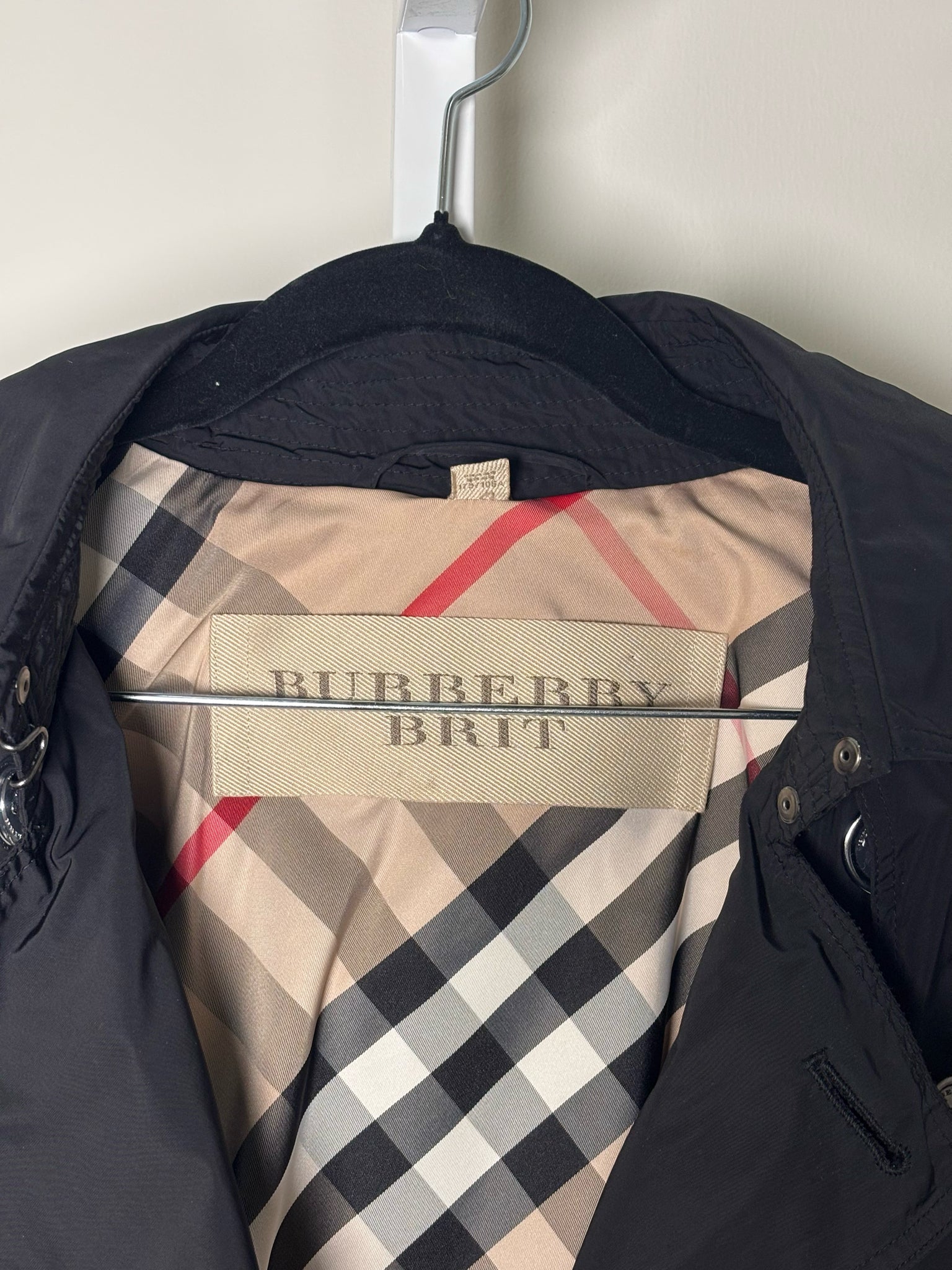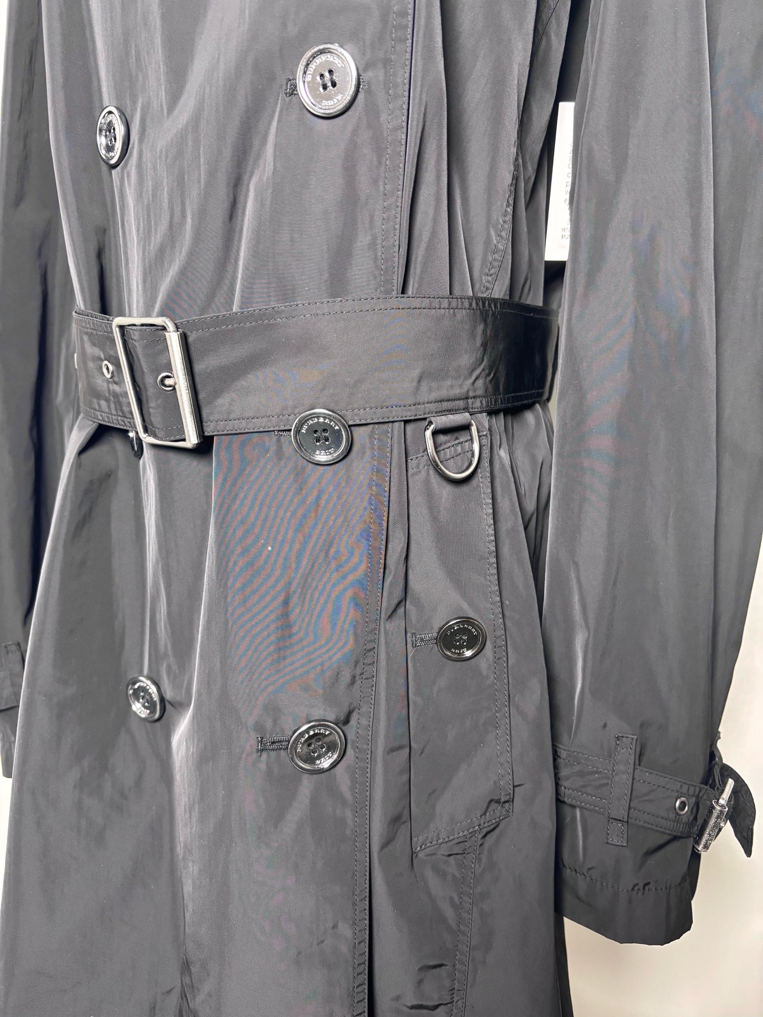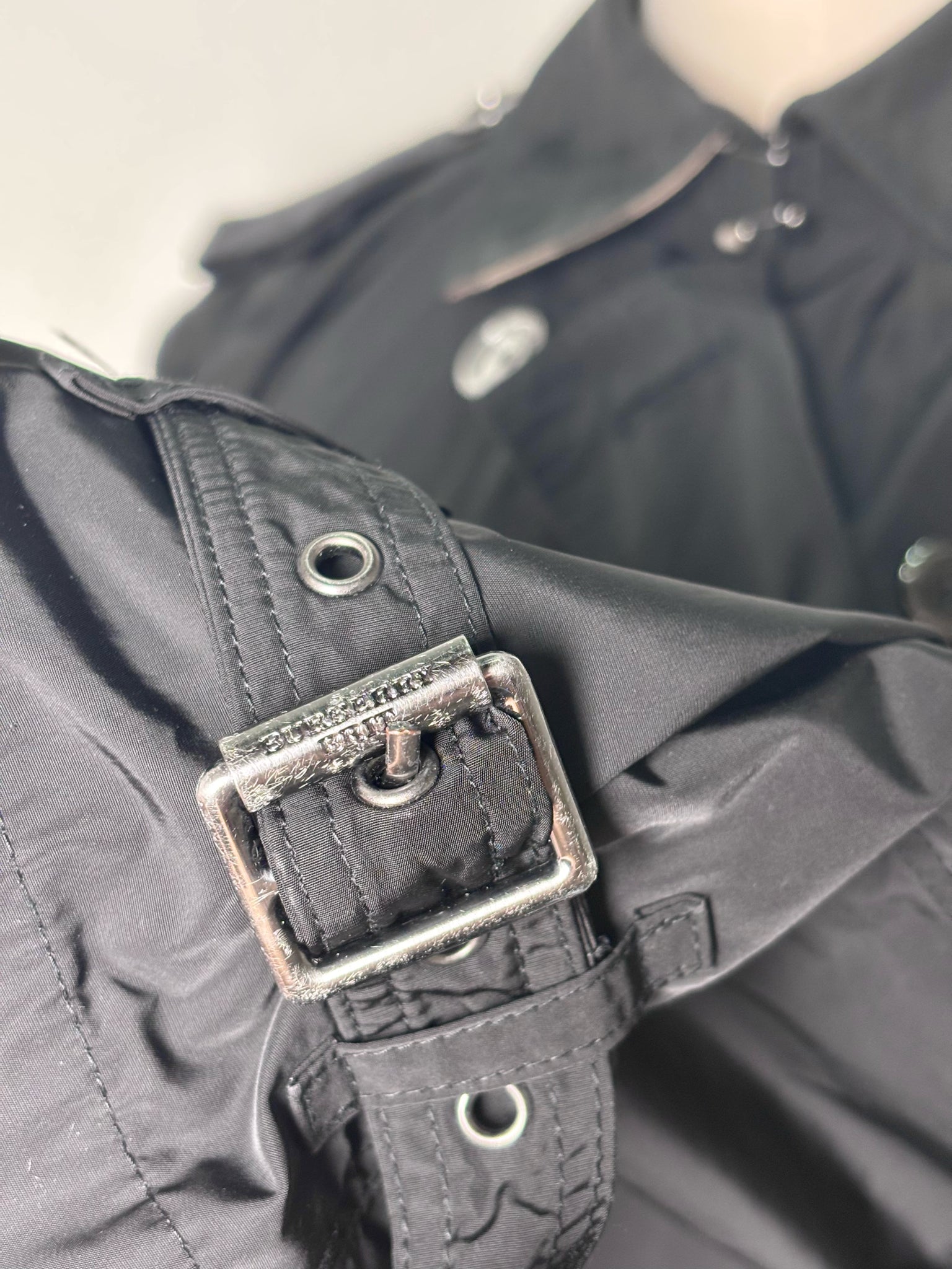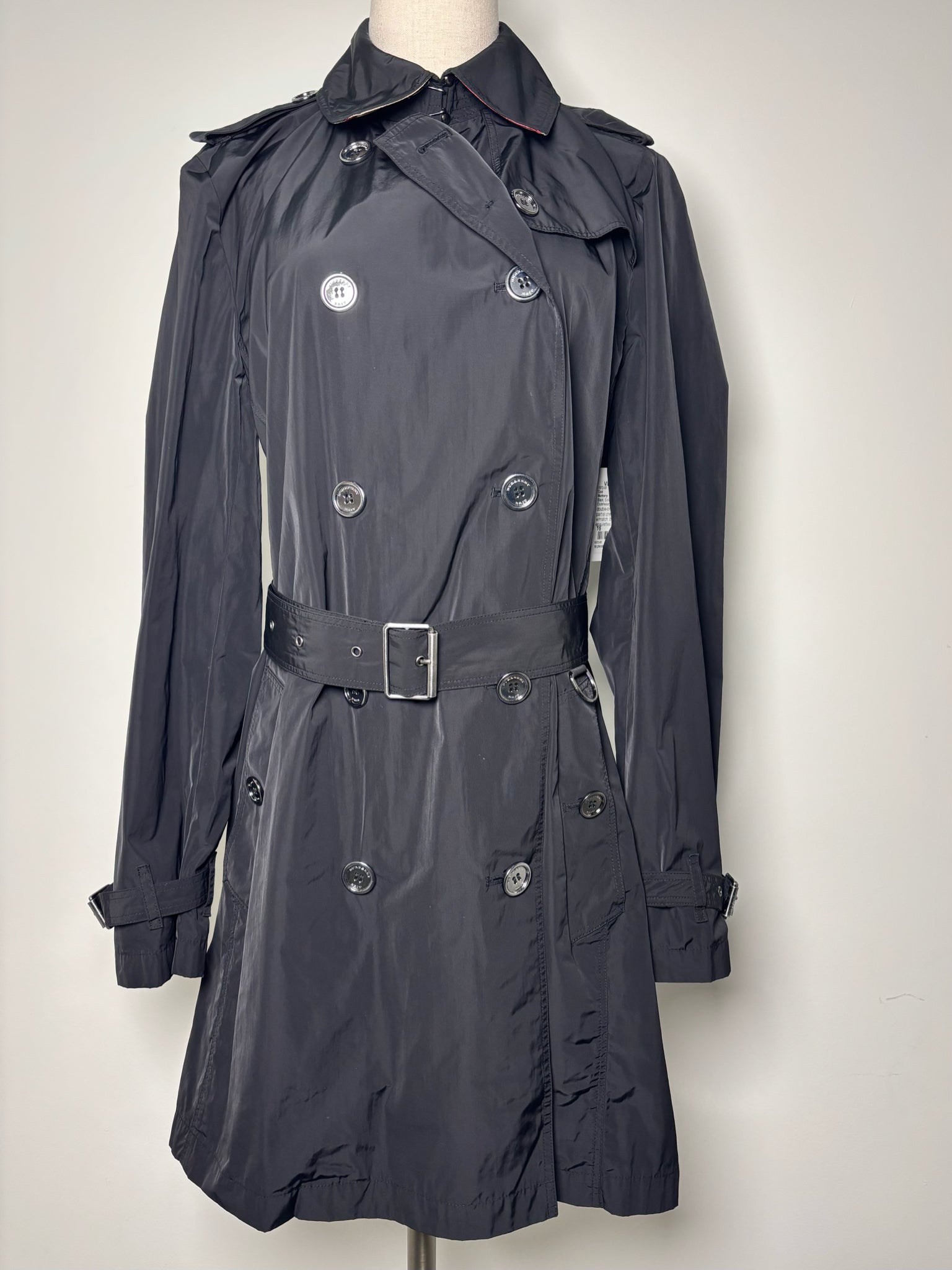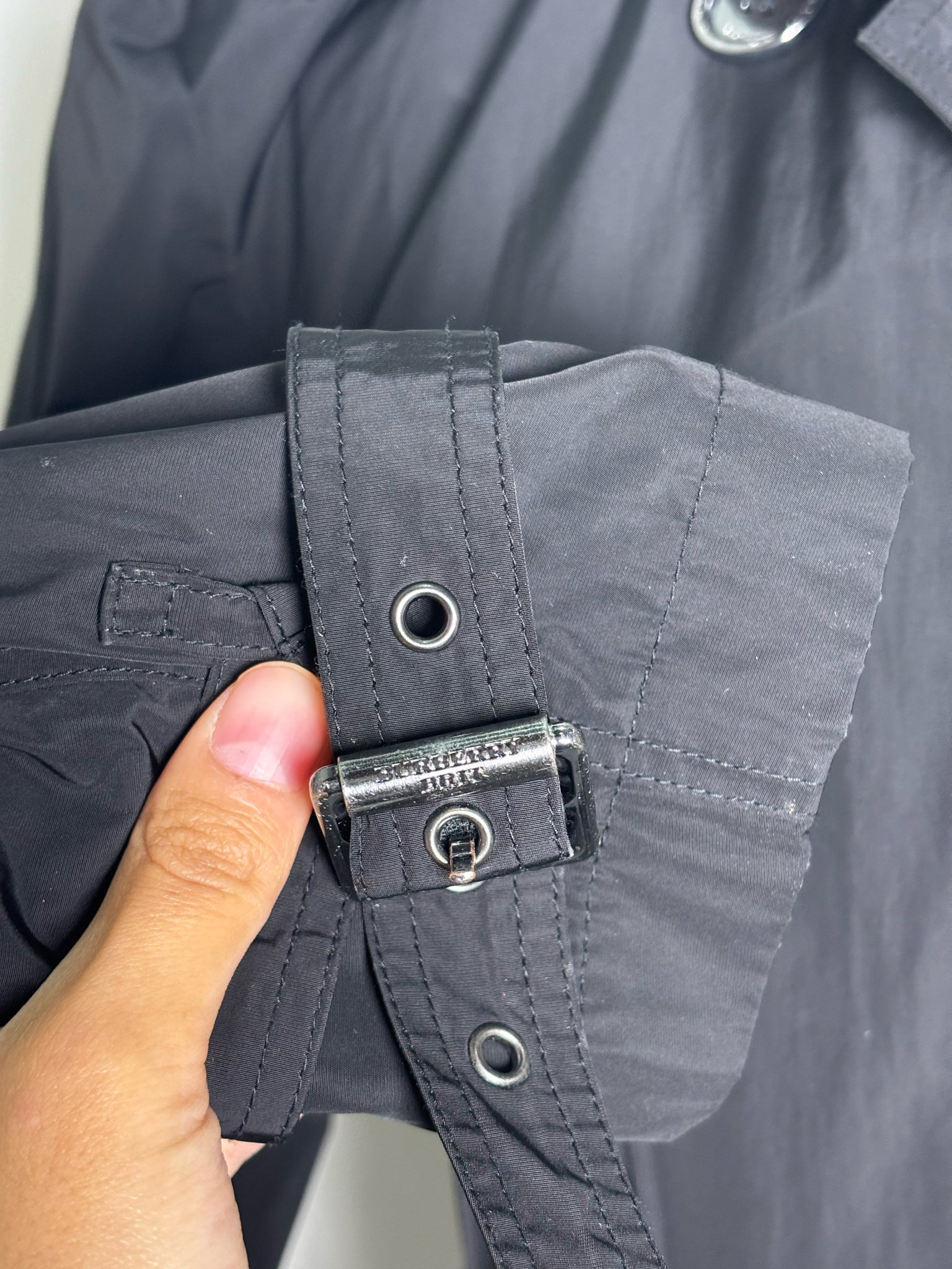 Burberry black double-breasted epaulettes trench coat with a matching belt and partial check lining in a size 16.