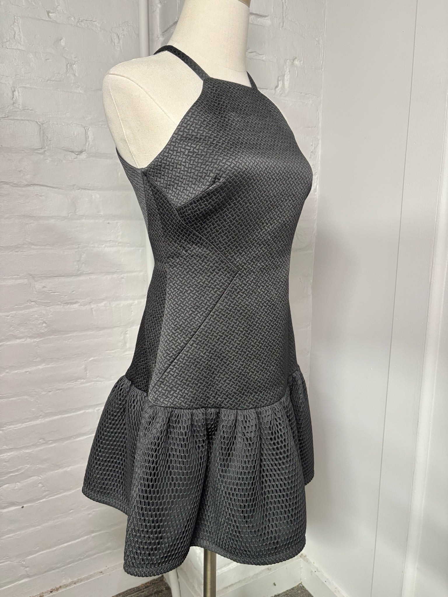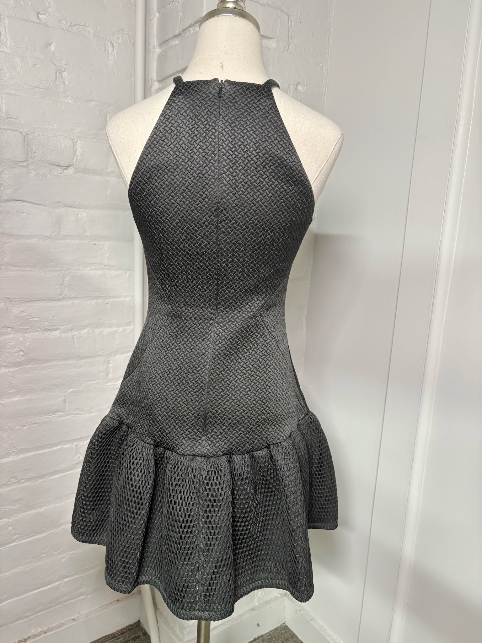 Cynthia Rowley black flirty special occasion fitted mini dress with texture and ruffle hem in a size 2.