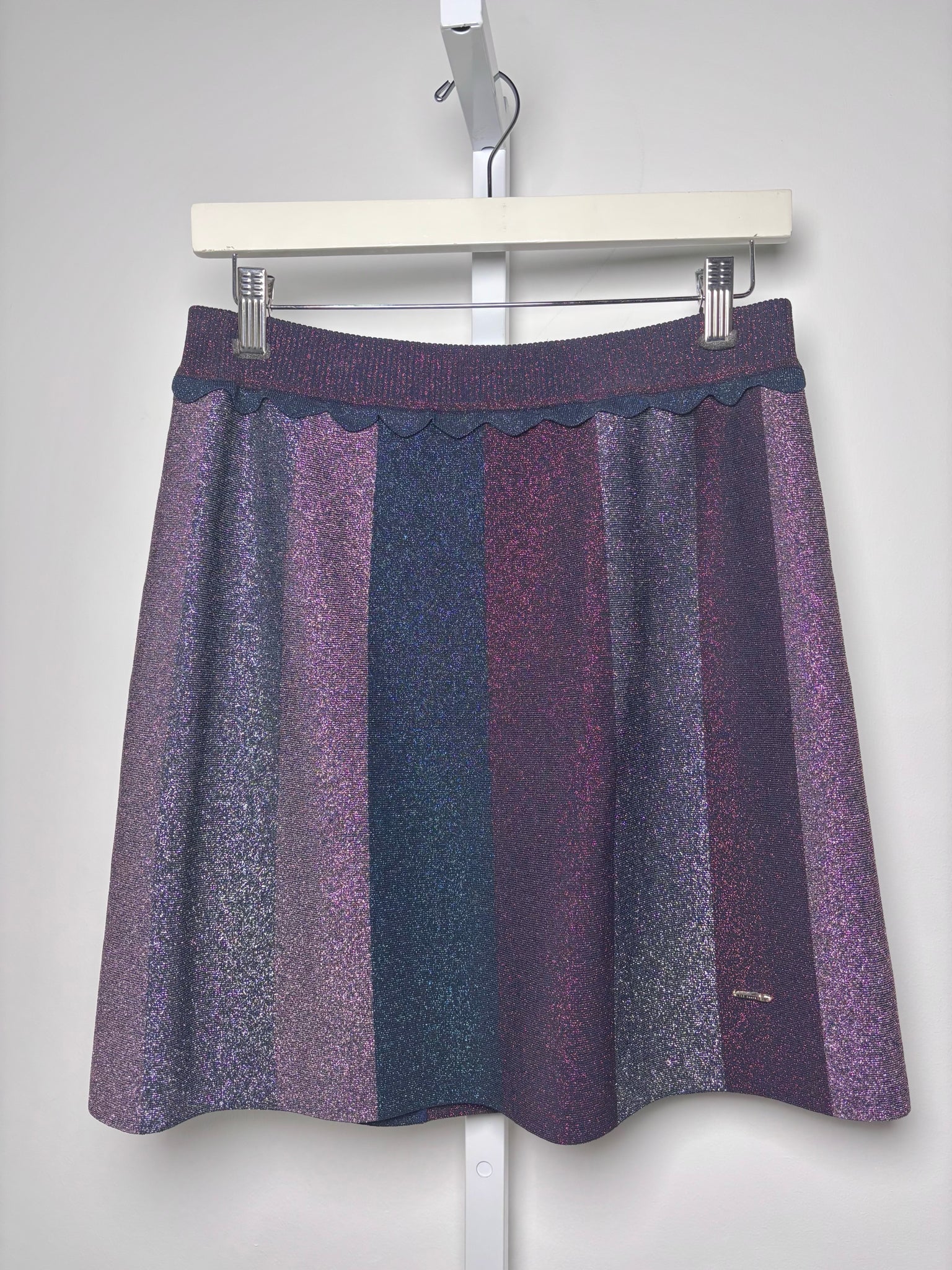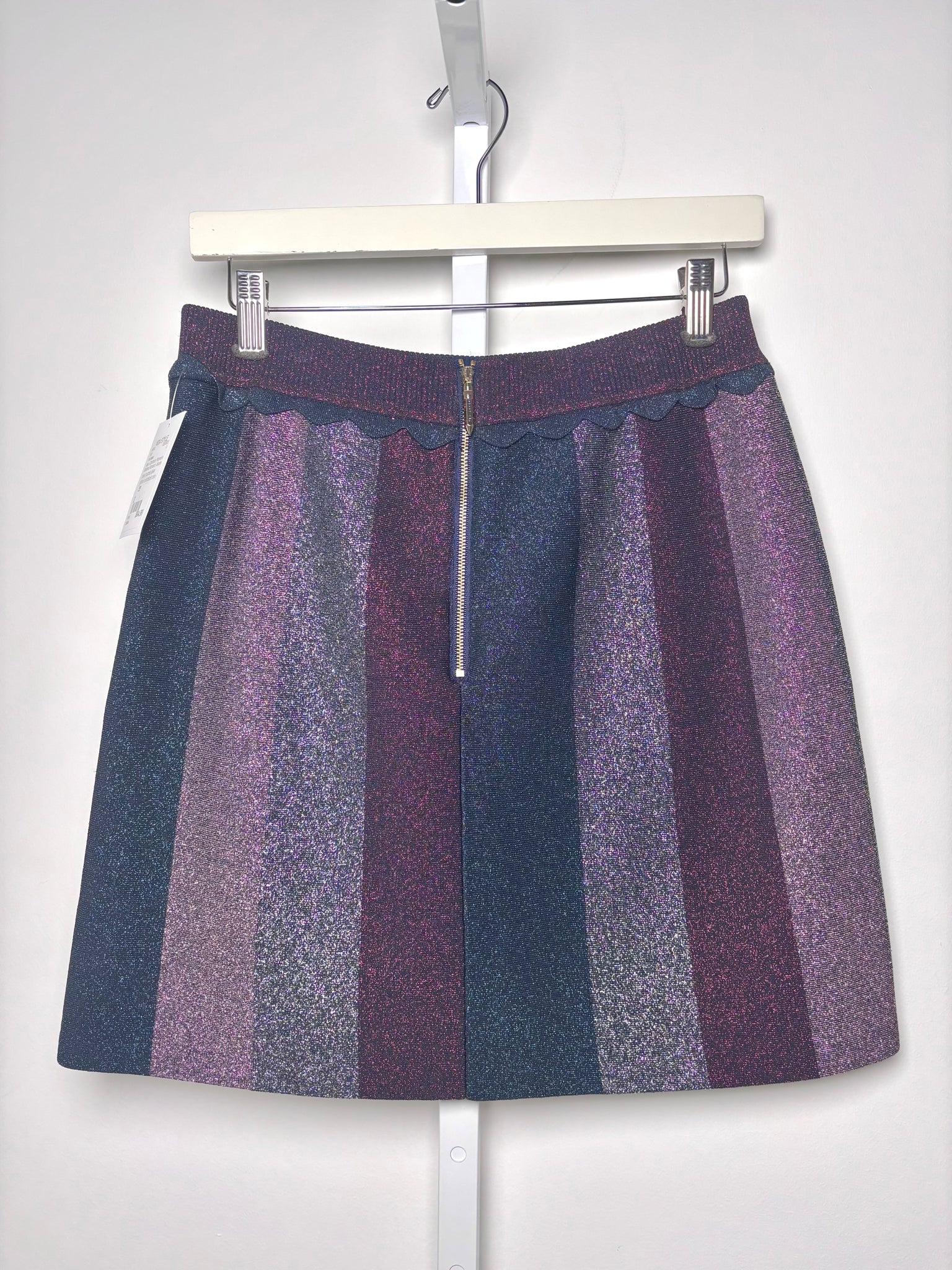 Ted Baker navy, purple and silver glitter colorblock mini skirt with a back zipper in a size 2. Pre-owned.