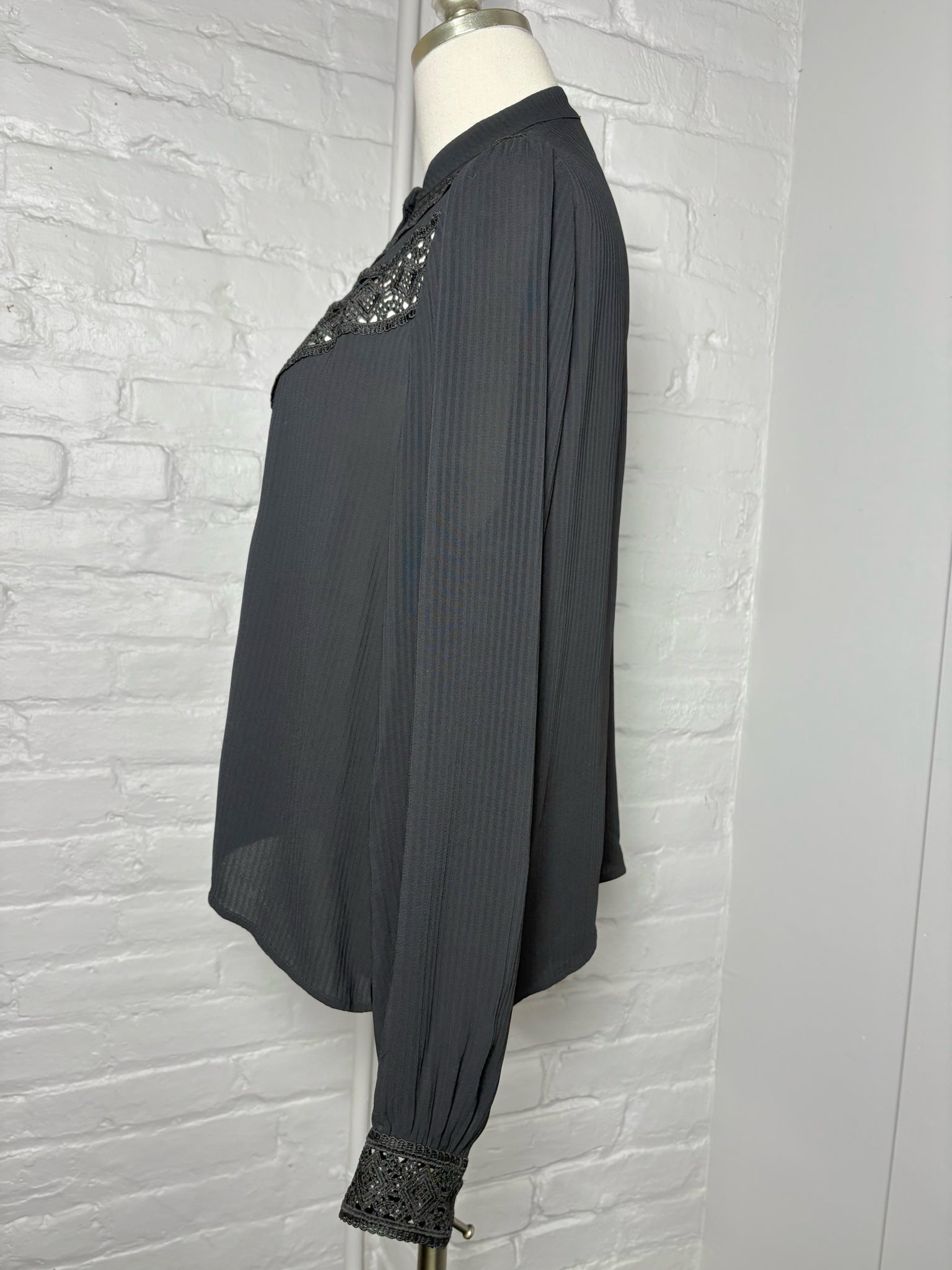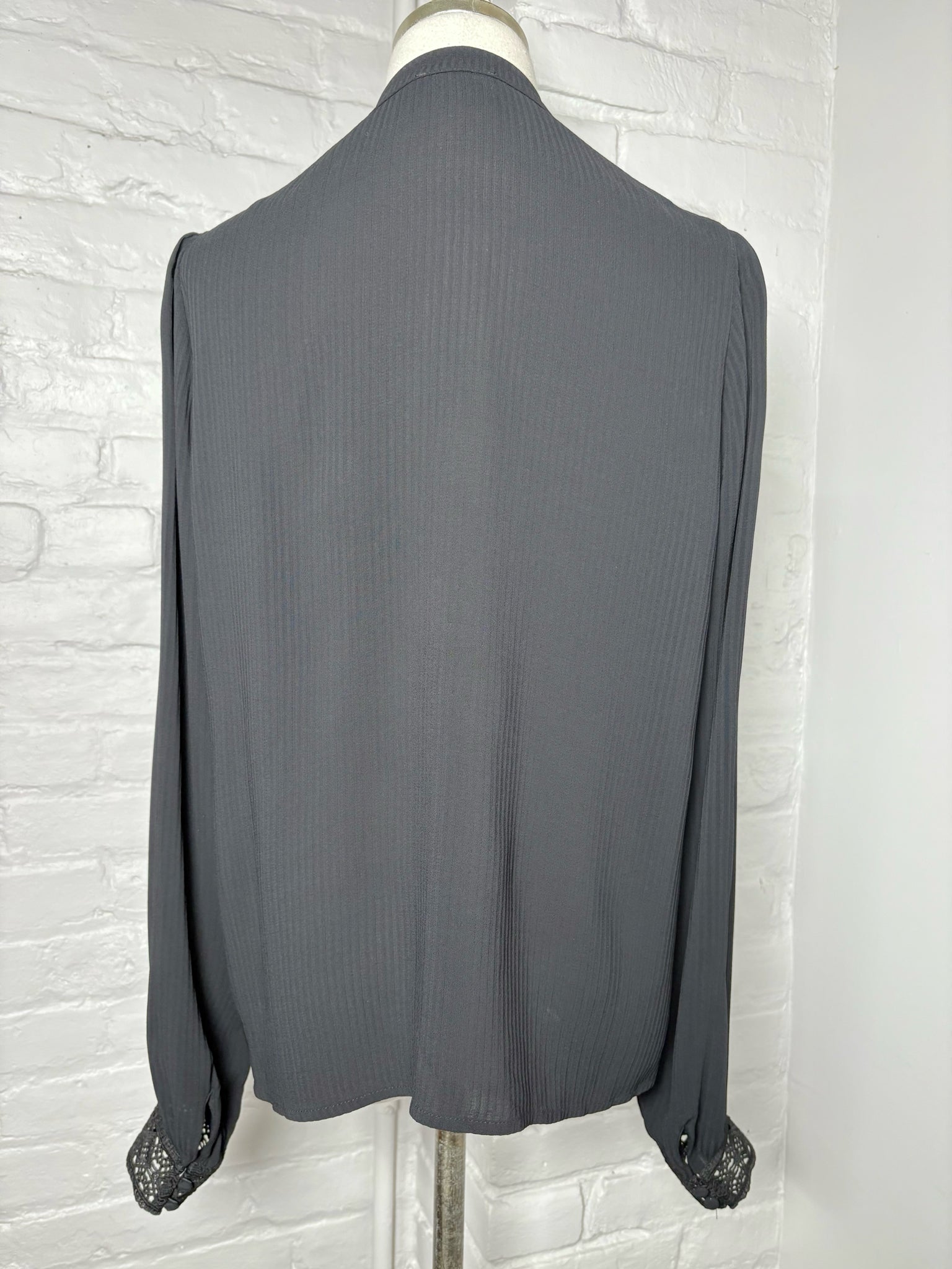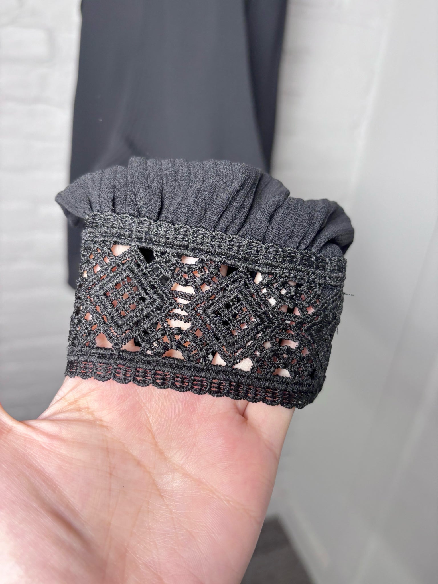 Sezane black "Jazz" long sleeve button down blouse with lace cuffs and lace v-front detailing in a size 2.