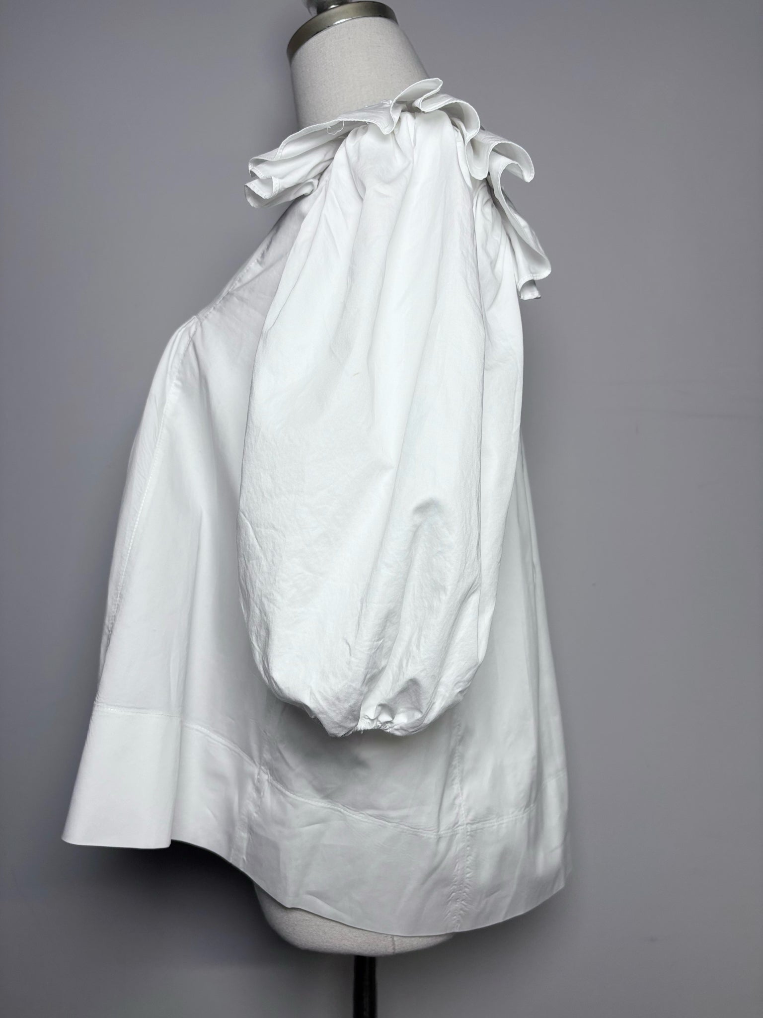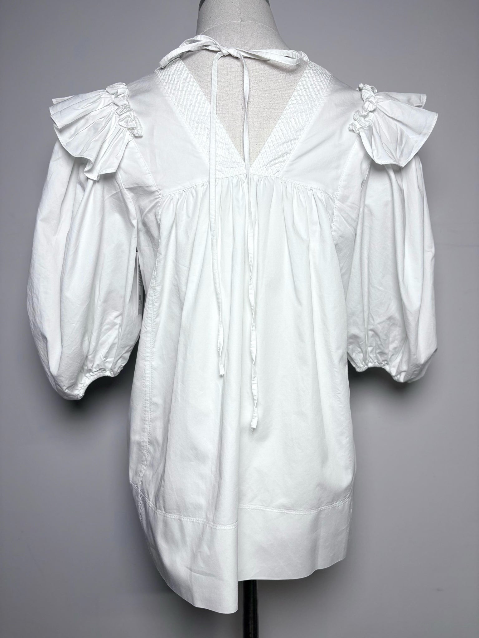 This Von Siga long top is expertly crafted from 100% white-on-white striped cotton, offering a crisp yet flowy silhouette in a Women’s Size 36. Defined by its romantic puff short sleeves and delicate shoulder ruffles, the design is finished with a refined V-neckline and a graceful tie detail at the back, epitomizing effortless summer elegance.