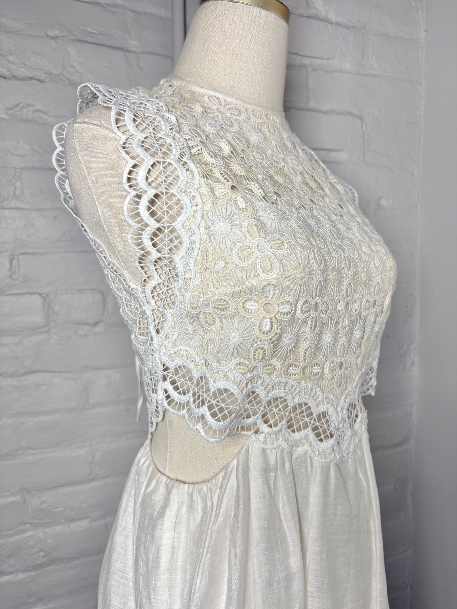Sandro white and cream crochet open back linen dress in a size 4. Comes new with tags.