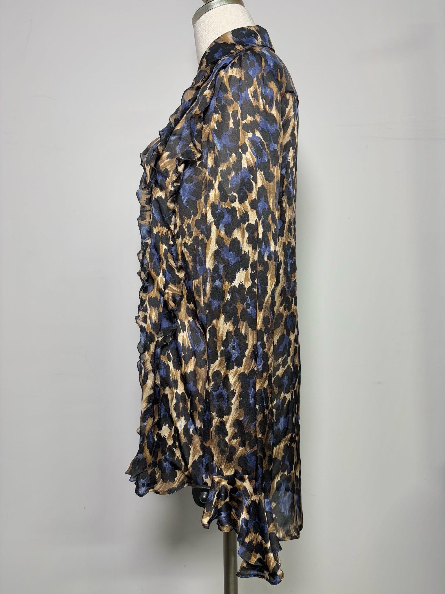 Delicate and expressive, this Blumarine silk blouse features a black, khaki, and blue abstract print with ruffled detailing and long sleeves. Finished with a button-down front, it embodies the brand’s signature feminine sophistication in size 38 (US 2).