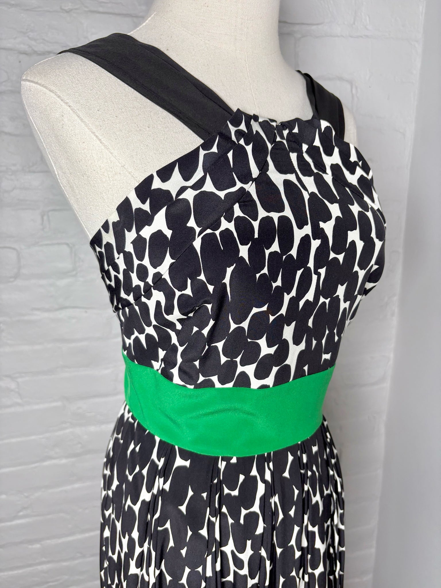 Gucci Black, Green & White Geometric Dot Halter Dress, Size 2 — A chic A-line silhouette featuring a bold geometric dot pattern, this knee-length design is finished with a striking Kelly Green waistband for a defined shape. Effortlessly blending playful print with refined tailoring, it embodies Gucci’s modern elegance.