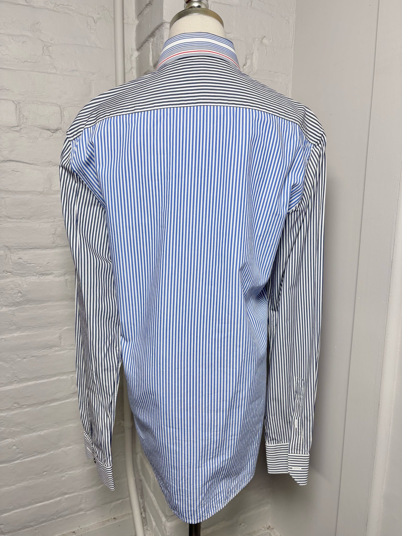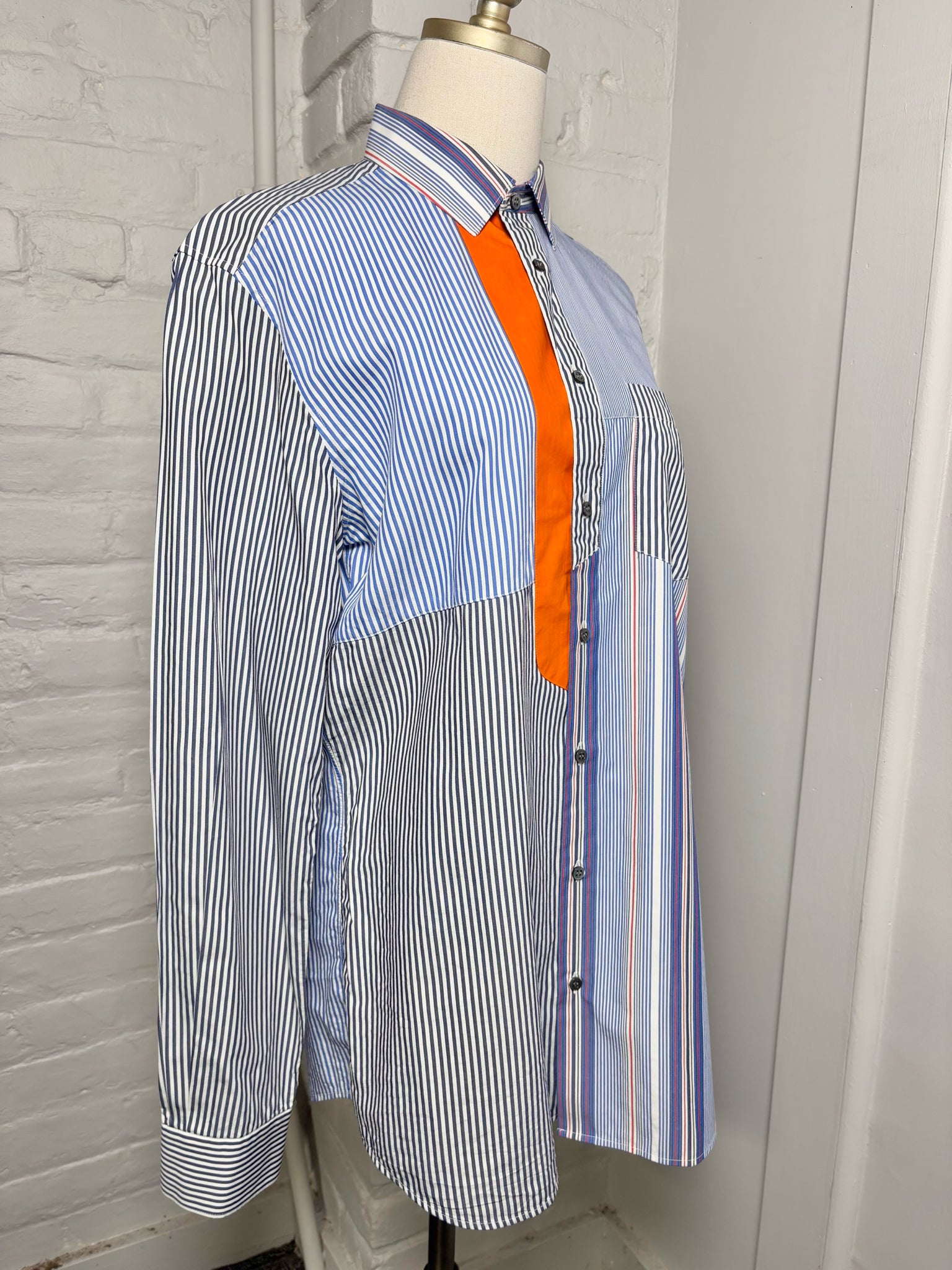 Joseph blue, white and orange striped button down long sleeves shirt with thick orange panel in a size large.