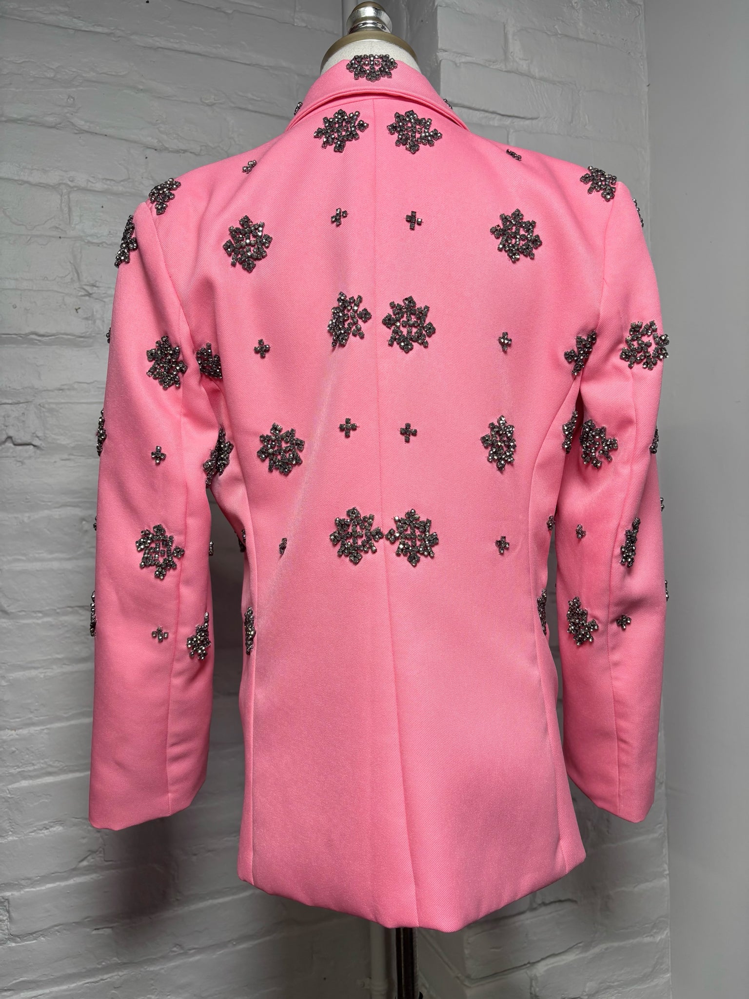 L'Agence pink crystal encrusted snowflakes front and back fully lined tuxedo blazer. Small blemish on the front pocket, priced as-is.