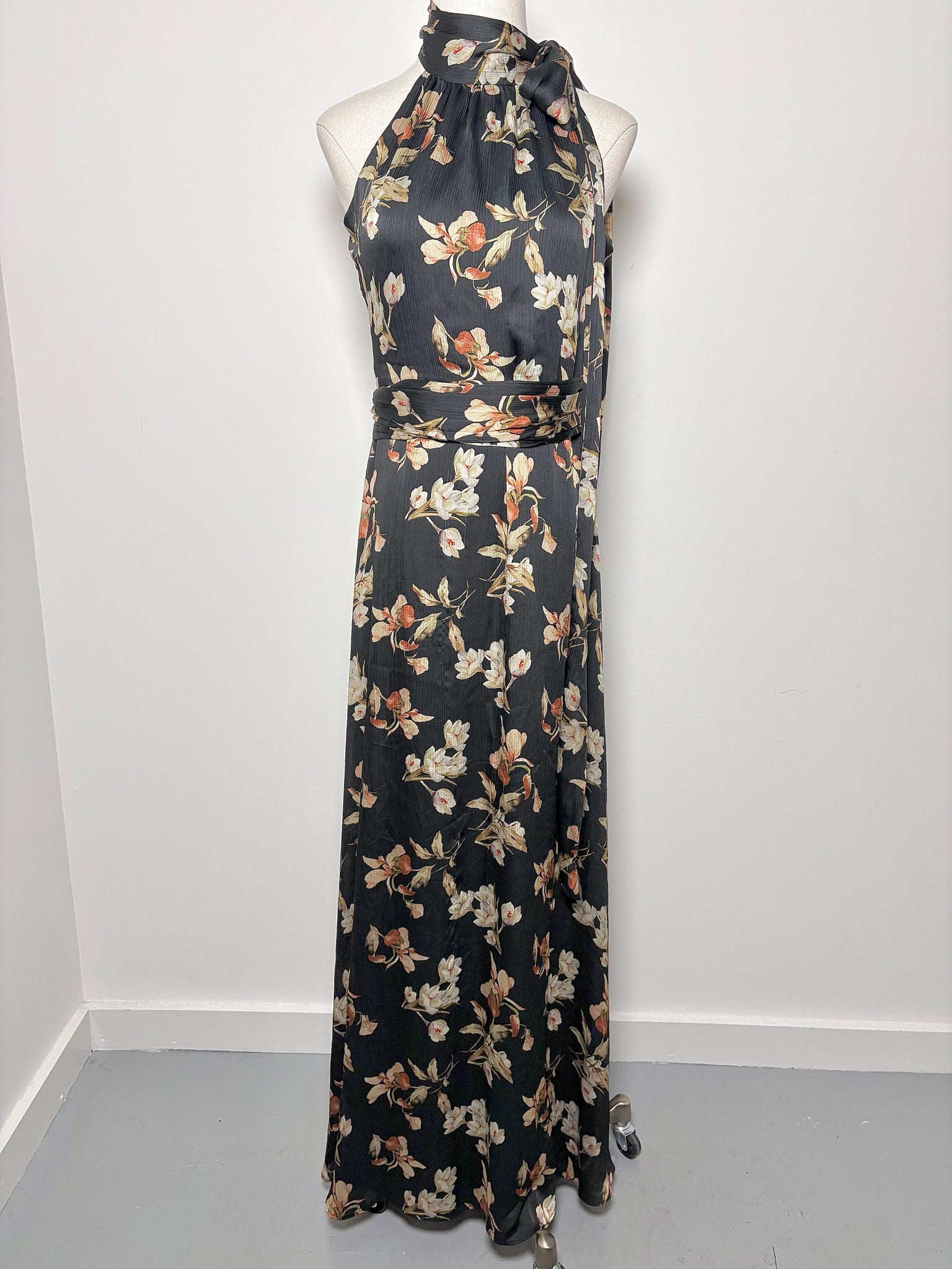 Elegant and vibrant, this Sachin + Babi long halter dress in Size 4 showcases a bold black, green, brown, and yellow floral pattern with a side slit for added movement. Finished with a side zipper for a sleek fit. Pre-owned in excellent condition.