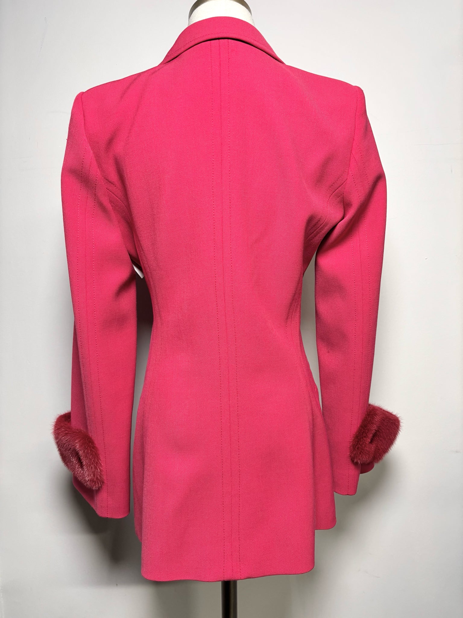 Fendi pink double-breasted sweater in a size 4, crafted with luxurious detailing for a refined statement. Featuring fur trim accents and contrasting black buttons, this piece blends playful elegance with signature Italian sophistication. New with tags.