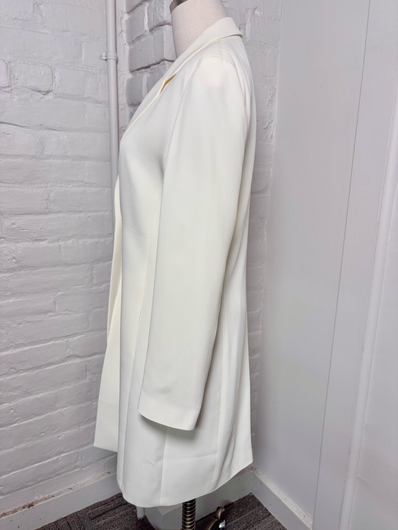 Emporio Armani cream long tuxedo jacket featuring a sleek single-button closure, fully lined interior, and a clean, pocket-free silhouette. Tailored in a size 6, this polished piece offers modern sophistication and can be paired with matching pants (sold separately). There is a small blemish on the collar, priced as-is.