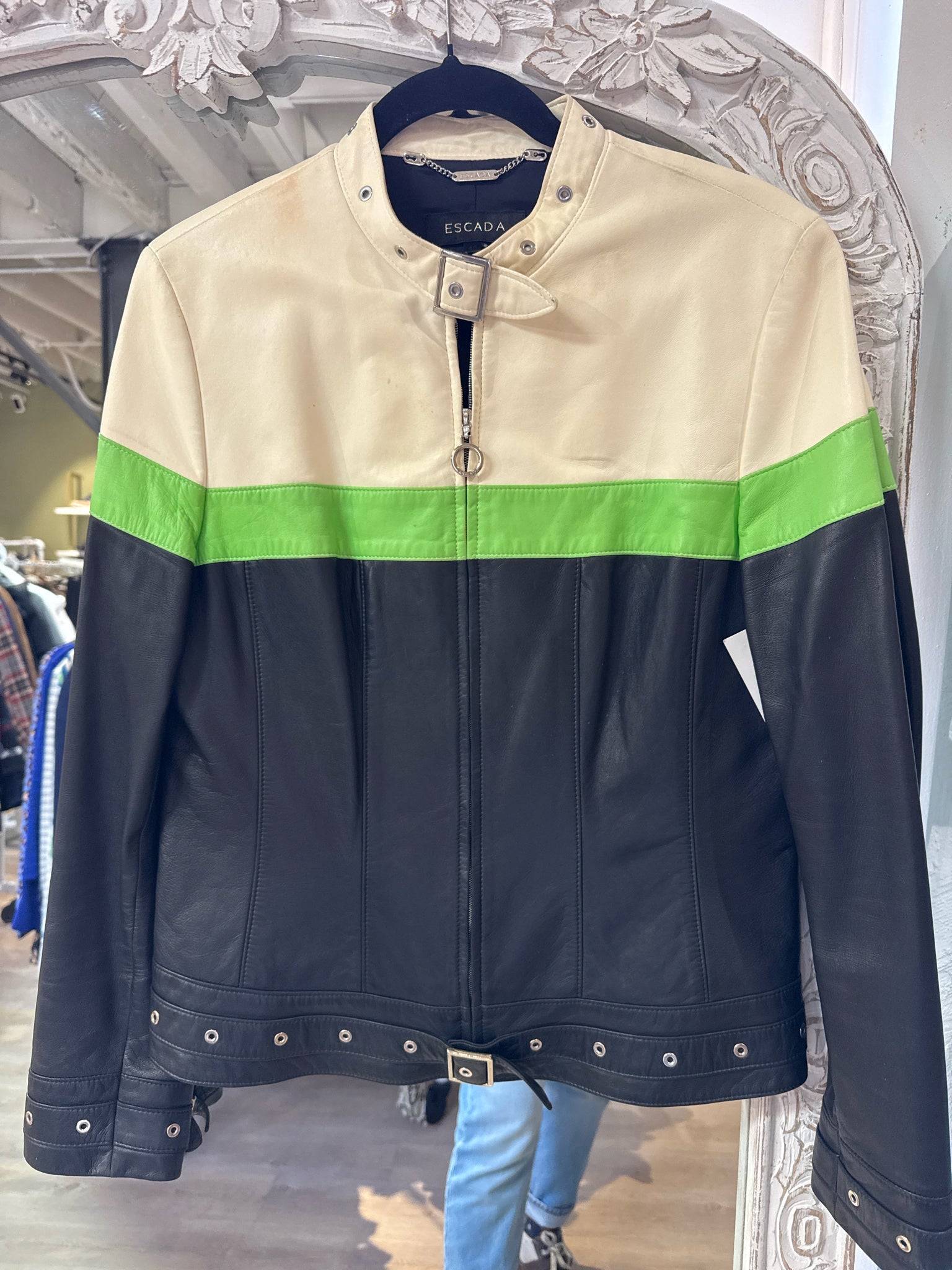 Crafted from buttery-soft nappa leather, this vintage jacket showcases Escada’s expert tailoring and attention to detail. The rich black leather base is elevated with green and cream color-block accents, creating a sophisticated yet fashion-forward contrast that feels both classic and distinctive. The jacket is accented with an adjustable belt at the hemline and is fully lined.