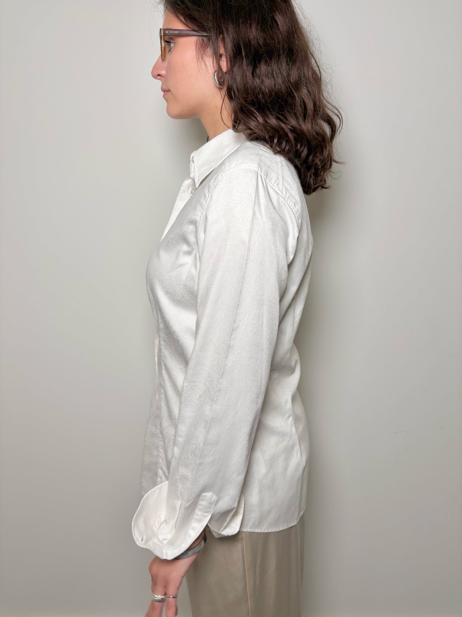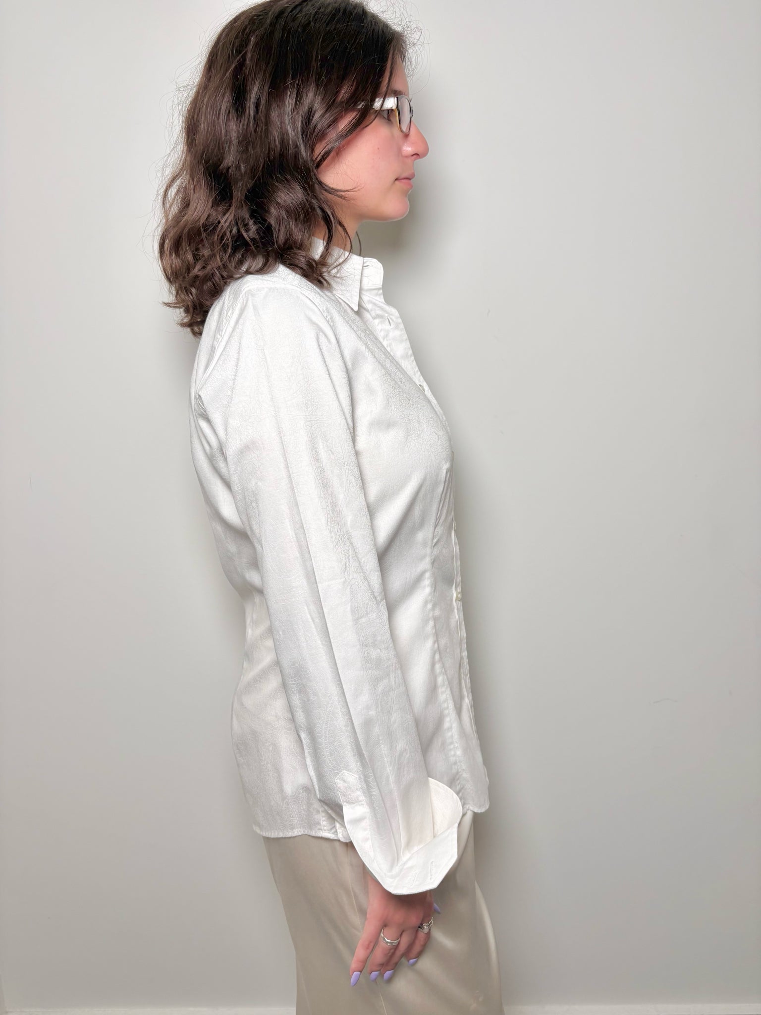 Etro white paisley long sleeve button-down shirt (Size US 12) features a subtle tonal print in the brand’s signature motif. Crafted with premium materials and tailored for a flattering silhouette, it’s a versatile wardrobe staple ideal for both casual and elevated looks. Gently pre-owned and in excellent condition.