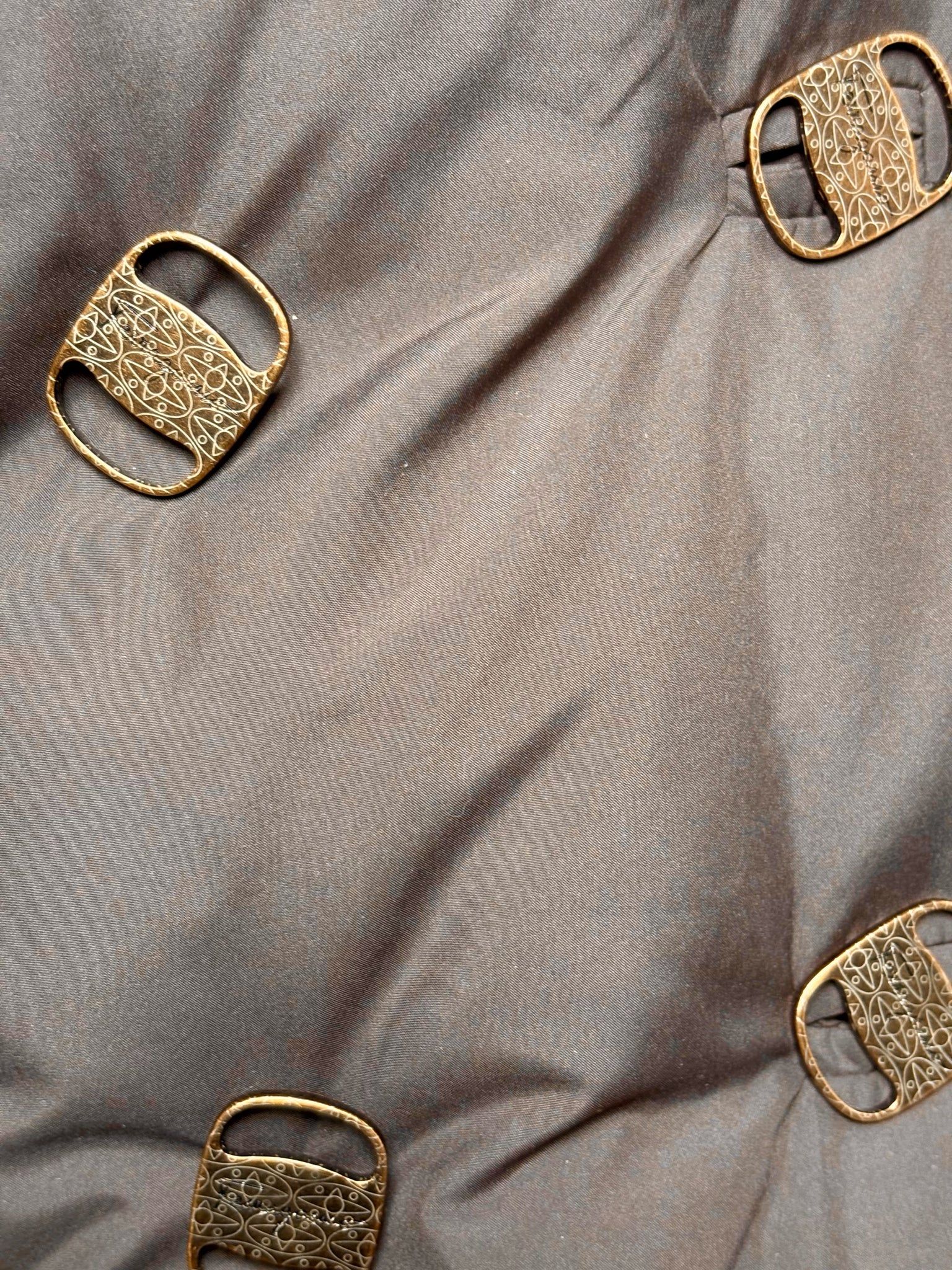 Salvatore Ferragamo Brown Goose Down Puffer Jacket — A refined take on cold-weather outerwear, this down-filled jacket features a rich brown hue with a smocked neckline and a double-breasted front for a polished silhouette. Expertly crafted for warmth and style, it’s finished with subtle tailoring details and a lightweight, insulating design. It comes in a size small.